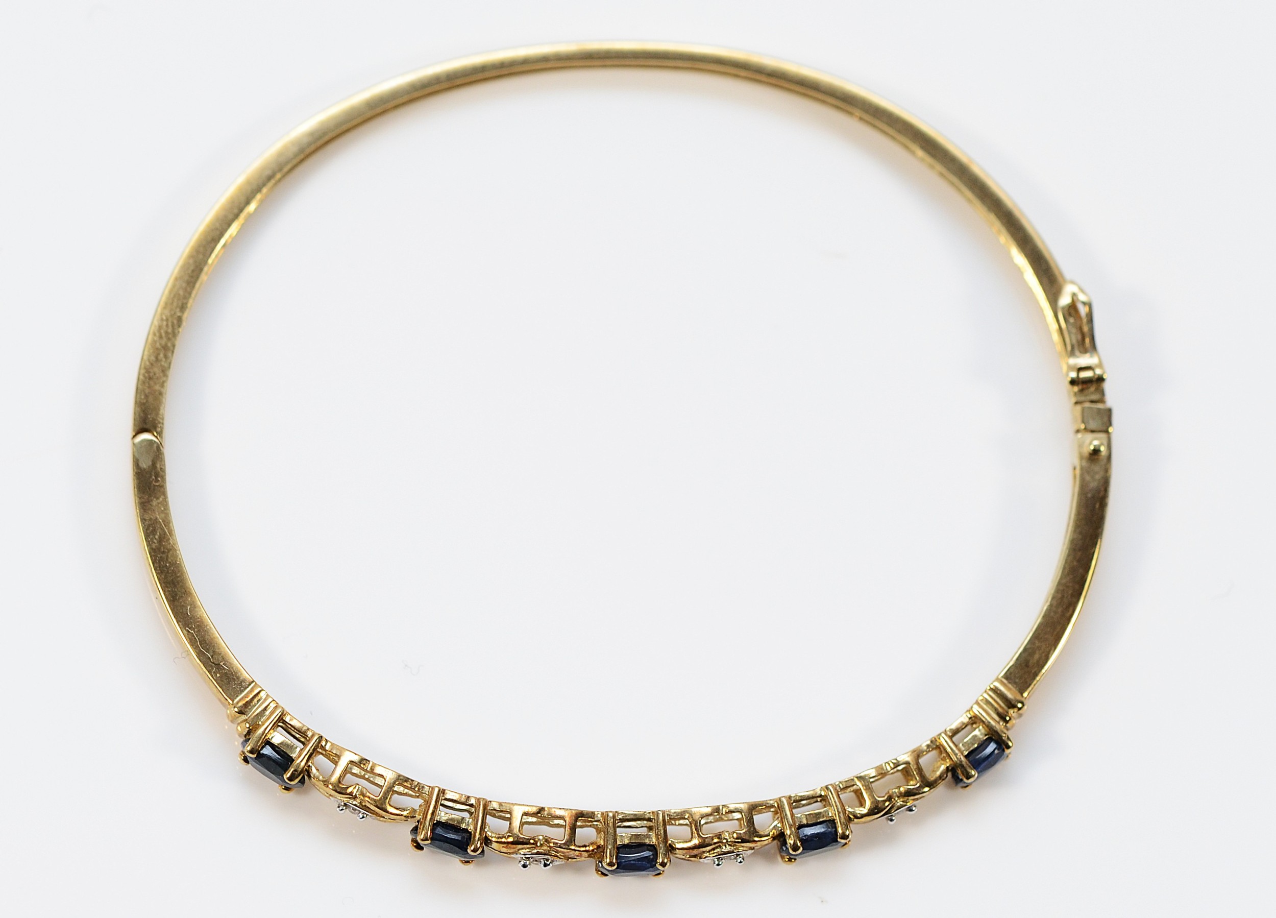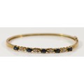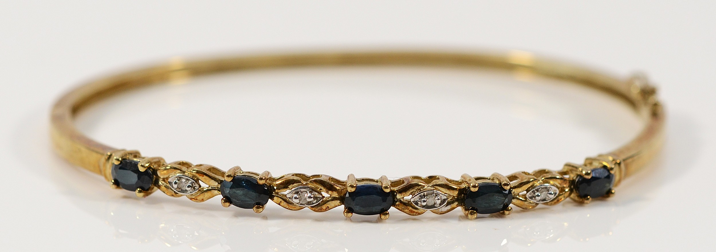 A 9ct gold sapphire and diamond hinged bangle, 60mm, 7.8g