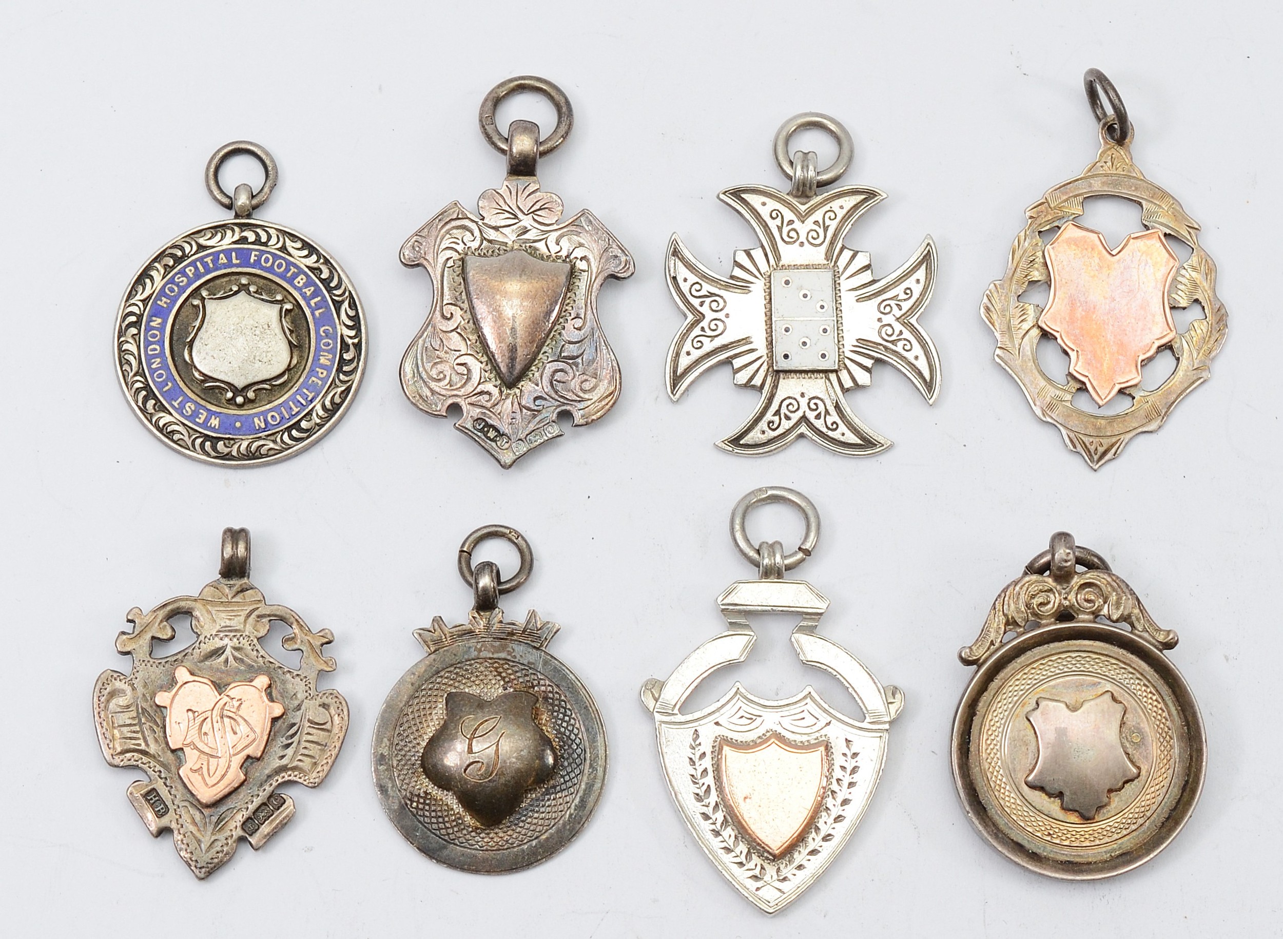 Eight various silver watch fobs and medals, various dates, 51gm.
