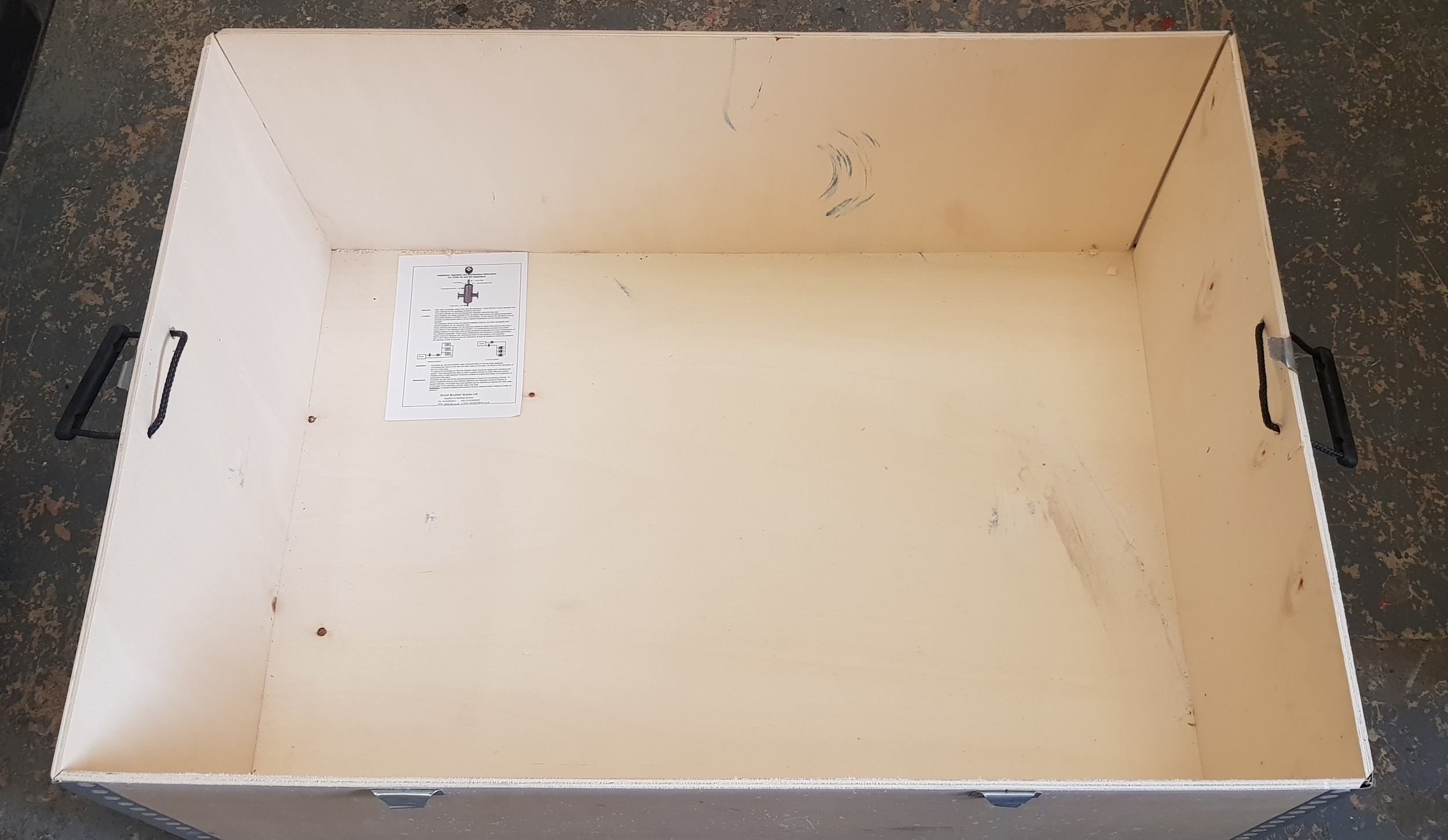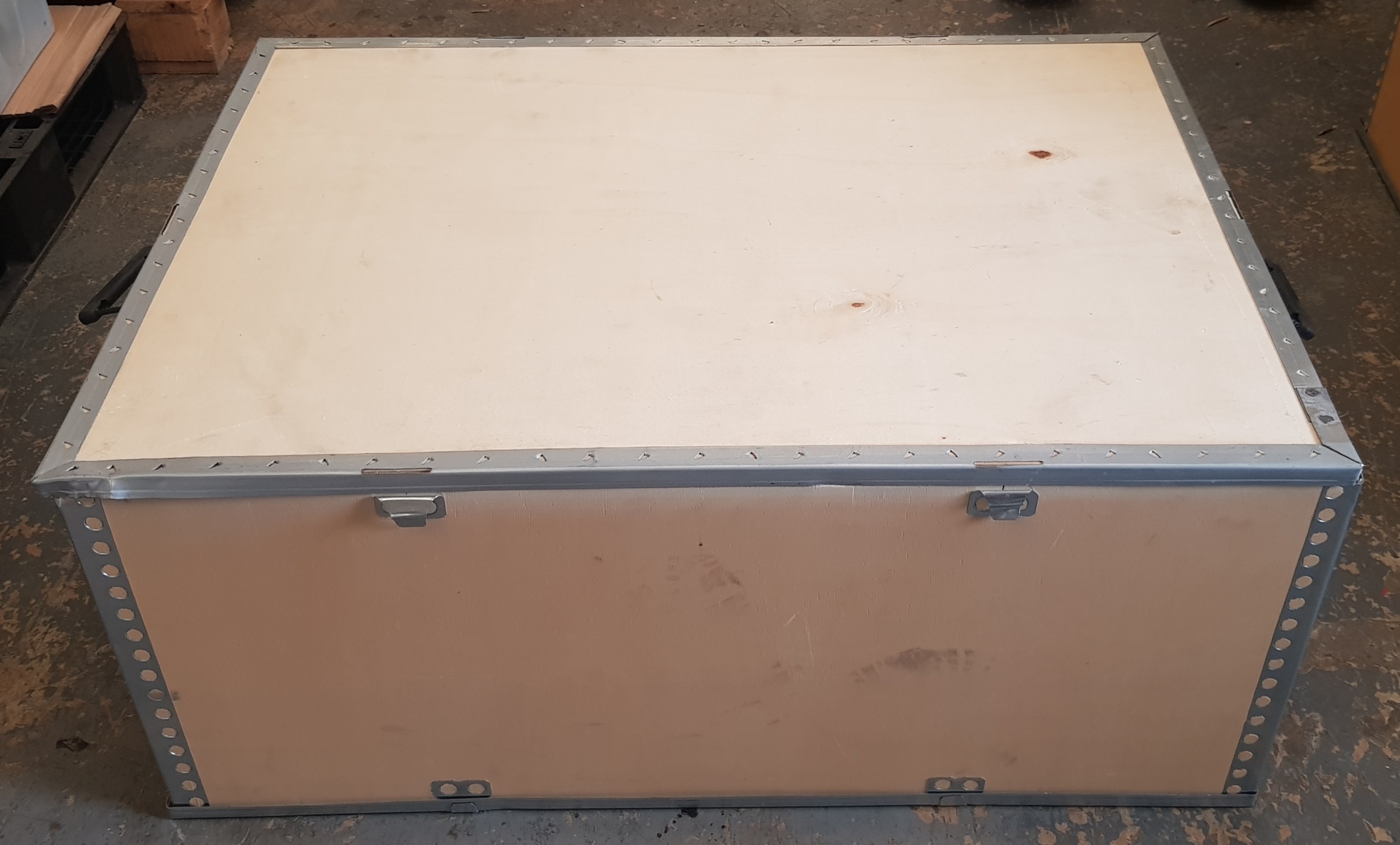 Four commercial metal bound plywood storage container boxes with removable lids and carrier handles.