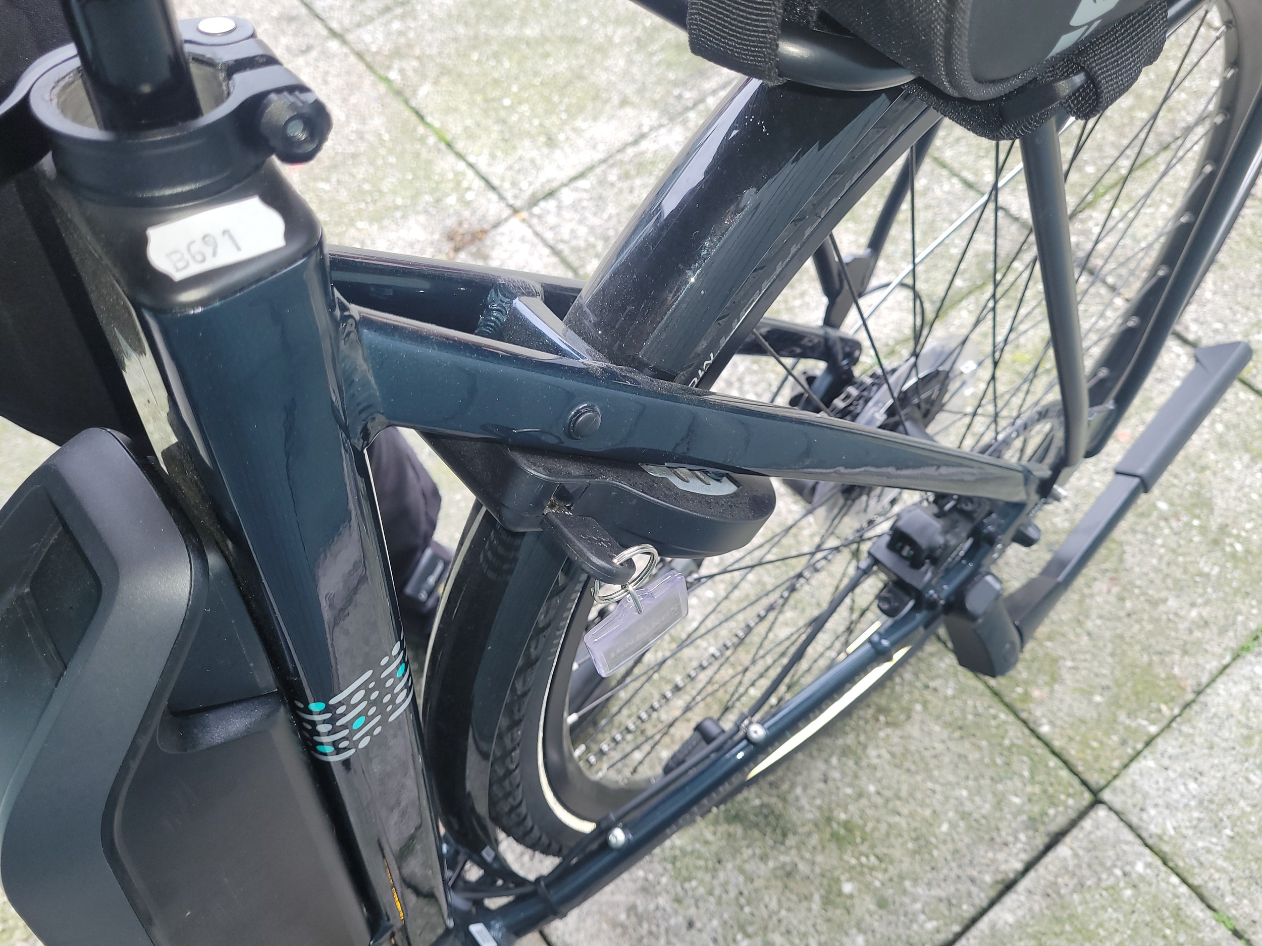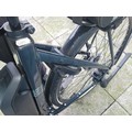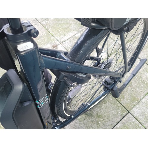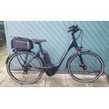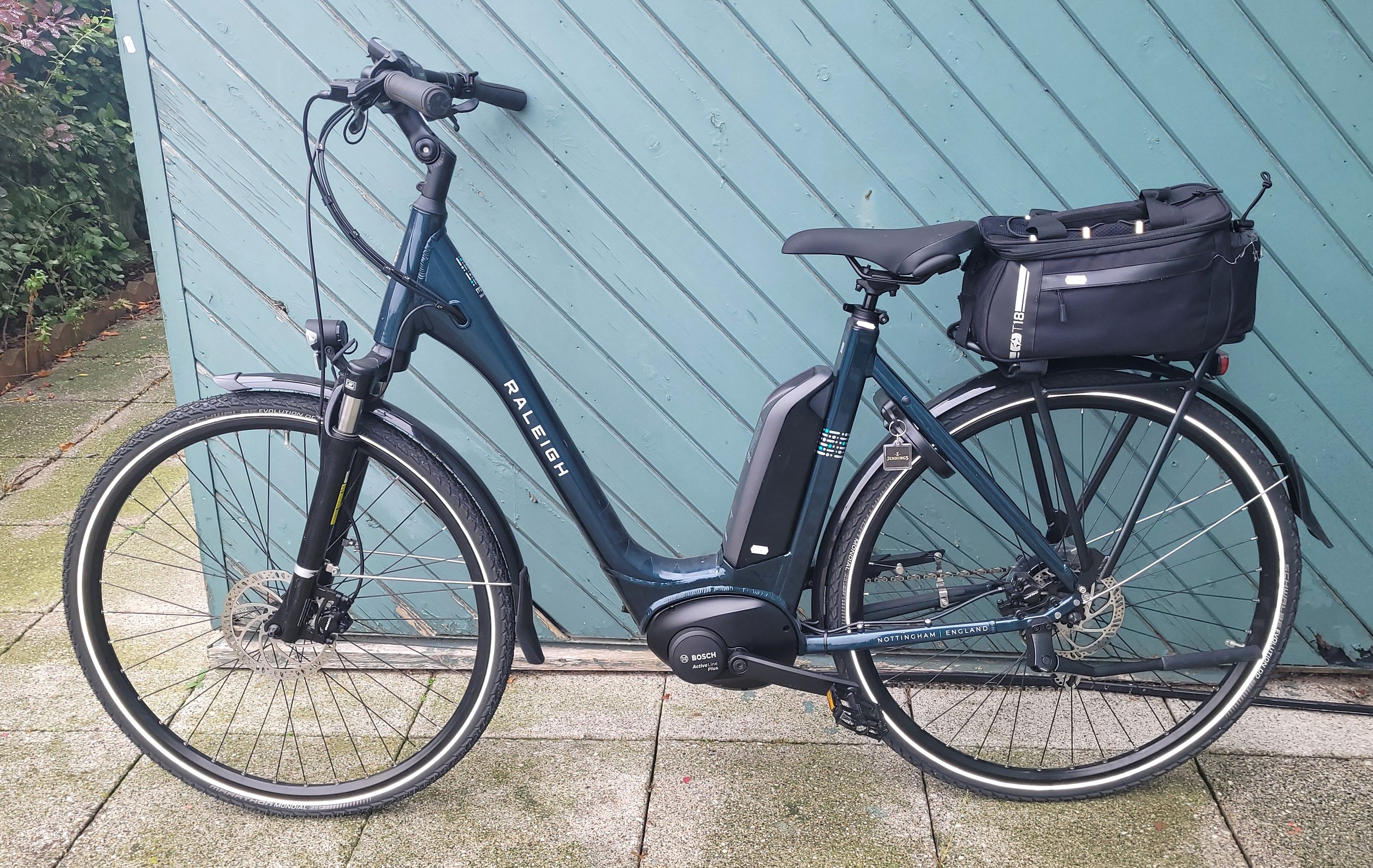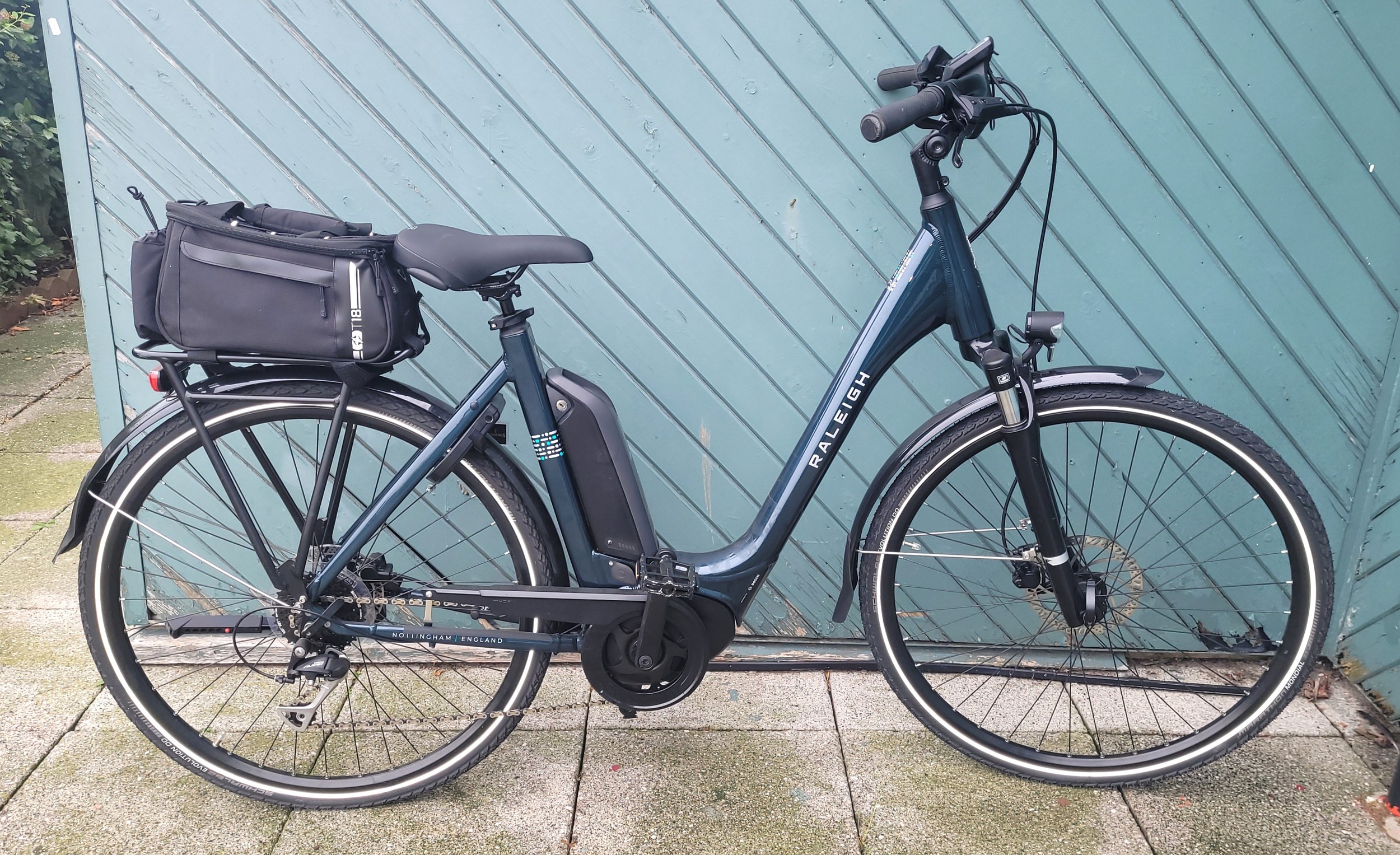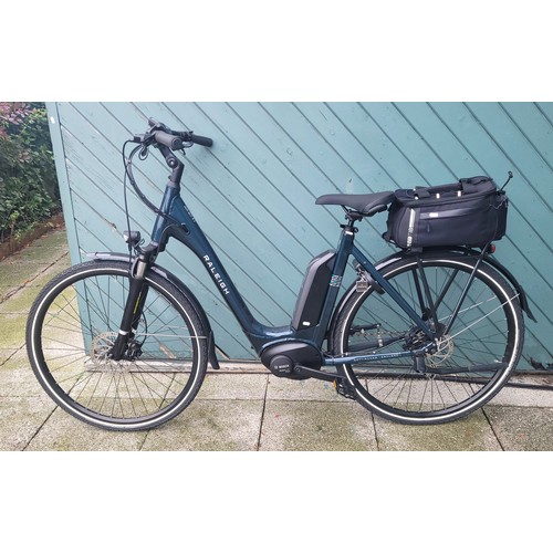 A Raleigh Motus electric bike with Bosch mid drive motor, 9 SPD gears, front suspension integrate lights, horseshoe lock, suspension seat post, rear rack with bag and prop stand 54cm step through frame.