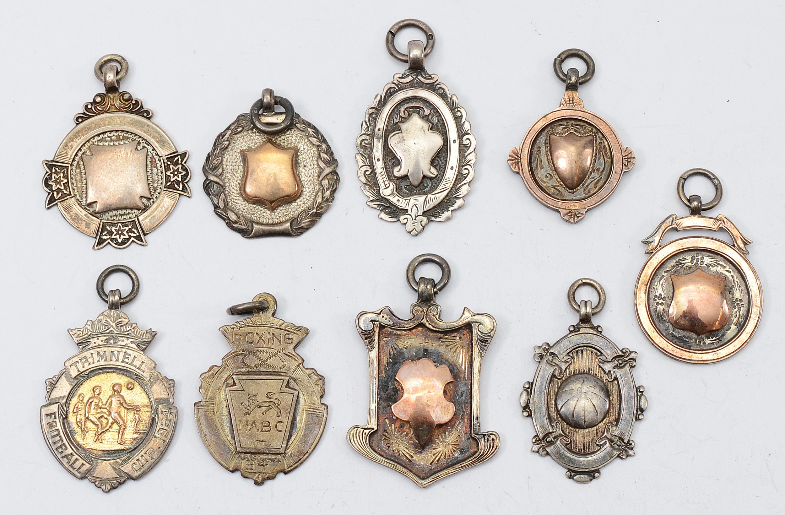 Nine various silver watch fobs and medals, various dates, 76gm.