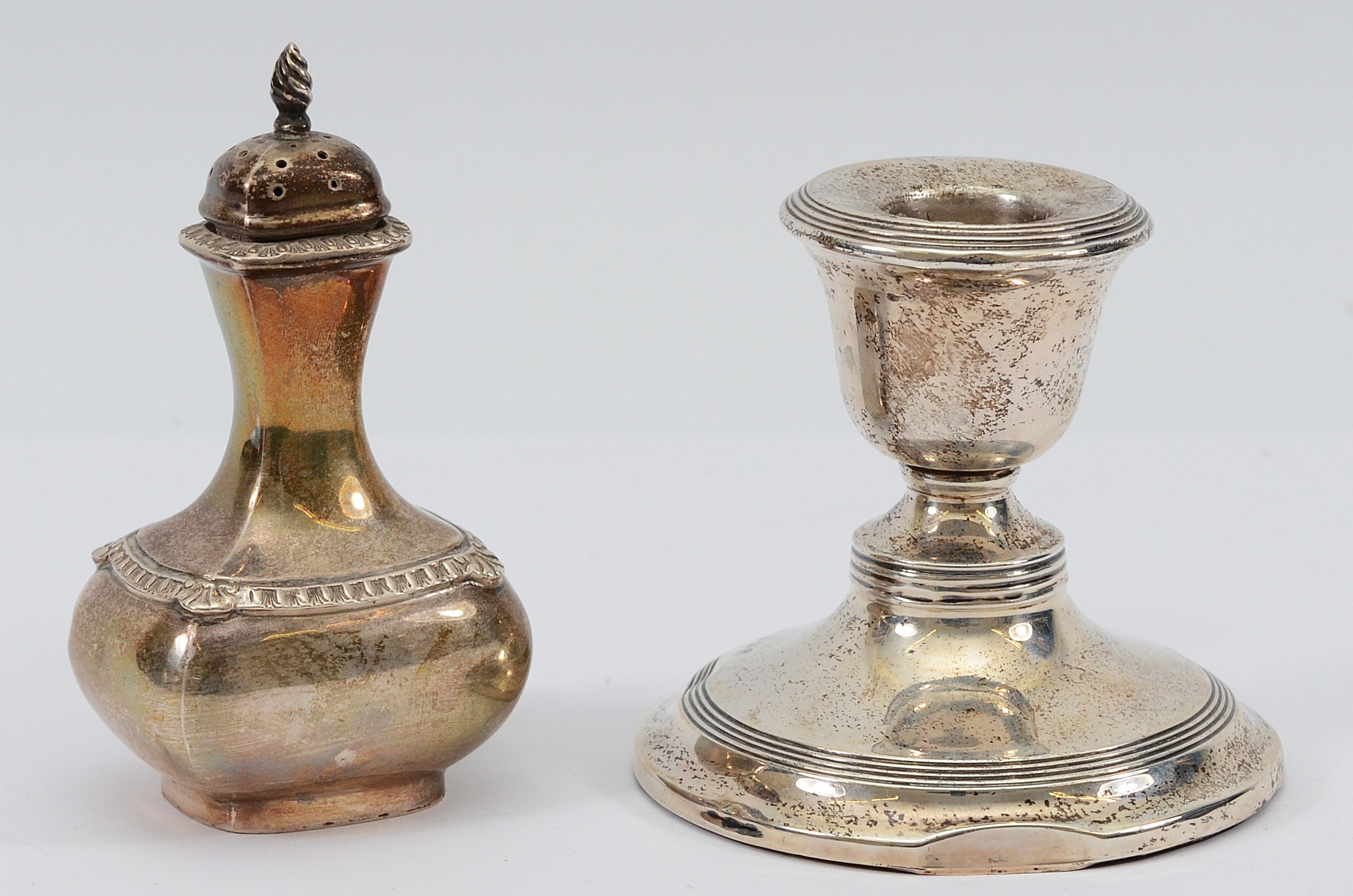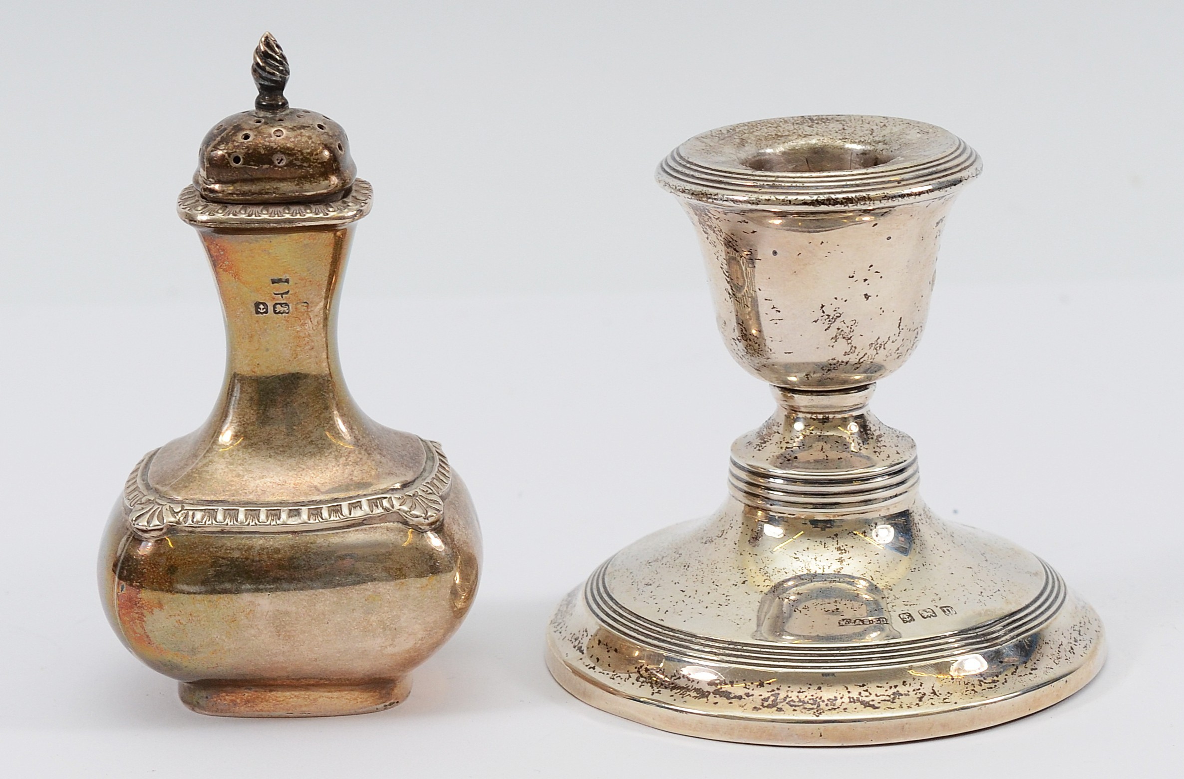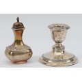 A silver pepper pot, Birmingham 1931, together with a miniature silver desk candlestick, Birmingham 1912, filled. pepper pot weighing 64gm.