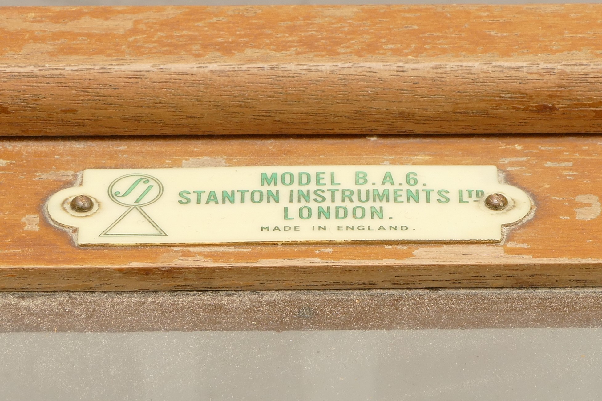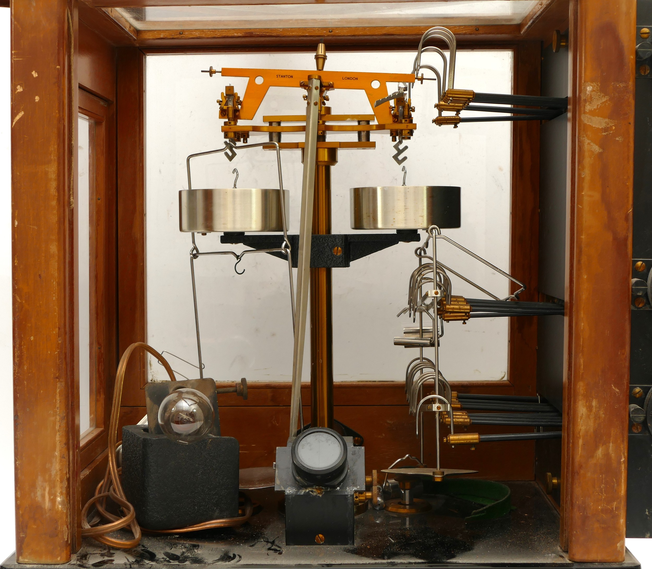 A set of Stanton analytical balance scales, model B.A.6 in glazed wooden case with a twin-pan design and weight loading hooks.
