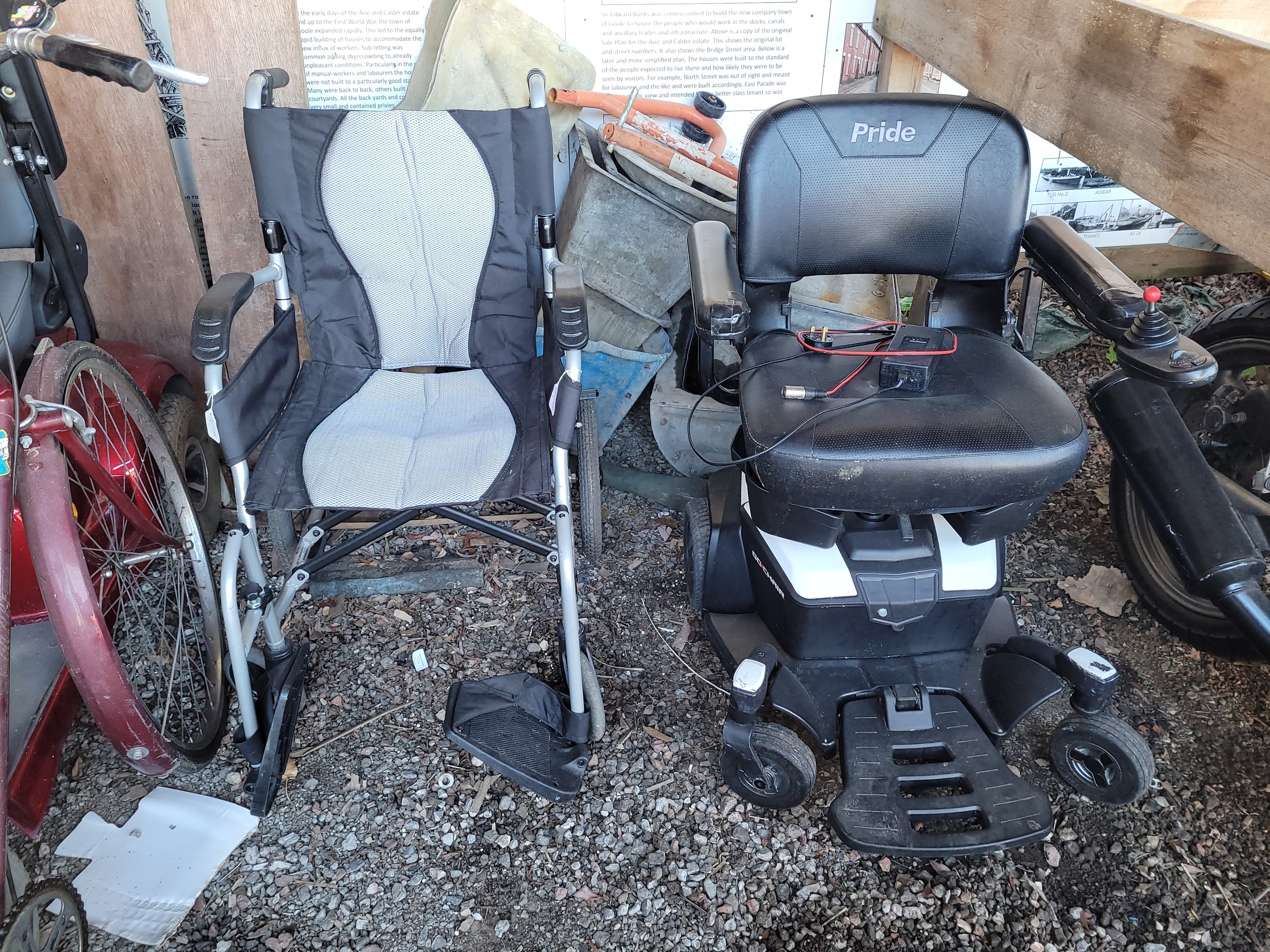 A Pride battery operated wheelchair (untested) together with a modern Karma folding manual wheelchair. (2)
