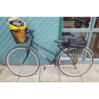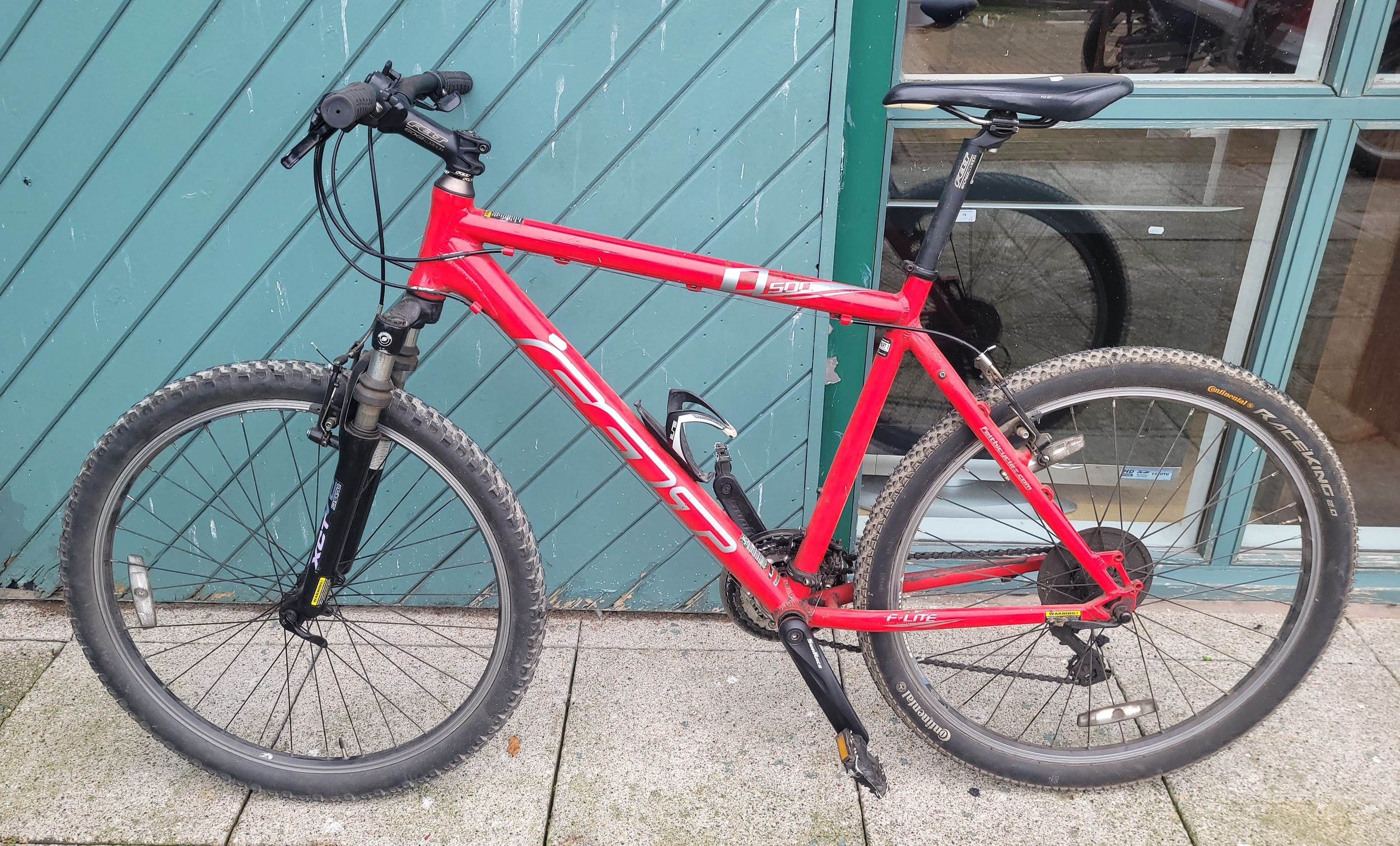 A Felt Q500 gents hybrid bicycle in red with a Shimano eight gear system.
