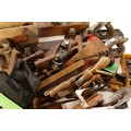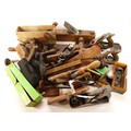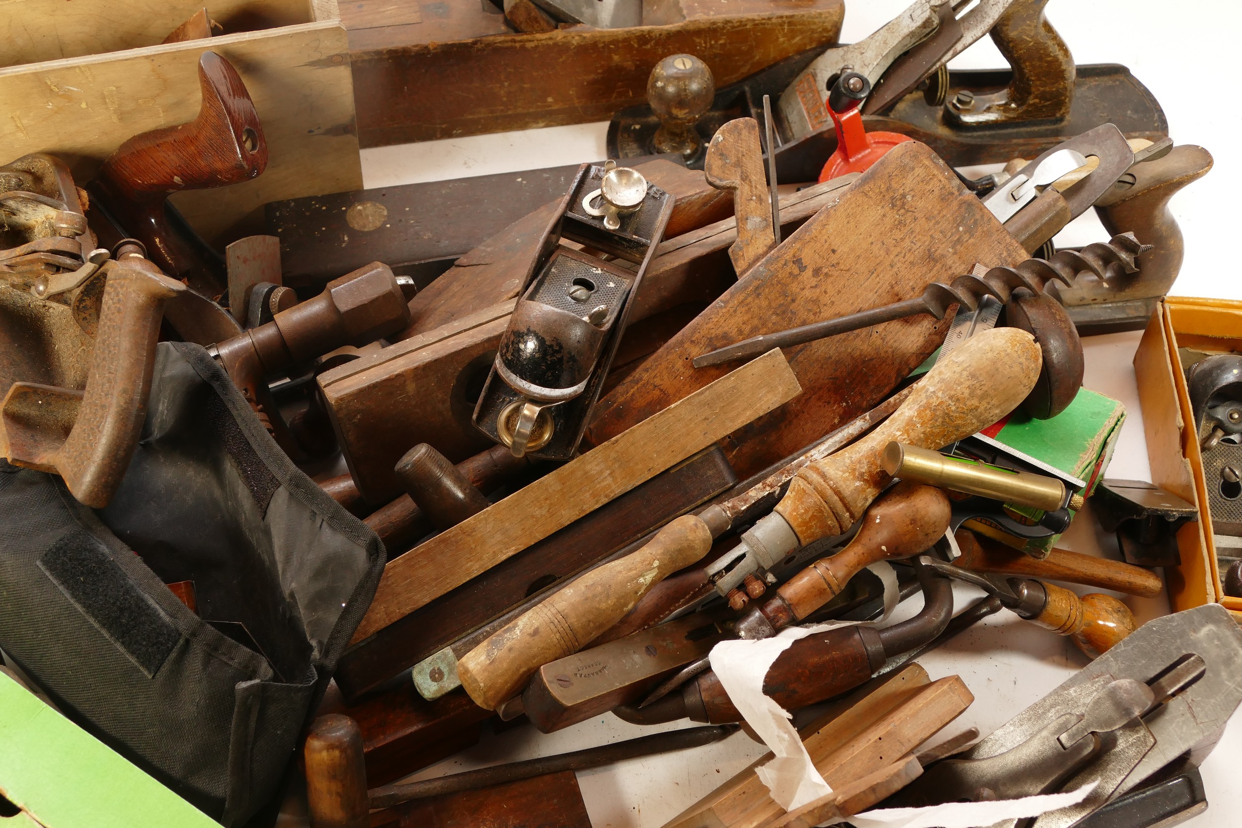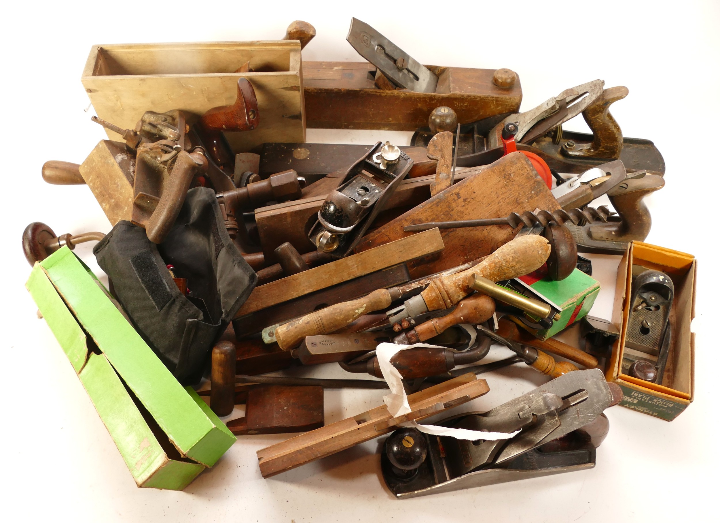 A collection of early to mid twentieth century carpenters hand tools to include, wood planes, block planes, spoke planes, hand saws, brace and bit also hand drills.