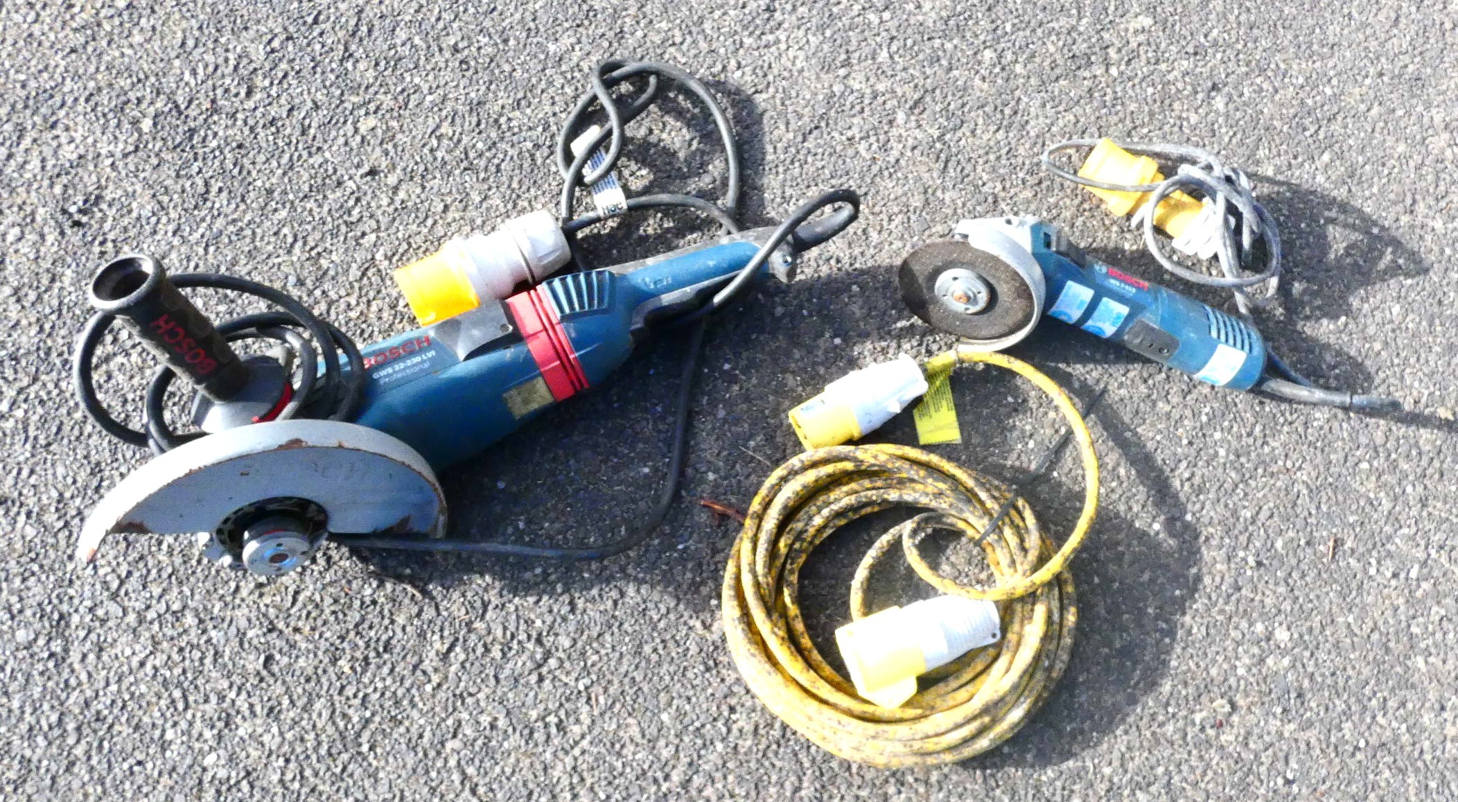 A Bosch GWS 22-230LV1 110v 2100w angle grinder, also a Bosch GWS 7-115 110v 720w disc grinder, to include a compatible 110v extension cable.