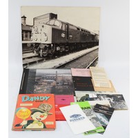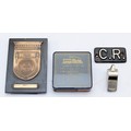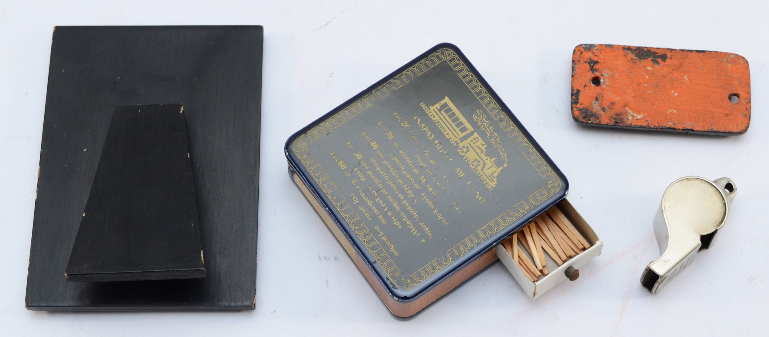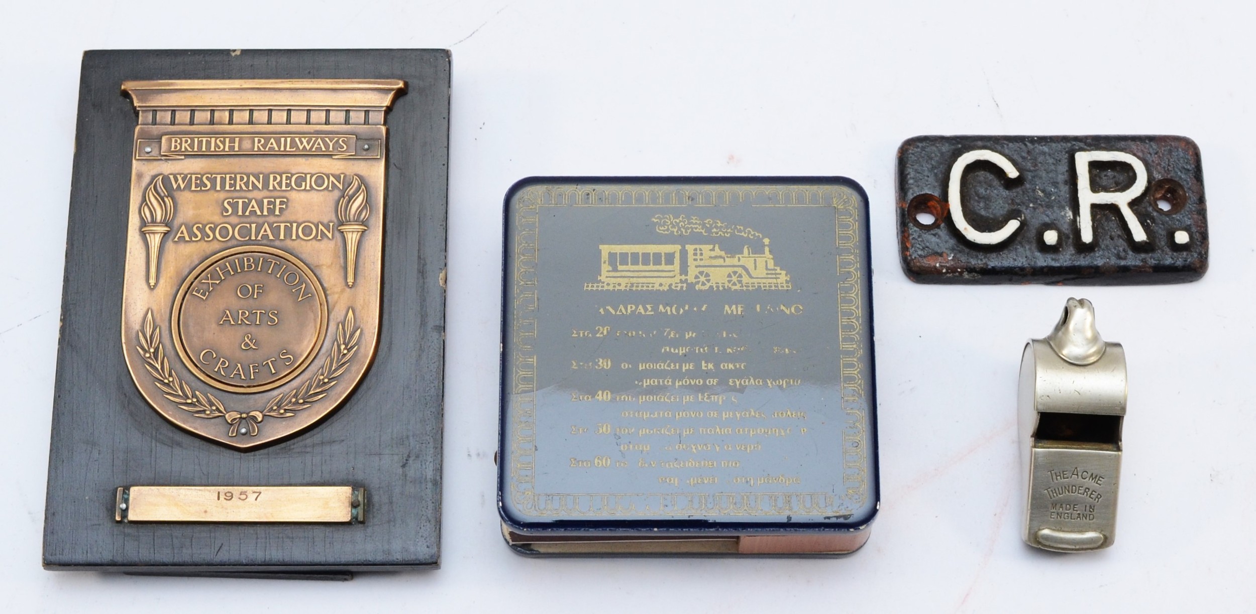 Tray of four sundry railway items, to include, metal BR(E) ACME thunderer whistle and B.B. (Western Region) staff associate arts and craft trophy (1957).