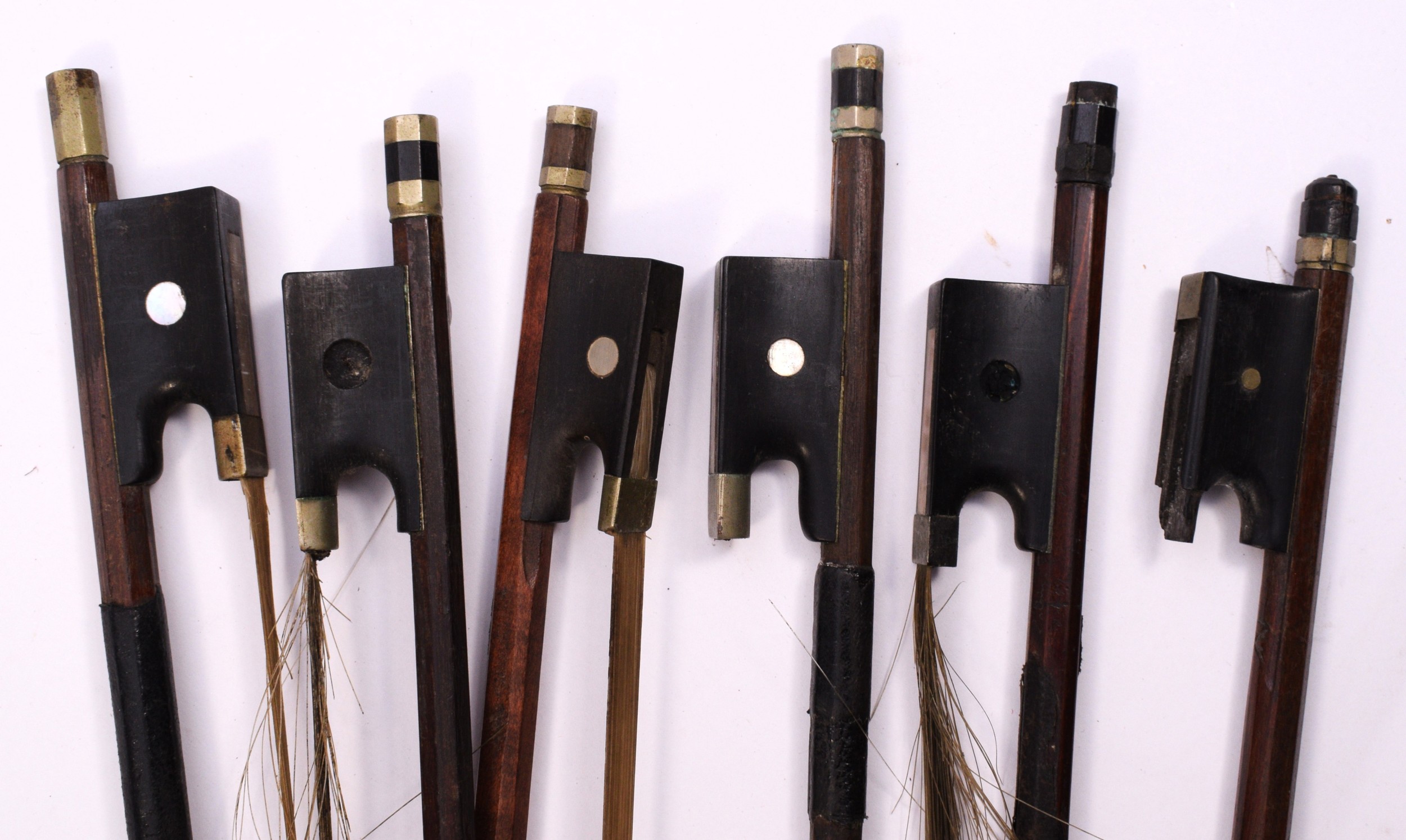 A group of six violin/viola/cello bows, various sizes, circa late 19th century and later. (6)