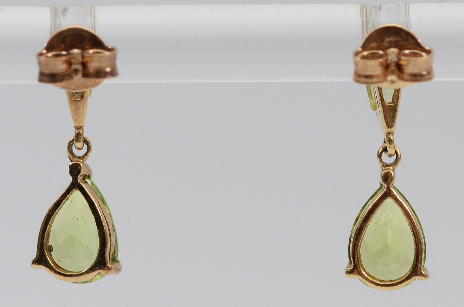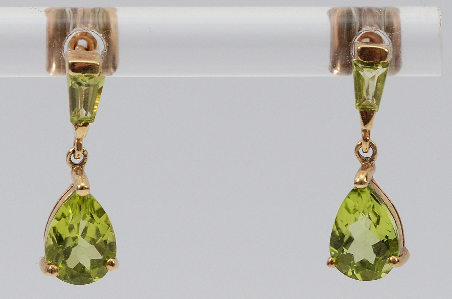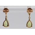 A pair of 9ct gold peridot drop earrings with scroll backs, 1.4g