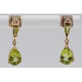 A pair of 9ct gold peridot drop earrings with scroll backs, ...