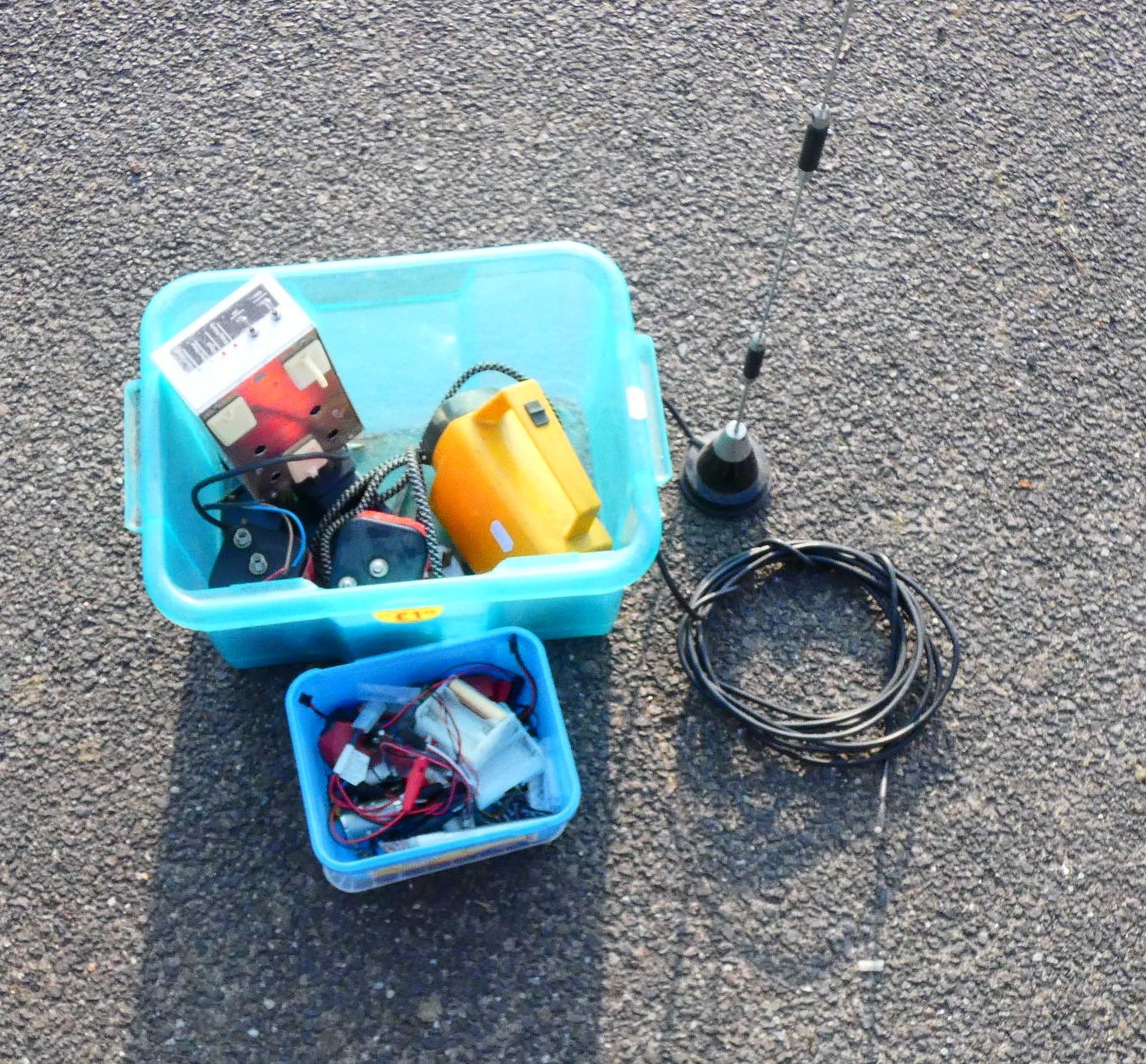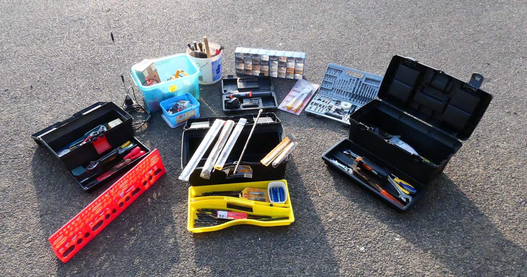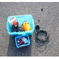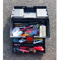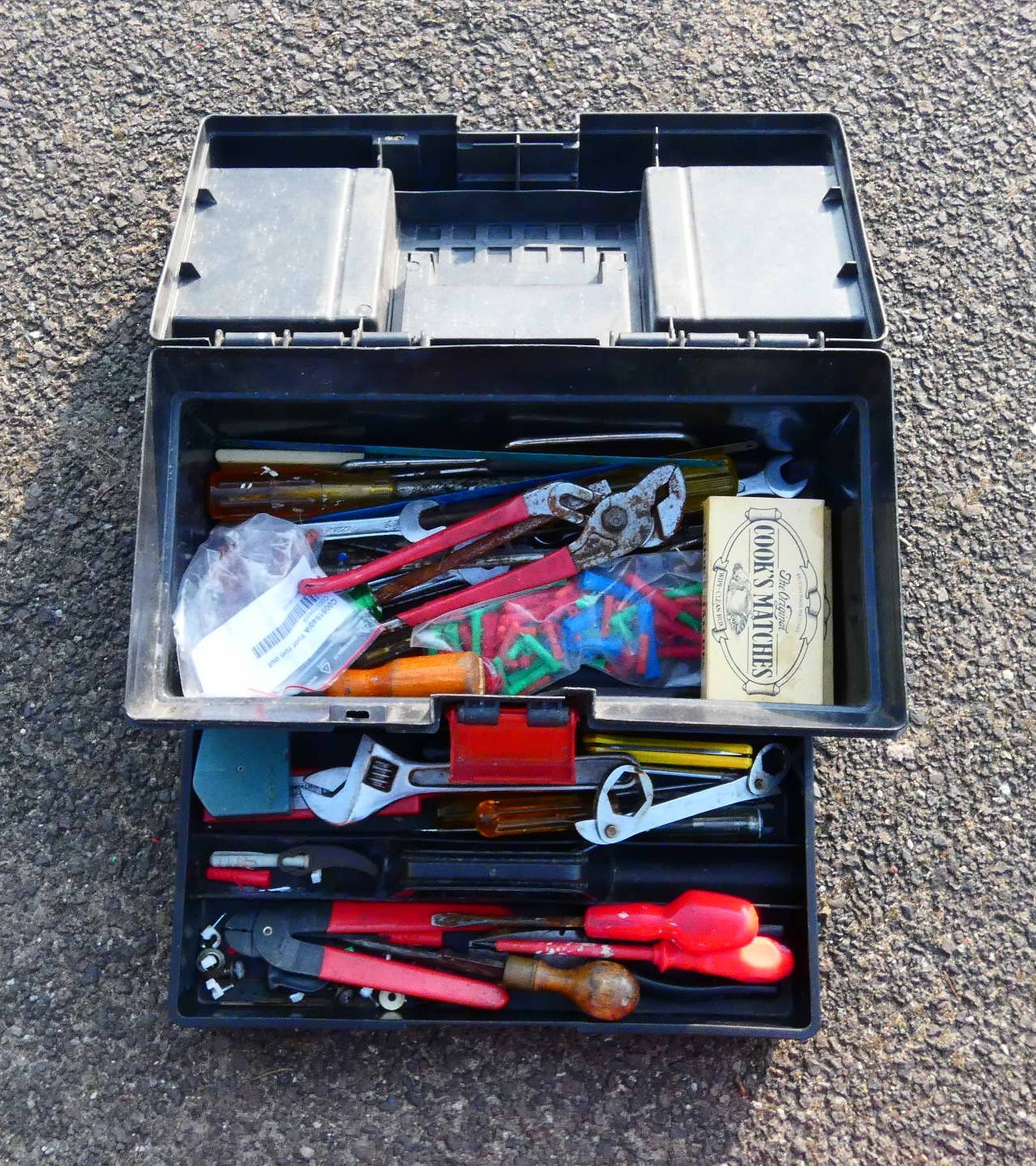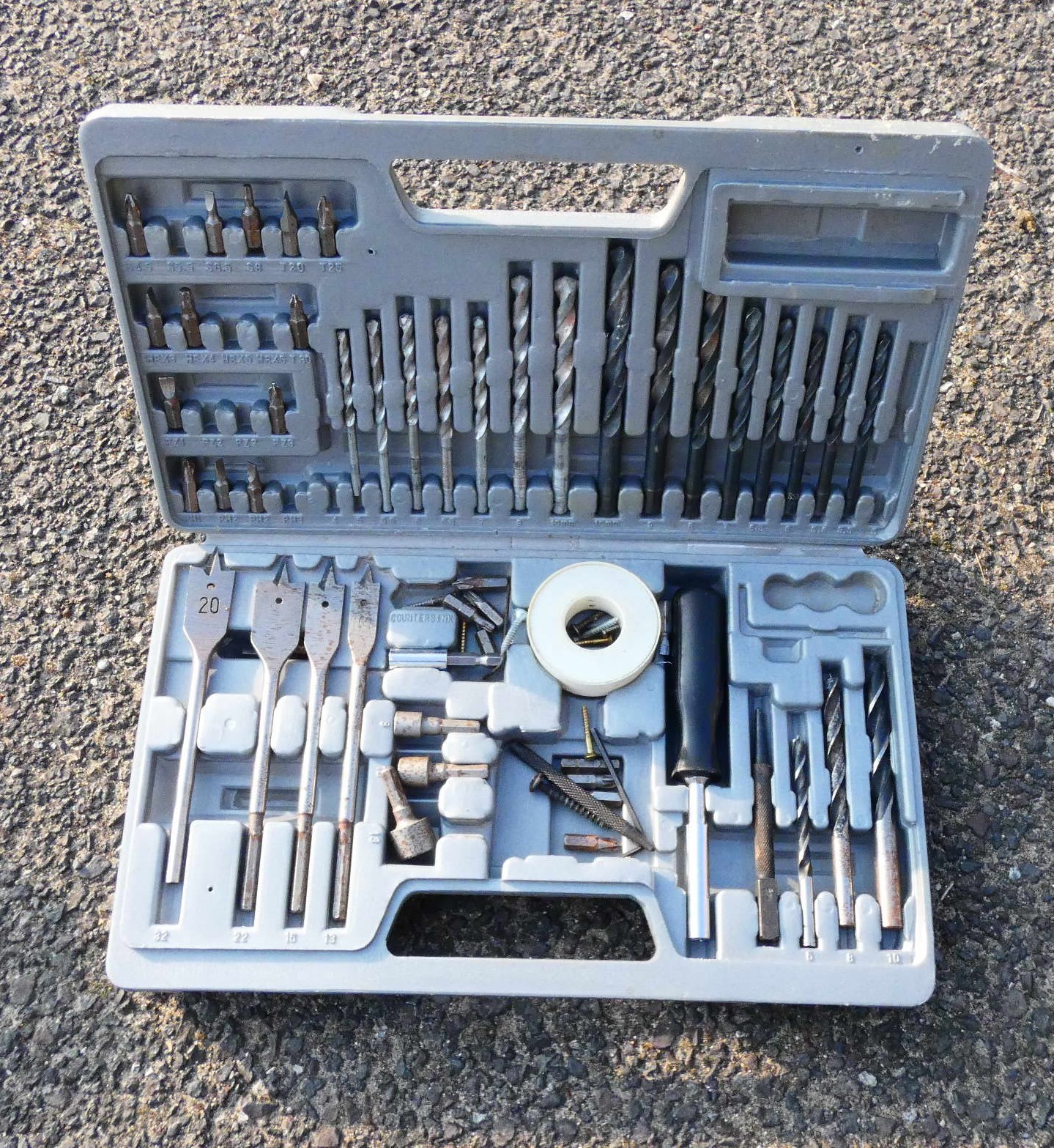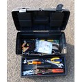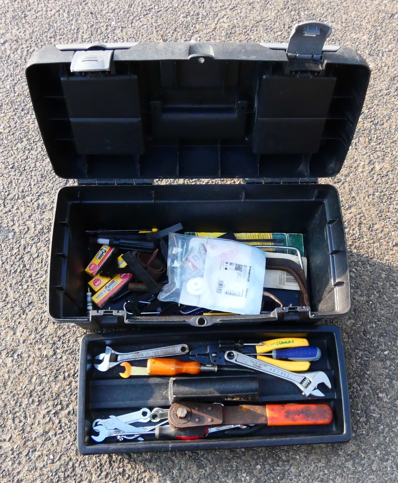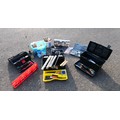 A black plastic tool box containing a selection of hand tools, a Black and Decker BL24V 240v cordless screwdriver with box, a grey Bosch plastic case containing a selection of drill bits, an Am-Tech four nozzle rivet gun with a selection of rivets, a white tub containing a selection of heavy duty chisels, wire brush and a hand tile cutter, a blue plastic storage unit with thirty four pull out drawers, red plastic bench tool storage rack, a Starplast plastic lever toolbox containing a selection of wood drill bits and carbide tipped masonry bits, a Zag plastic lever toolbox containing a selection of hand tools, a plastic tub containing a 12v remote control unit with electrical consumables, a yellow hand held torch and an ariel, an Abru Starmaster extendable two piece aluminium ladder 7.18m overall length.