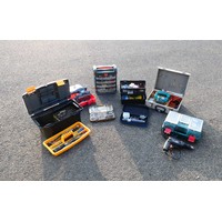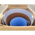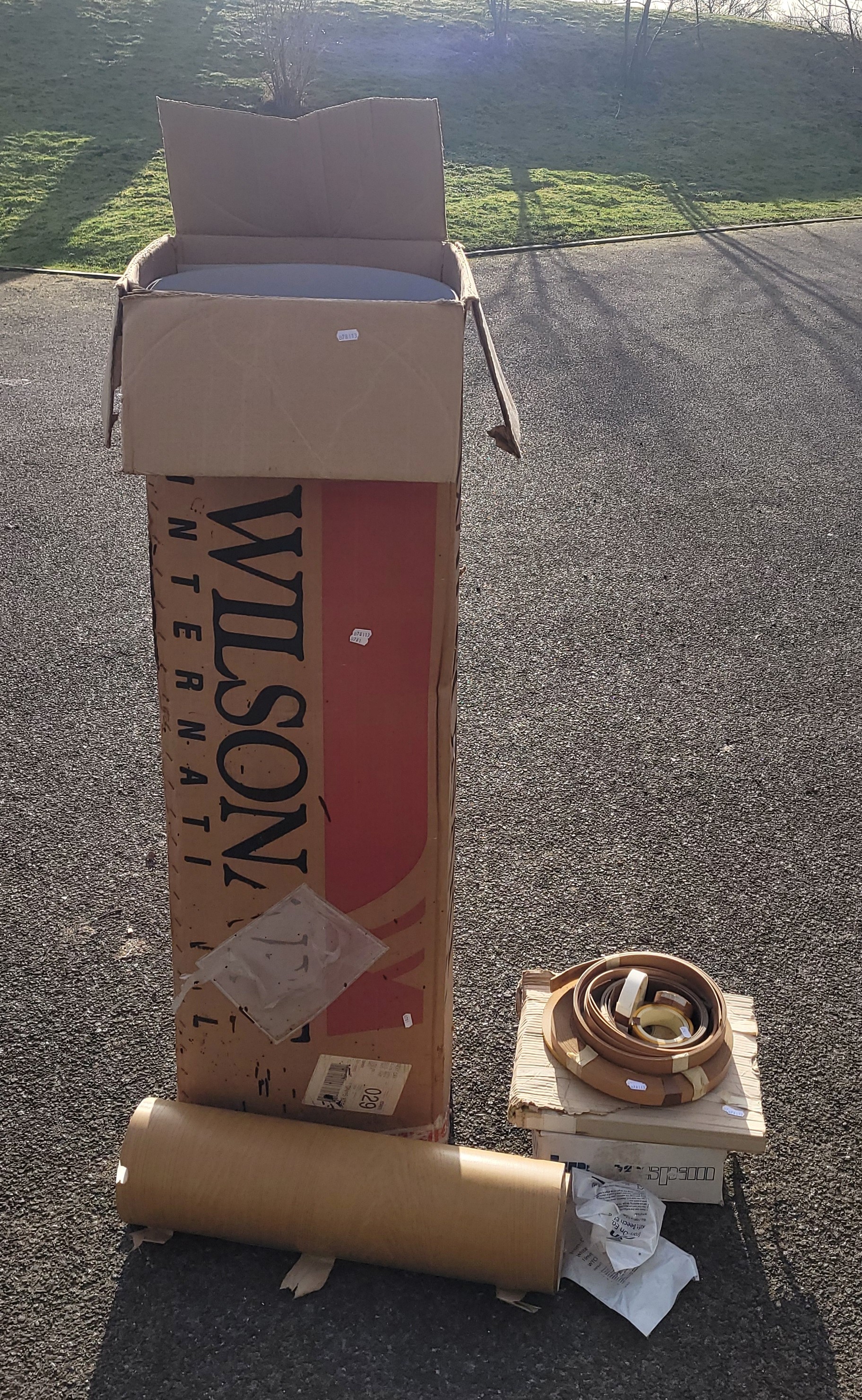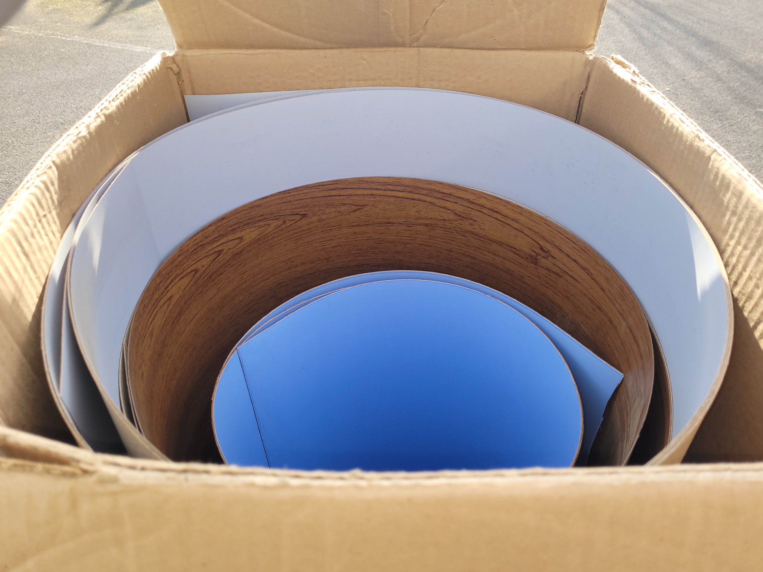 A large box containing a selection of flooring veneers with various finishes, also a selection of iron on edging.