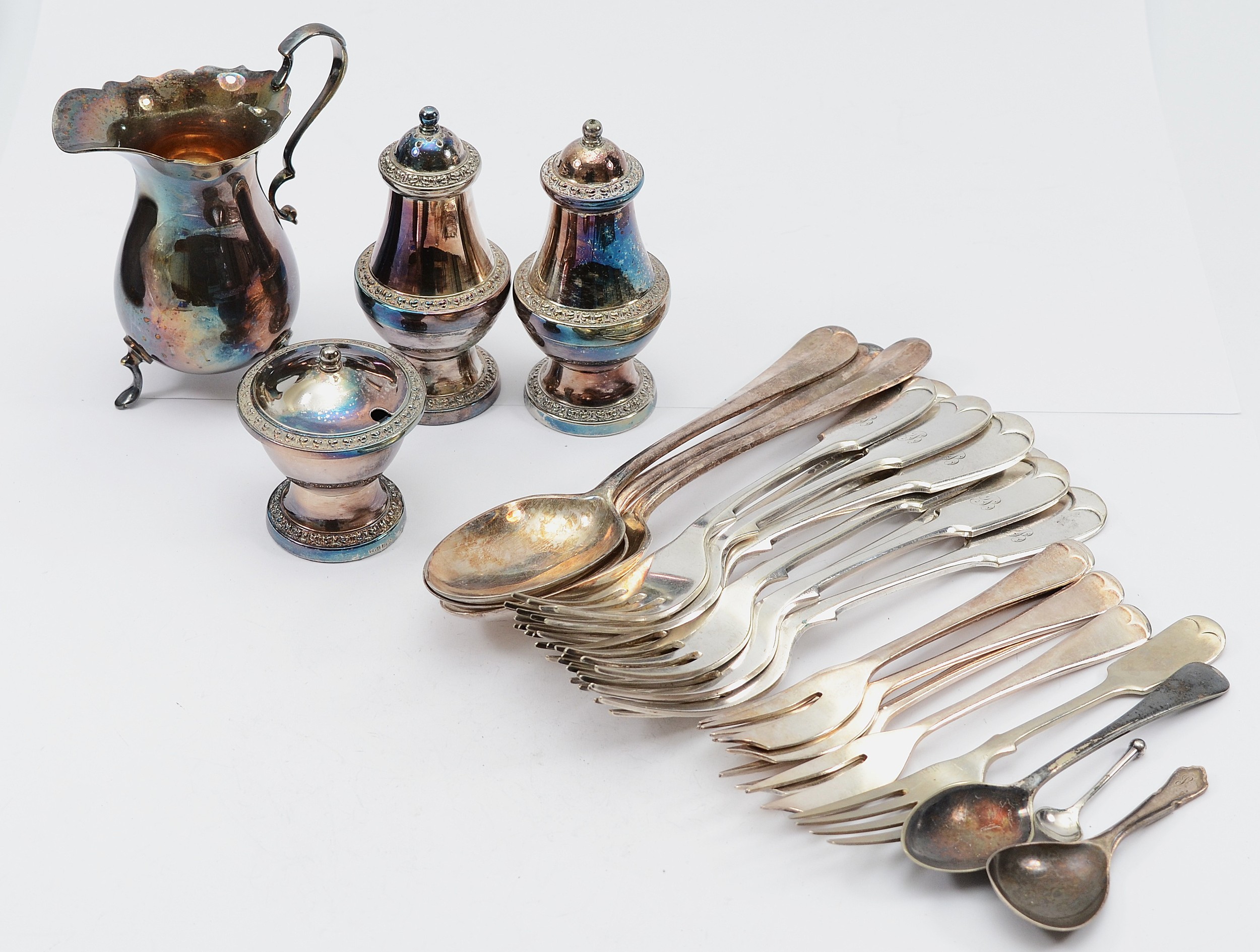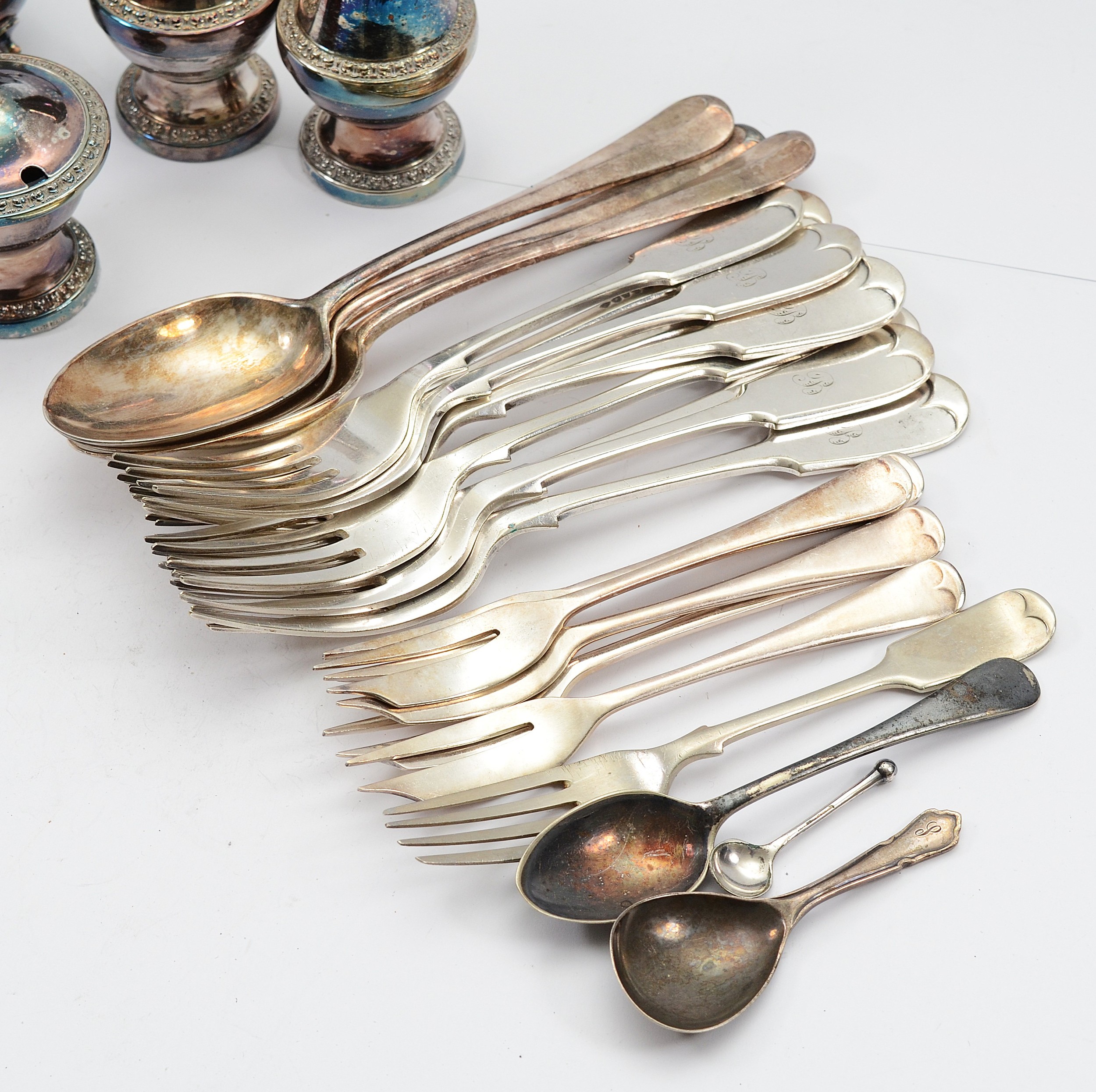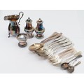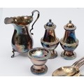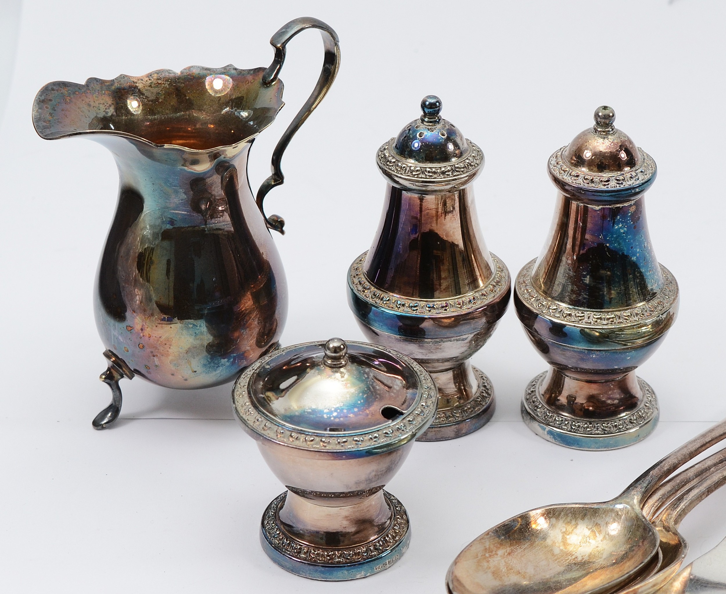 A pair of silver plate salt and pepper pots, together with a matching condiment pot with blue glass liner and spoon, a plated cream jug, a silver caddy spoon, Sheffield 1959, and a quantity of plated cutlery. 1x bag