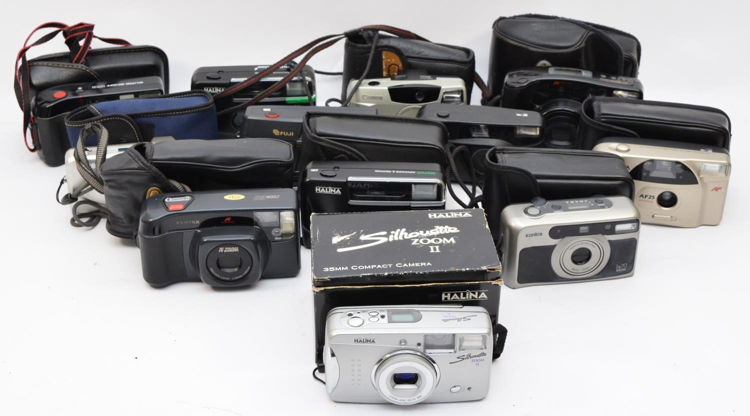 A collection of twelve 35mm compact cameras, to include a Minolta 125 Riva Zoom, a Konica Z-up 70 VP, a Halina Vision XM (x2), a Minolta AF25, a Canon Sureshot Supreme, a Fuji DL-150, a Canon Sureshot 60zoom, a Premier PC-660, a Samsung AF Zoom 1050, A Pentax zoom 60 and a boxed Halina Silhouette Zoom II