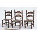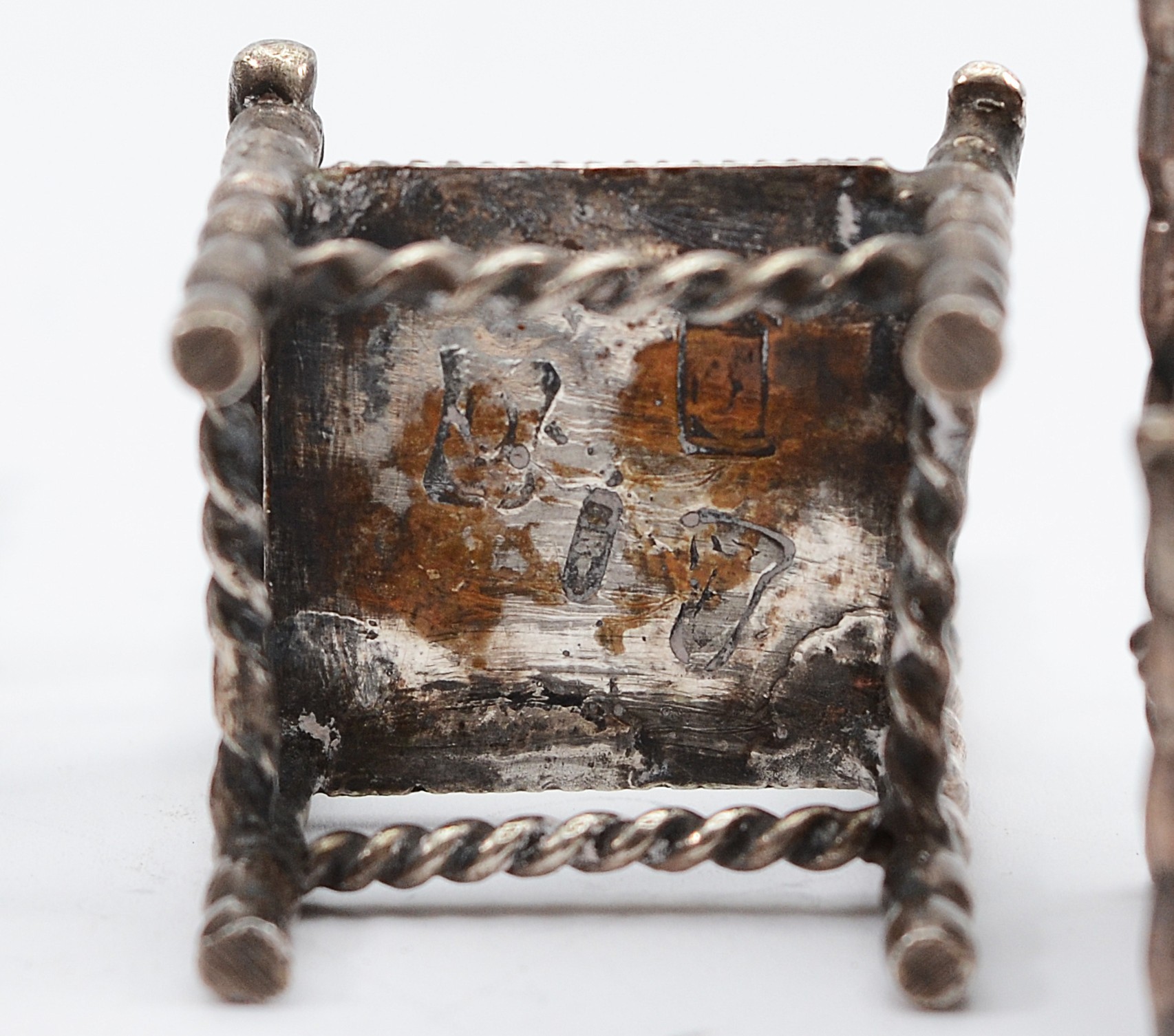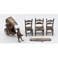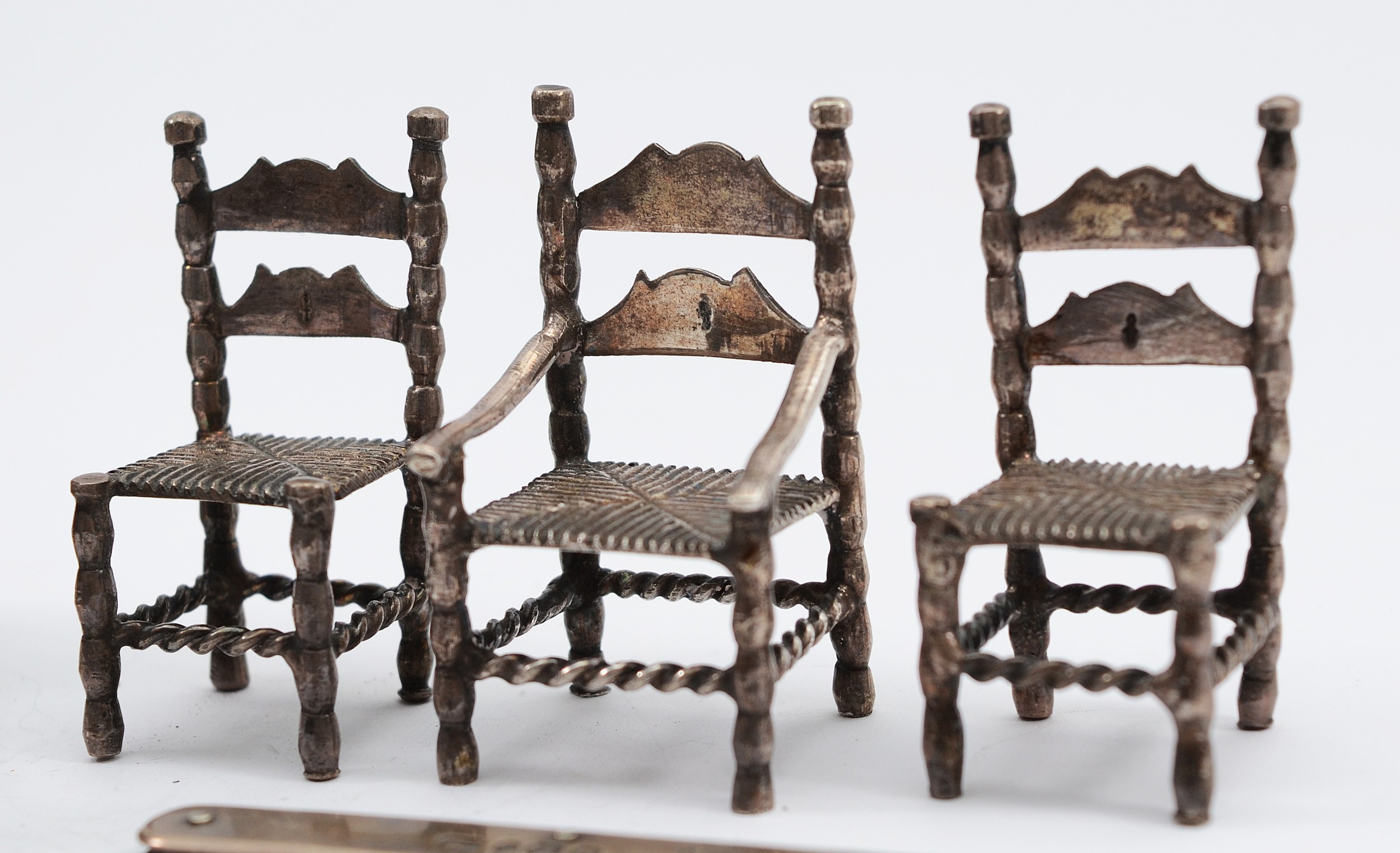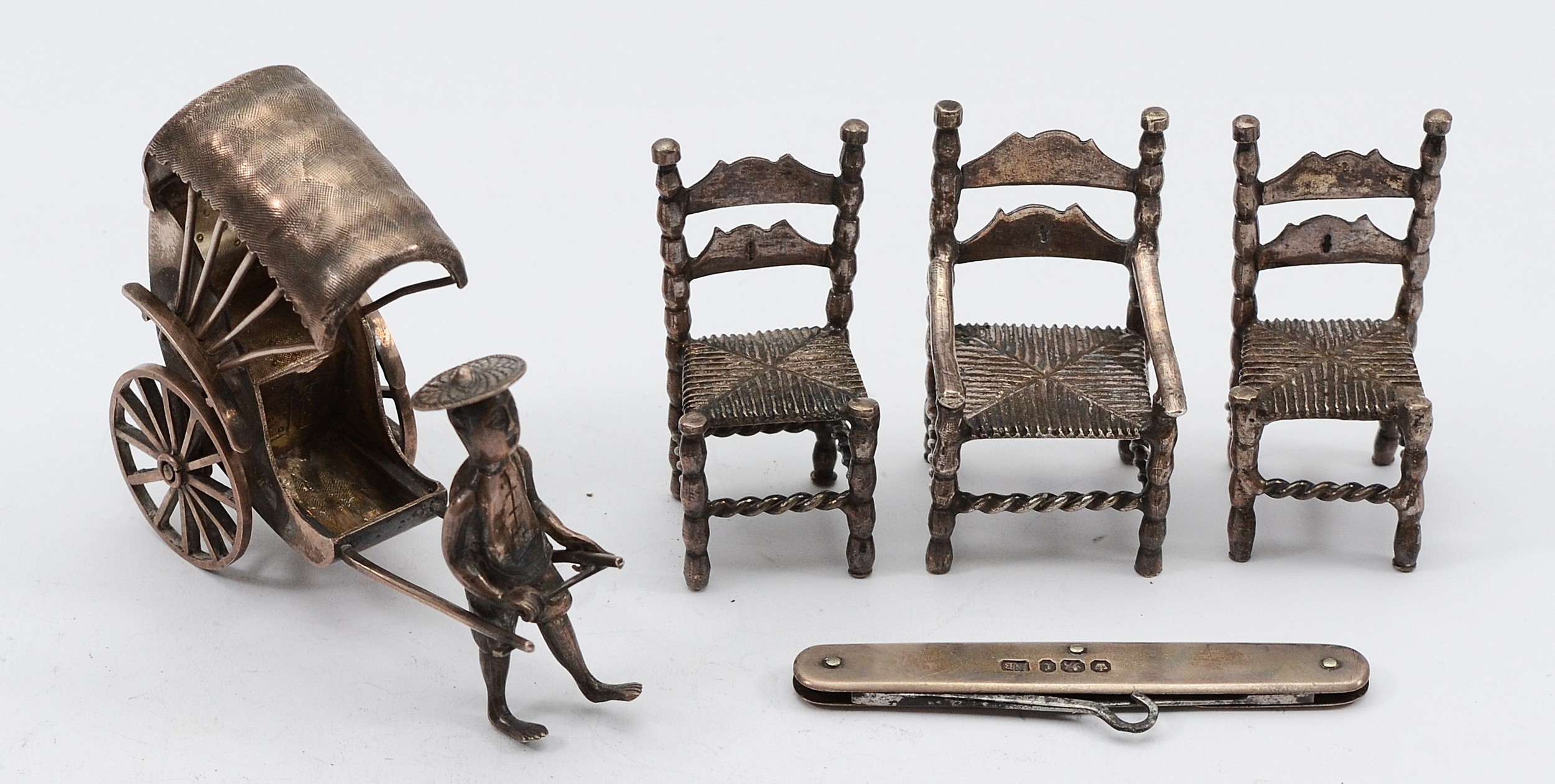Three Dutch silver miniature chairs, with Hanau markings to the bases, 5x3cm, together with a silver miniature model of a man pulling a rickshaw, marked sterling, and a silver pocket button loop and knife, Sheffield 1895, 103gm.