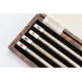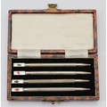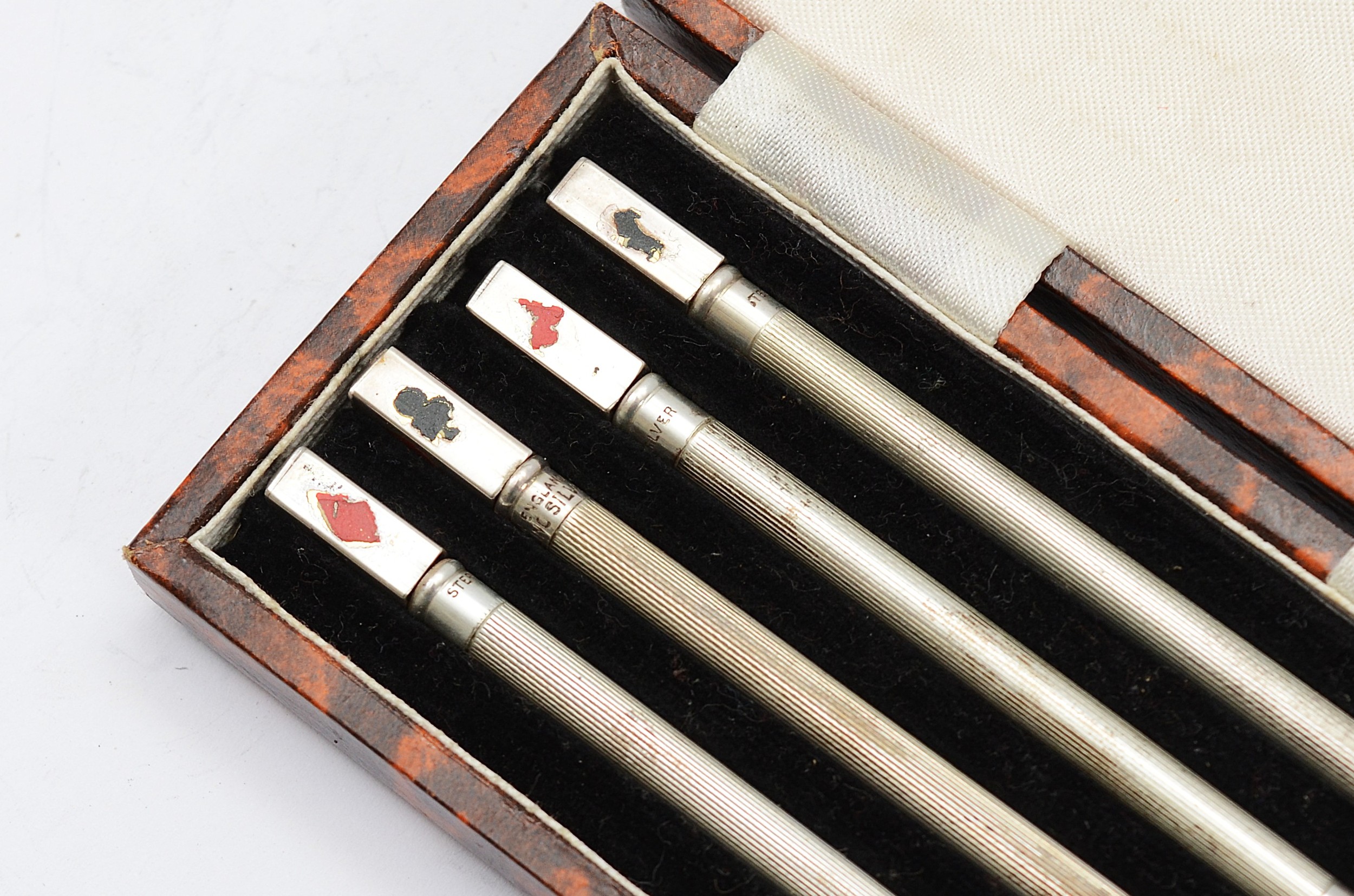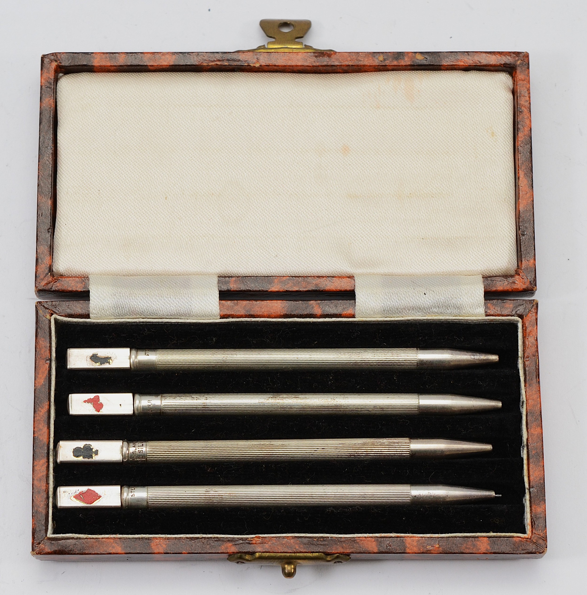 A set of four silver twist action pencils each decorated with the four card suits, stamped SILVER, cased.