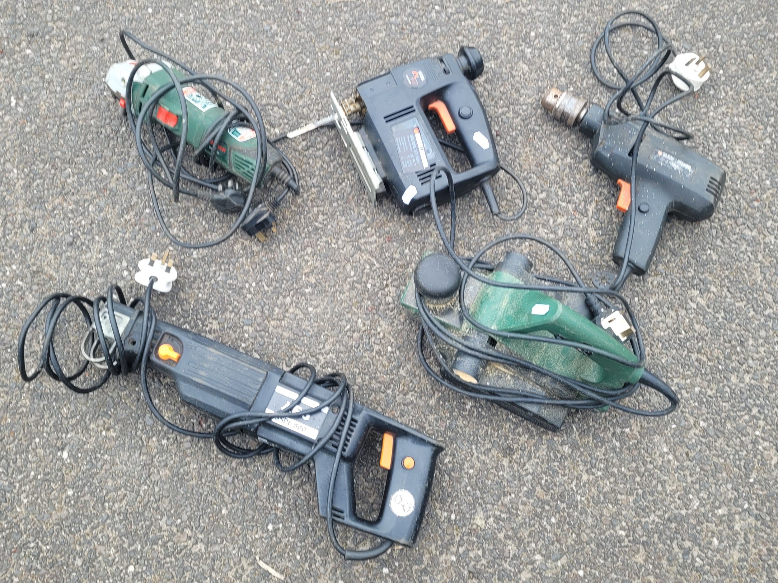 A collection of power tools to include, a Bosch PHO 25-82 240v 750w wood planer, a Black and Decker BD142T 240v 500w drill, a Universal 230v 701w disc grinder, a Black and Decker BD538SE 240v 350w jigsaw and a AEG SSPE 800 220v 800w reciprocating saw. (5).