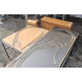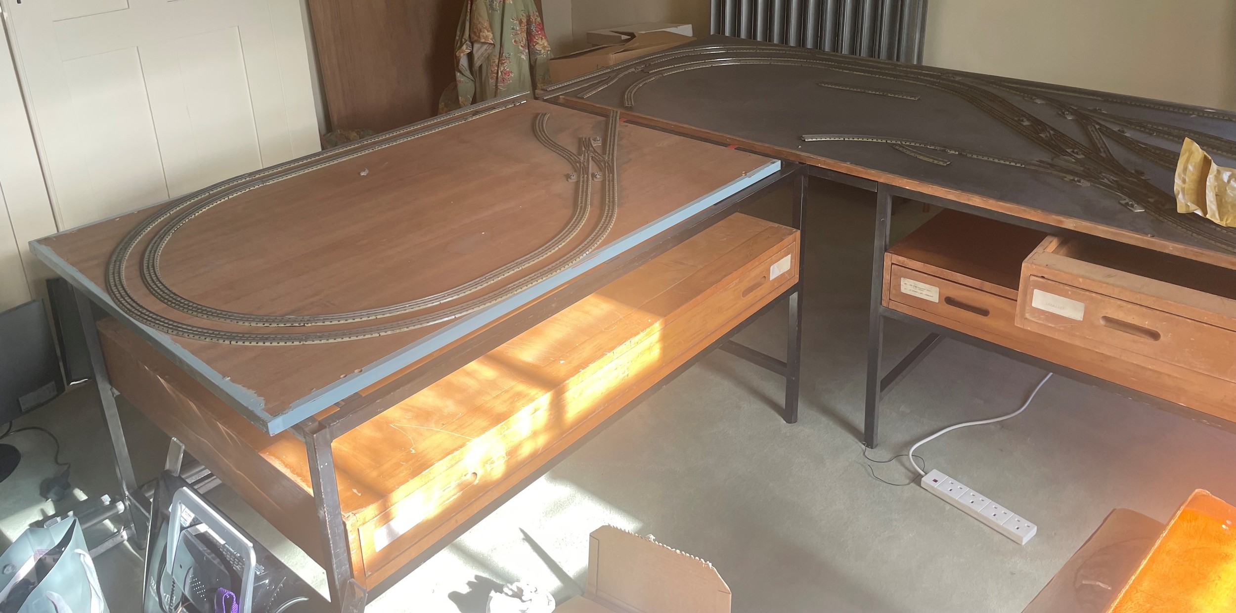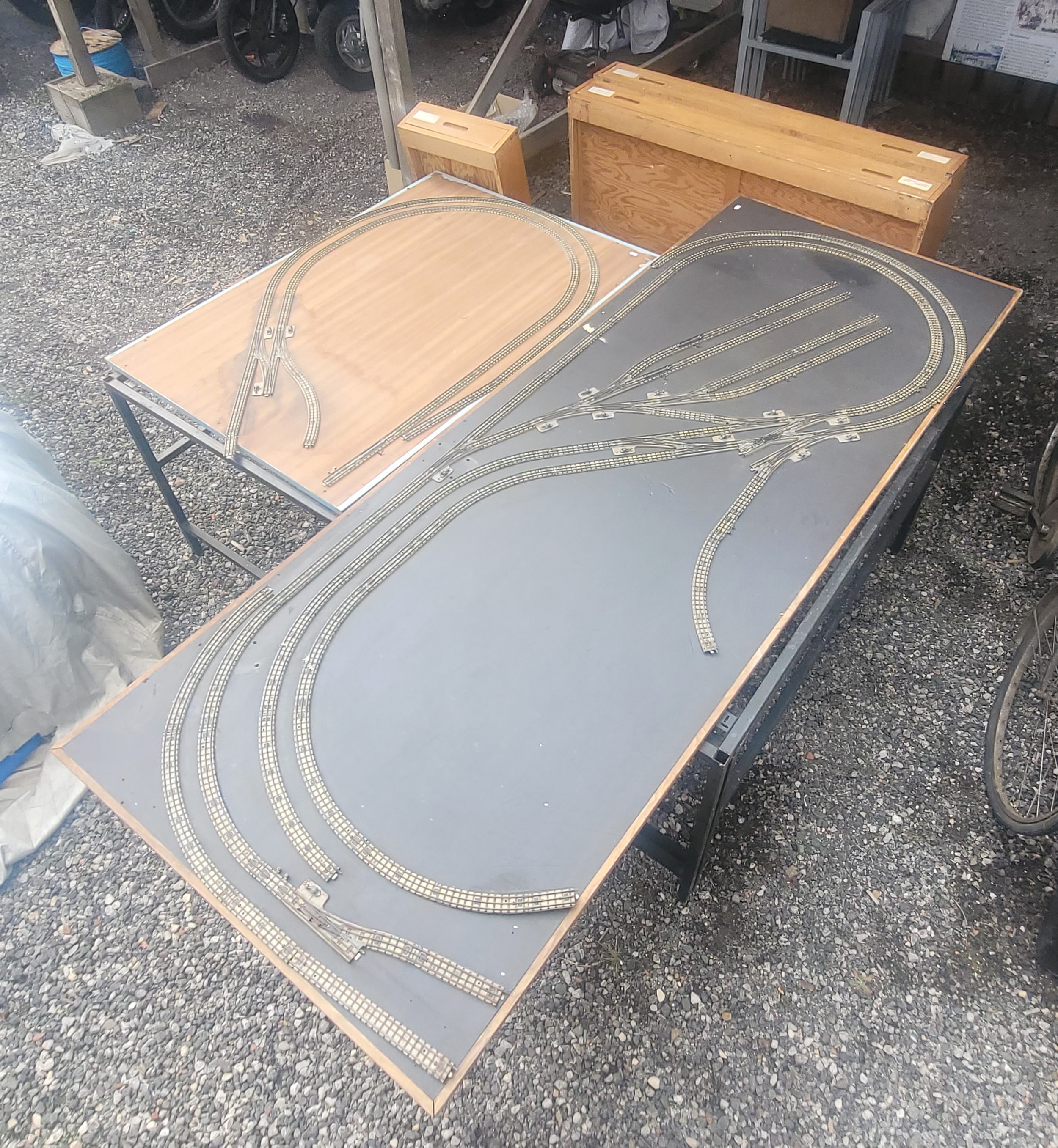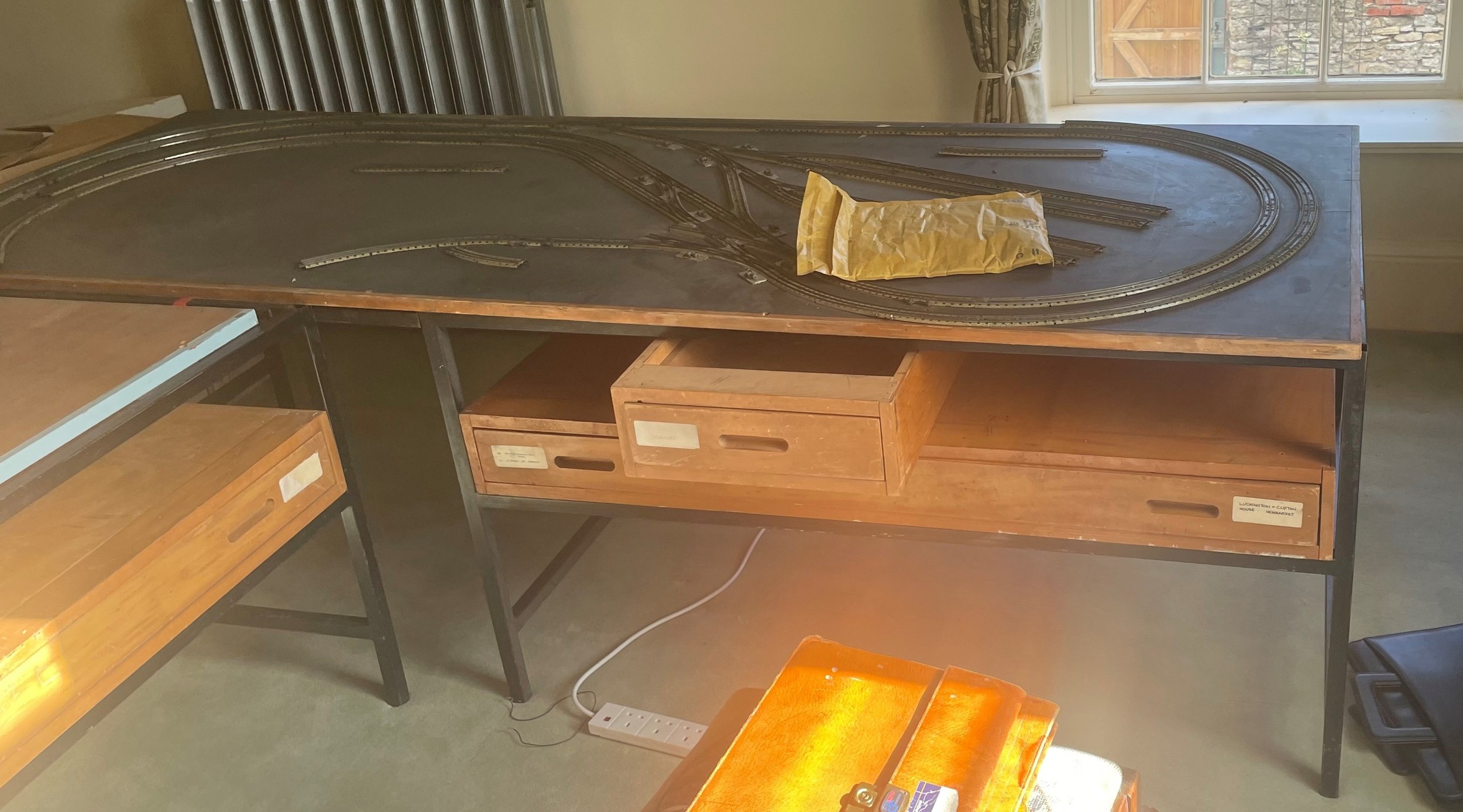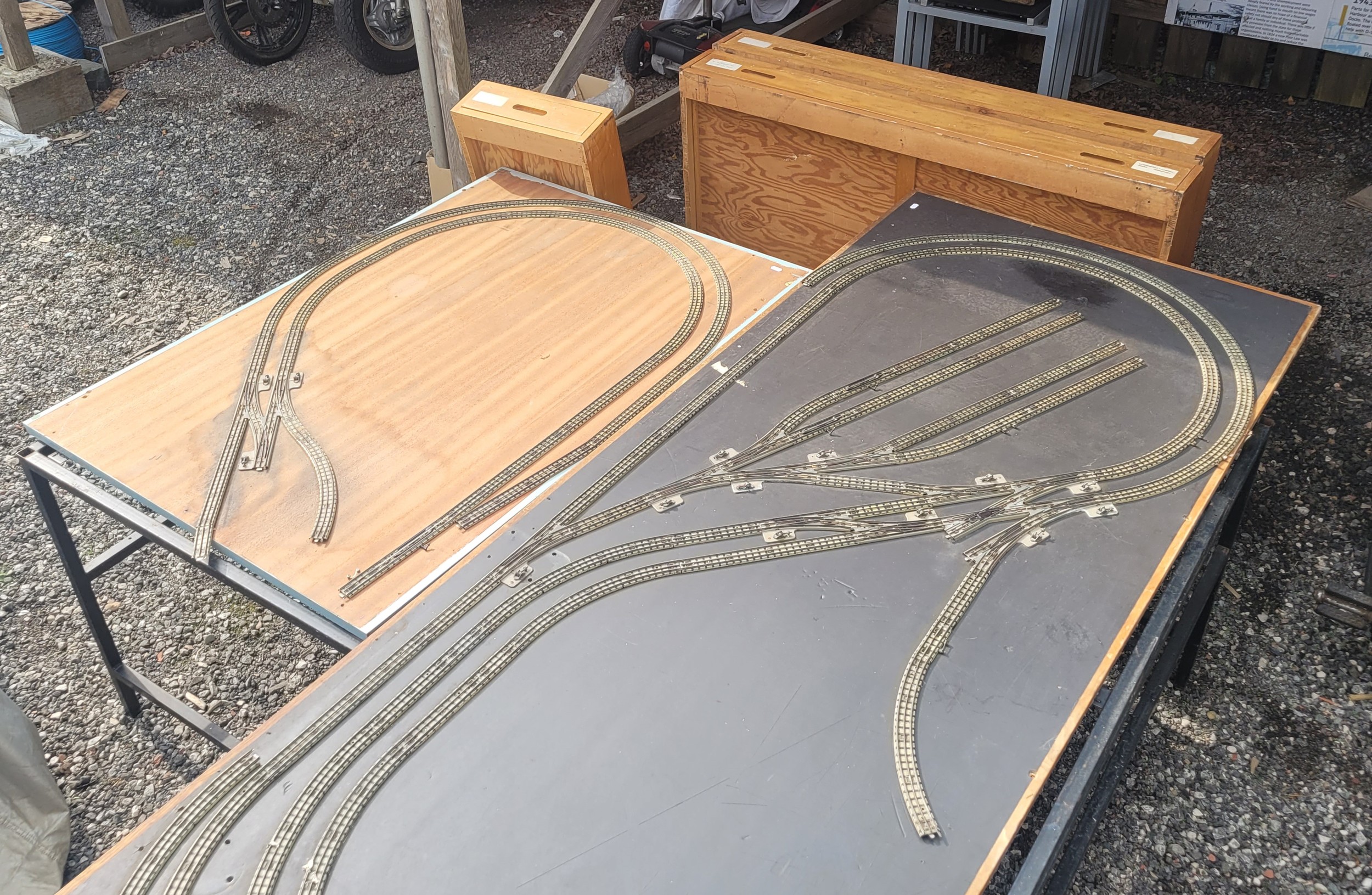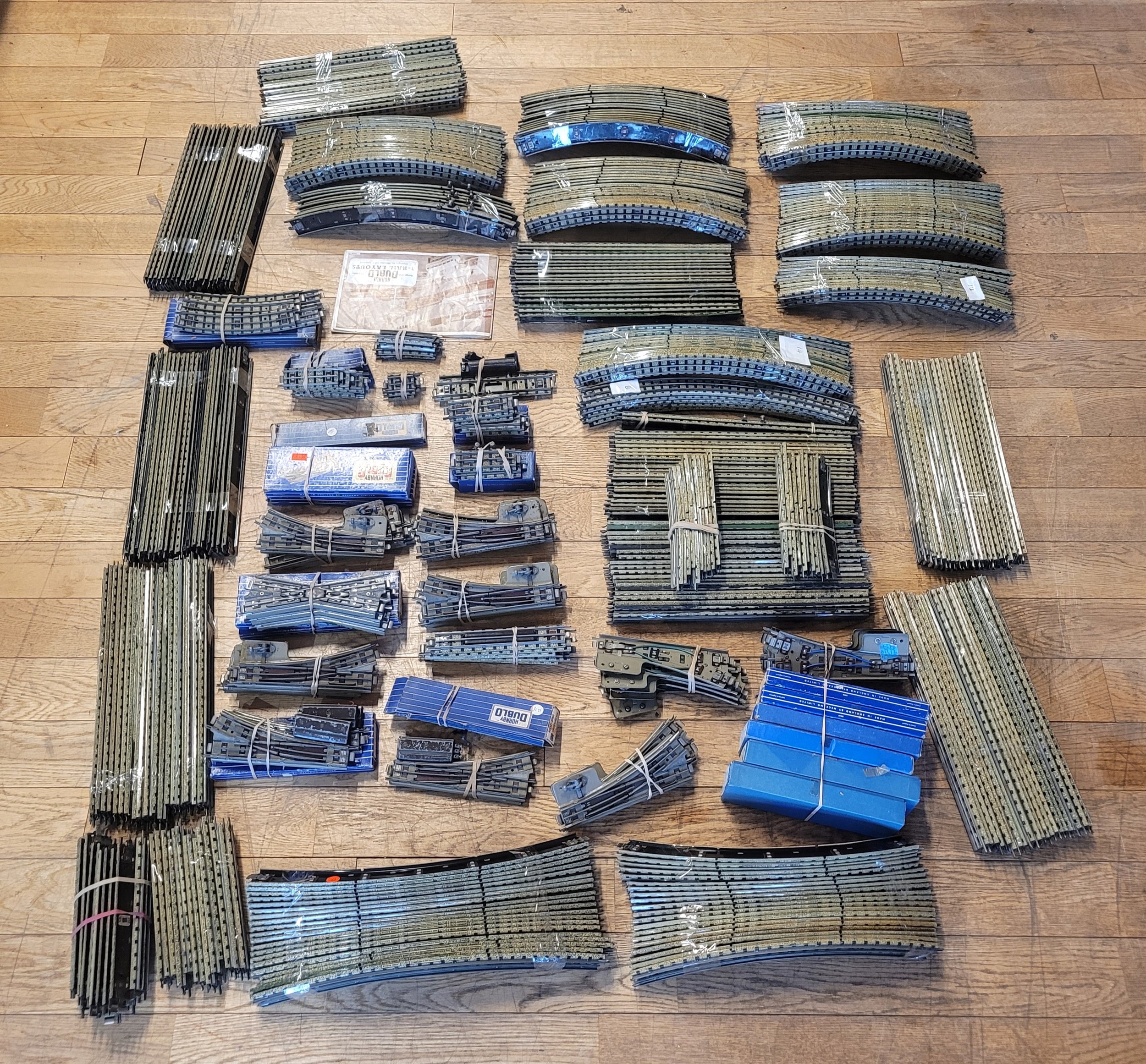 Hornby 00 Gauge Railways; A substantial quantity of loose and boxed Dublo model railway track, (see attached inventory picture) several power controllers, complete with track layout raised on a square steel base.