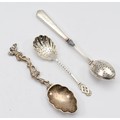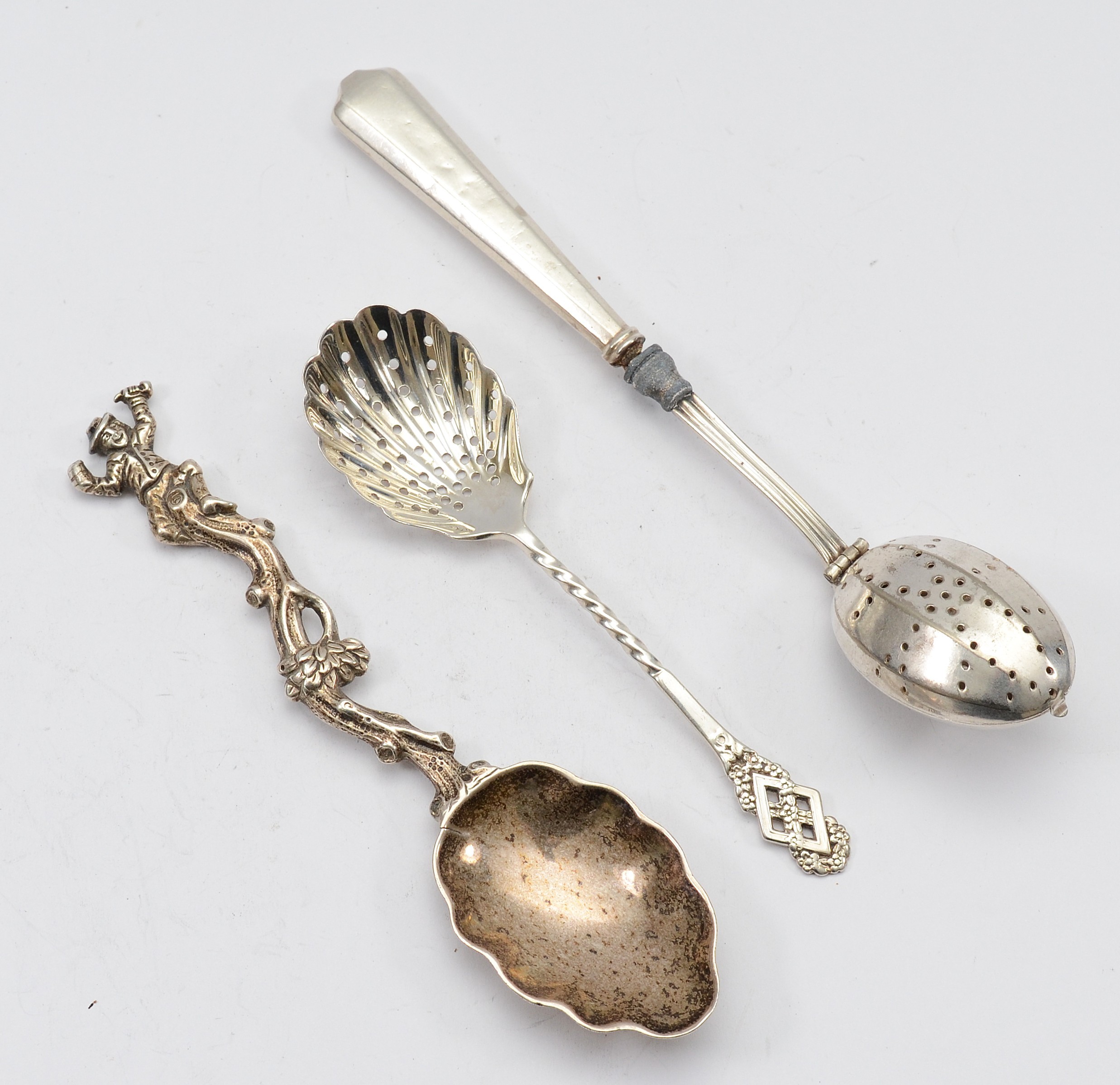 A silver souvenir spoon, London 1891, together with a sterling silver tea strainer spoon, and a silver sifter spoon, markings worn, 104gm.