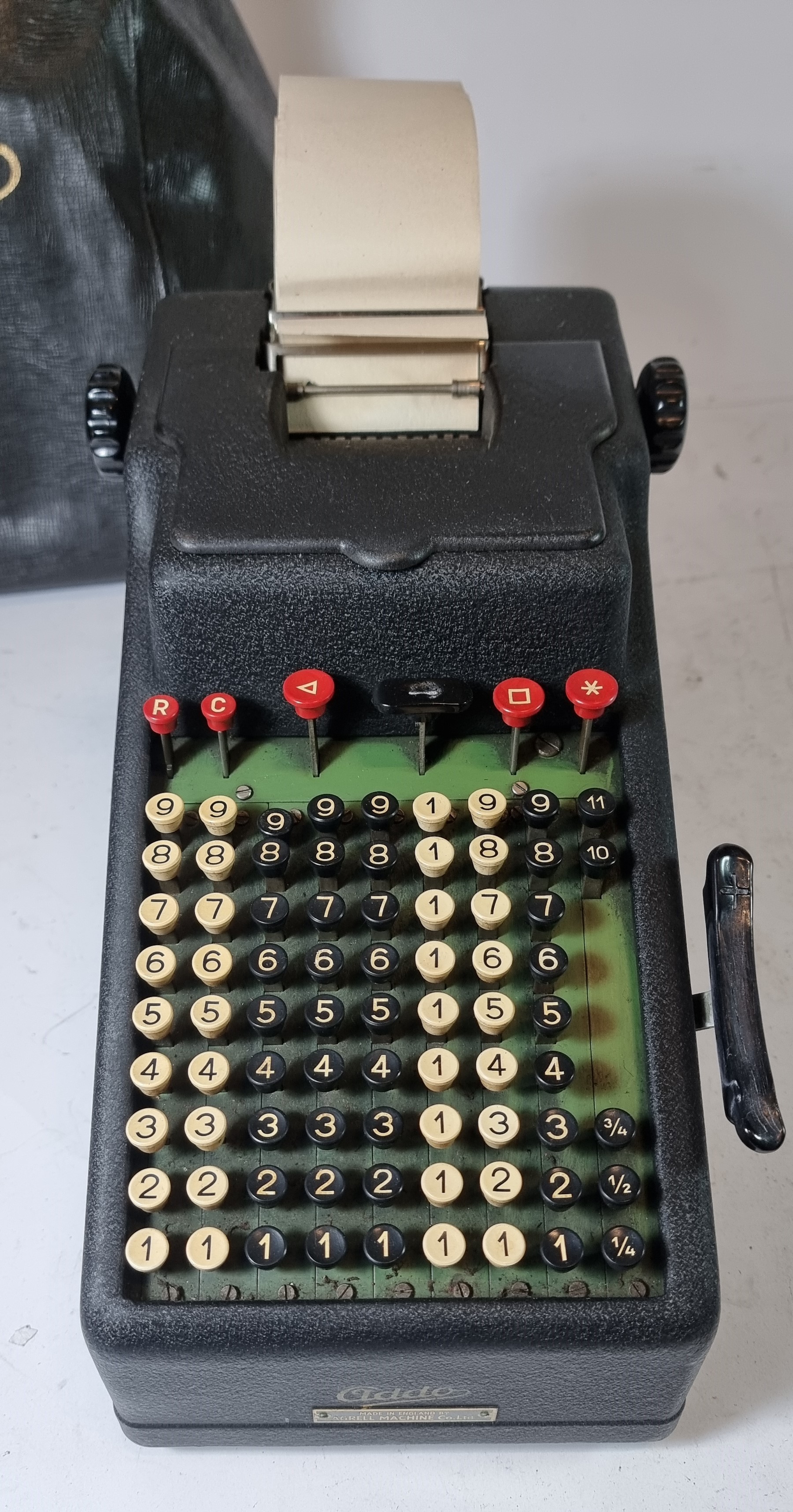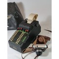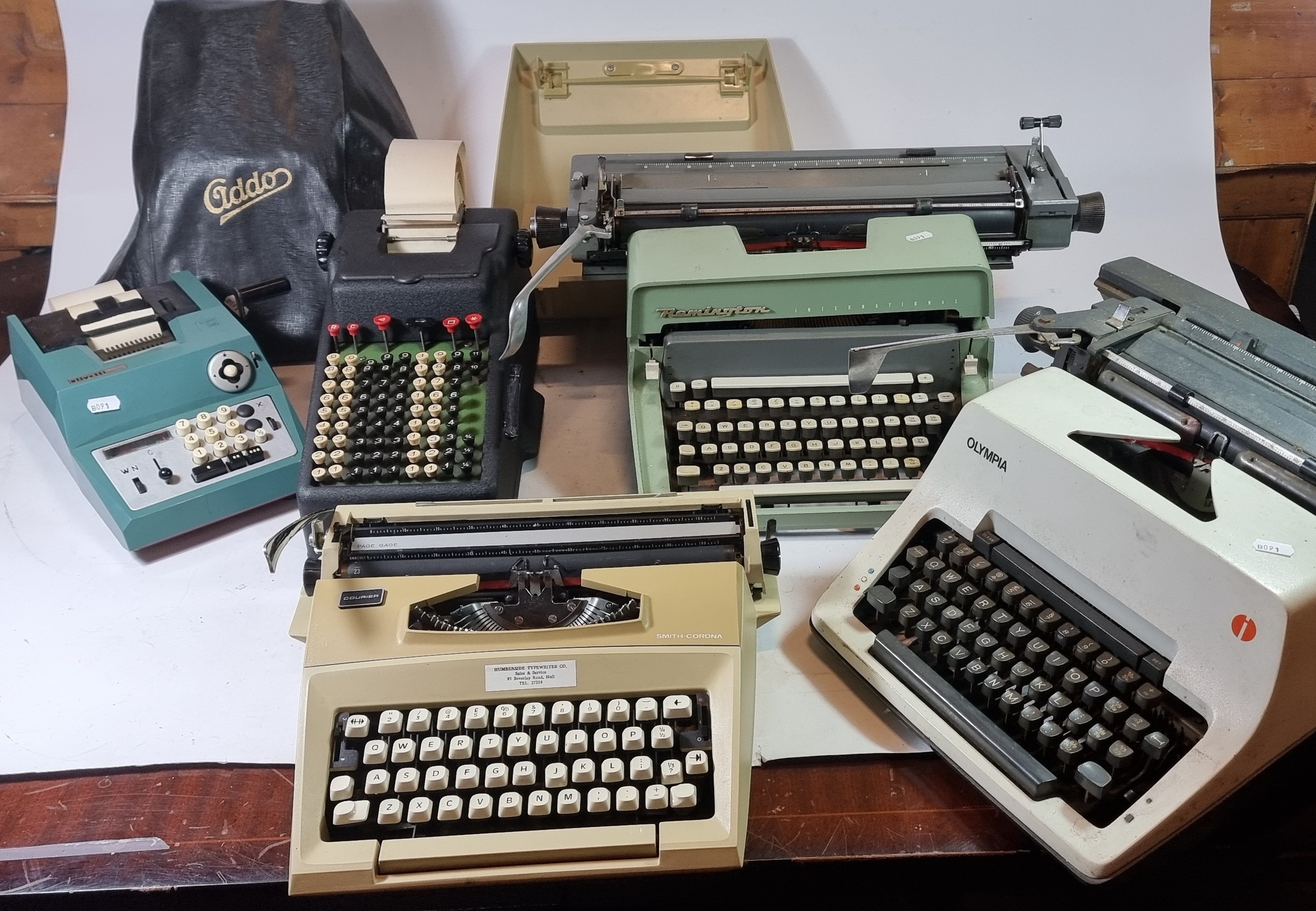 An Addo mechanical calculator, by Agrell Machine Co, with dust cover, together with an Olivetti calculator, a Smith Corona typewriter, an Olympia typewriter, a Remington typewriter and a Werra film camera