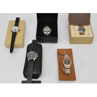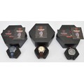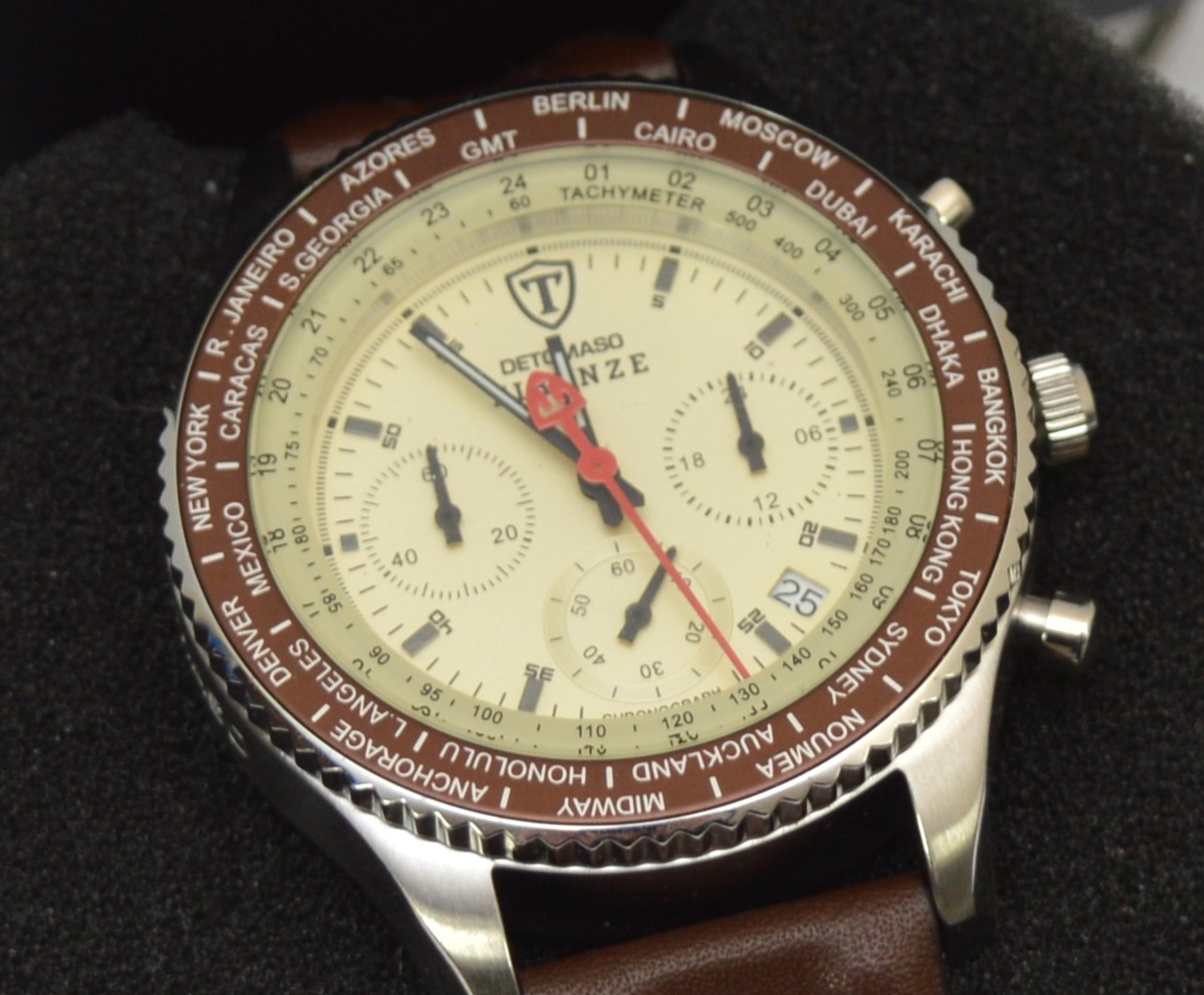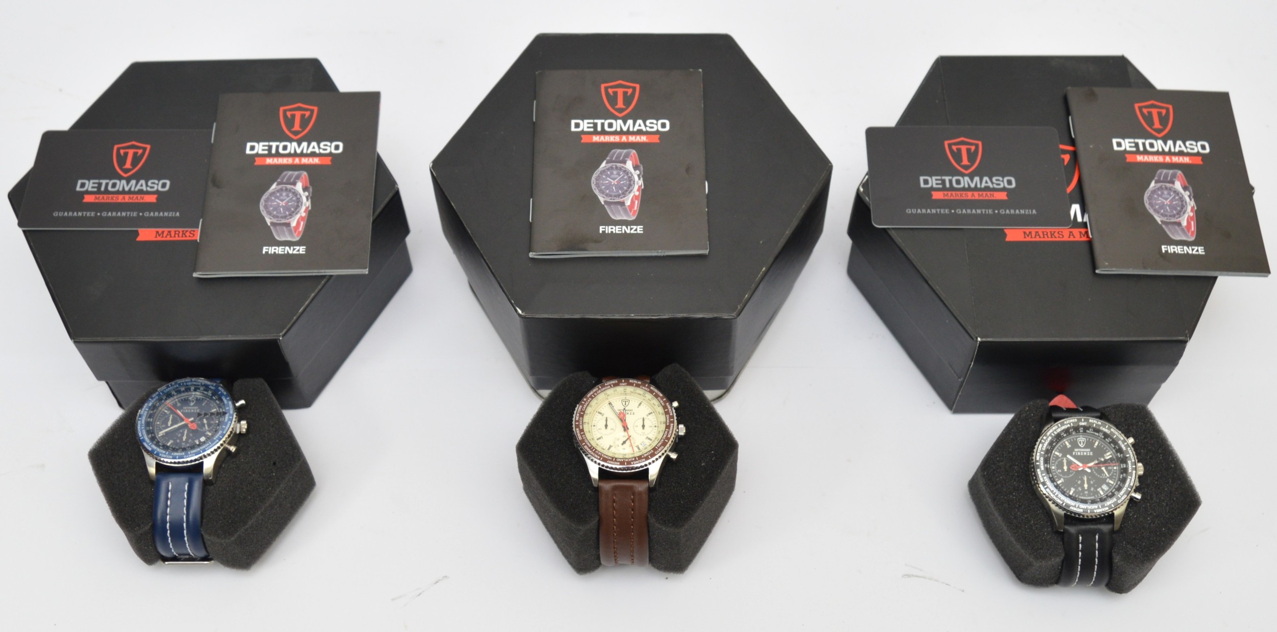 Detomaso Firenze, three stainless steel quartz gentleman's wristwatches, with brown bezel and leather strap, together with a blue bezel, blue leather strap example and a black bezel, black leather strap example, all boxed and unused. (3)