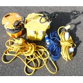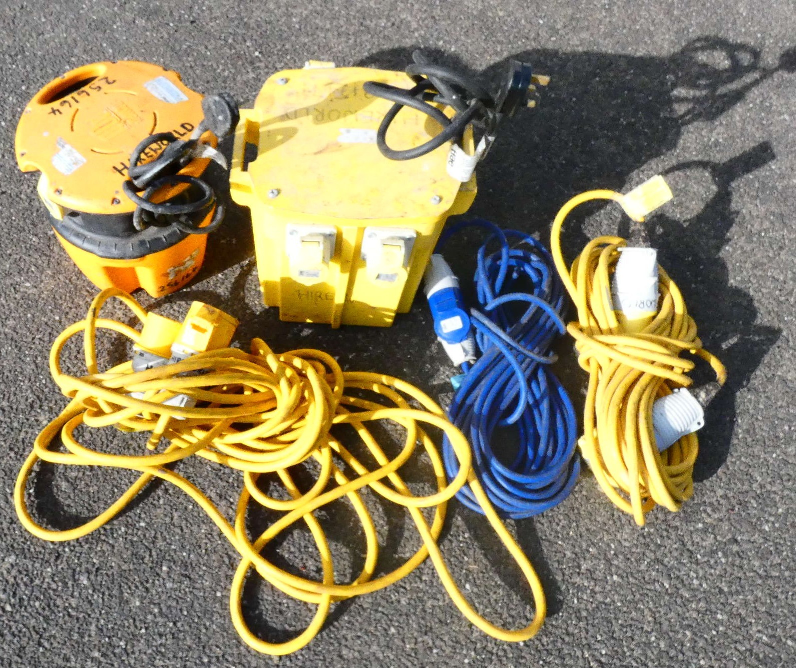 A Defender 230v - 110v power tools transformer, a Defender 100v-130v power pod, to include three compatible extension cables.