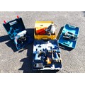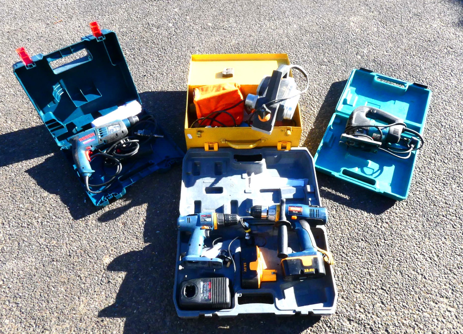A collection of power tools including, a boxed Ryobi CCD-1801 18v battery drill and a Ryobi CDI-1801 hammer drill with charger, a boxed Bosch GBH2-18RE 240v hammer drill, a boxed Elu MFF80 220v 850w planer with dust collection bag, a boxed Makita 4340CT 230v 720w jigsaw. (4).