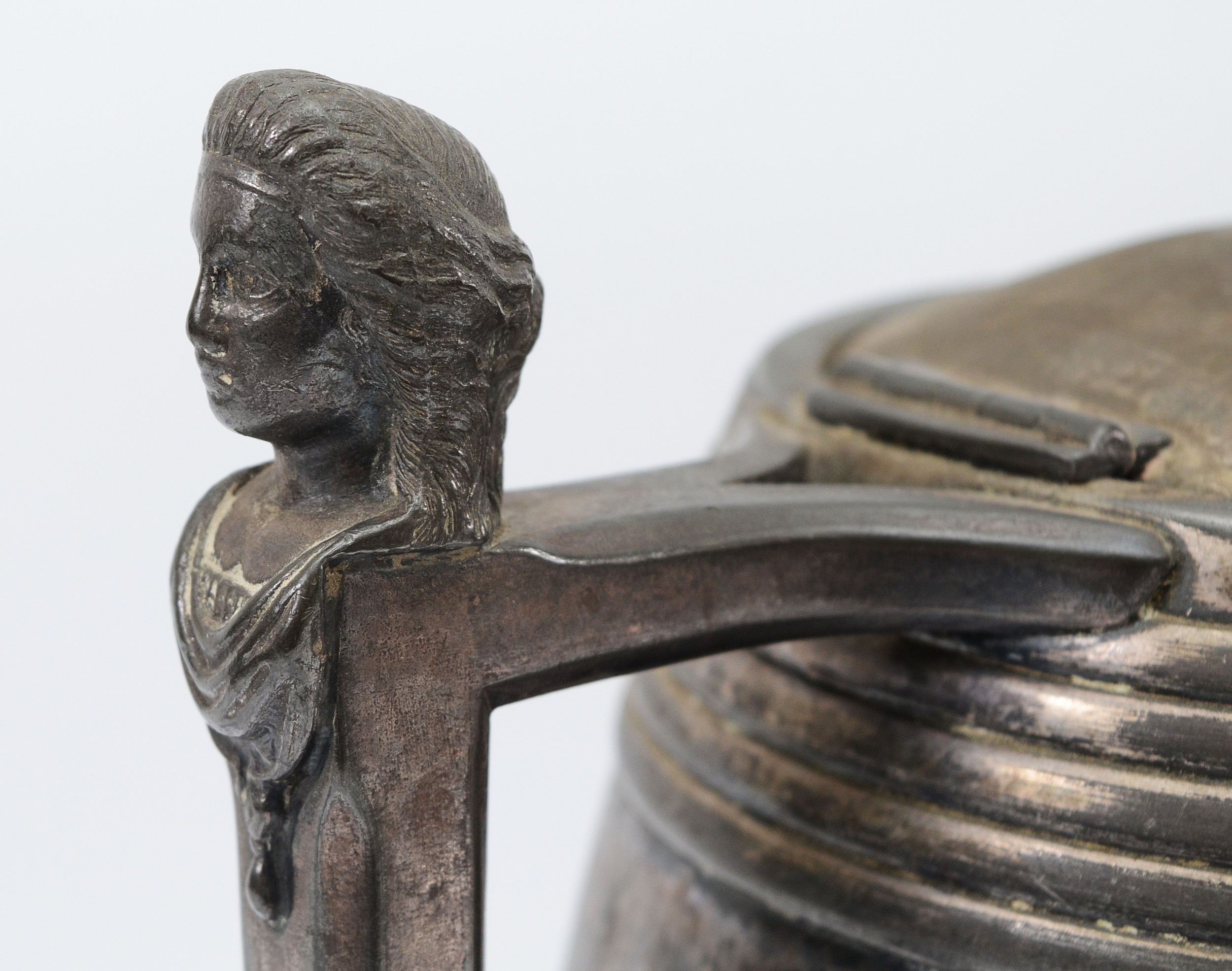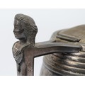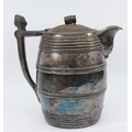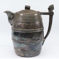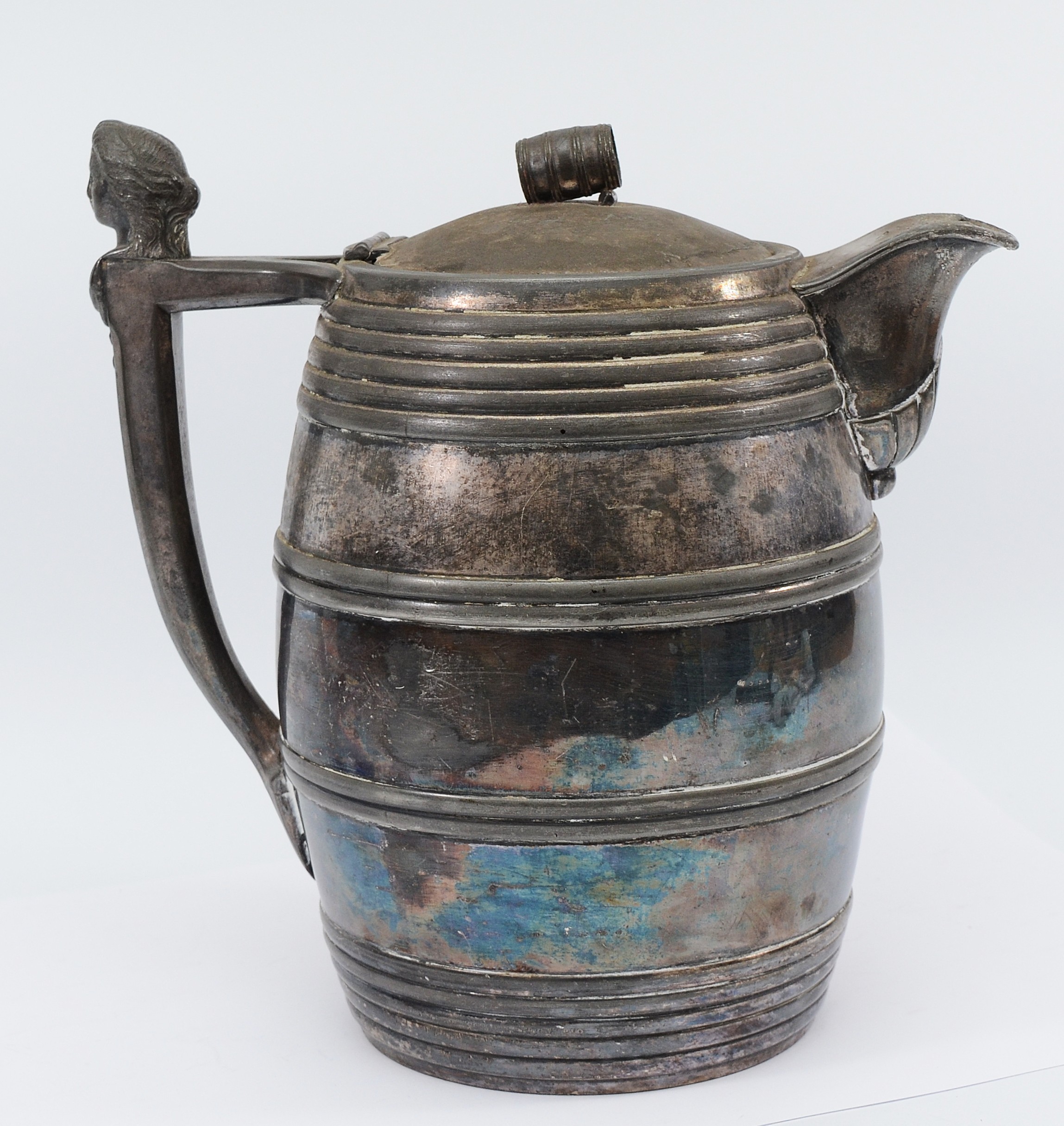 A Meriden B.Company double lined pewter beer pitcher, in the form of a barrel with barrel decoration to the lid, and the head of a woman to the handle, holds approximately 3 quarts, 27cm tall.