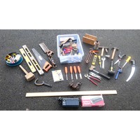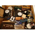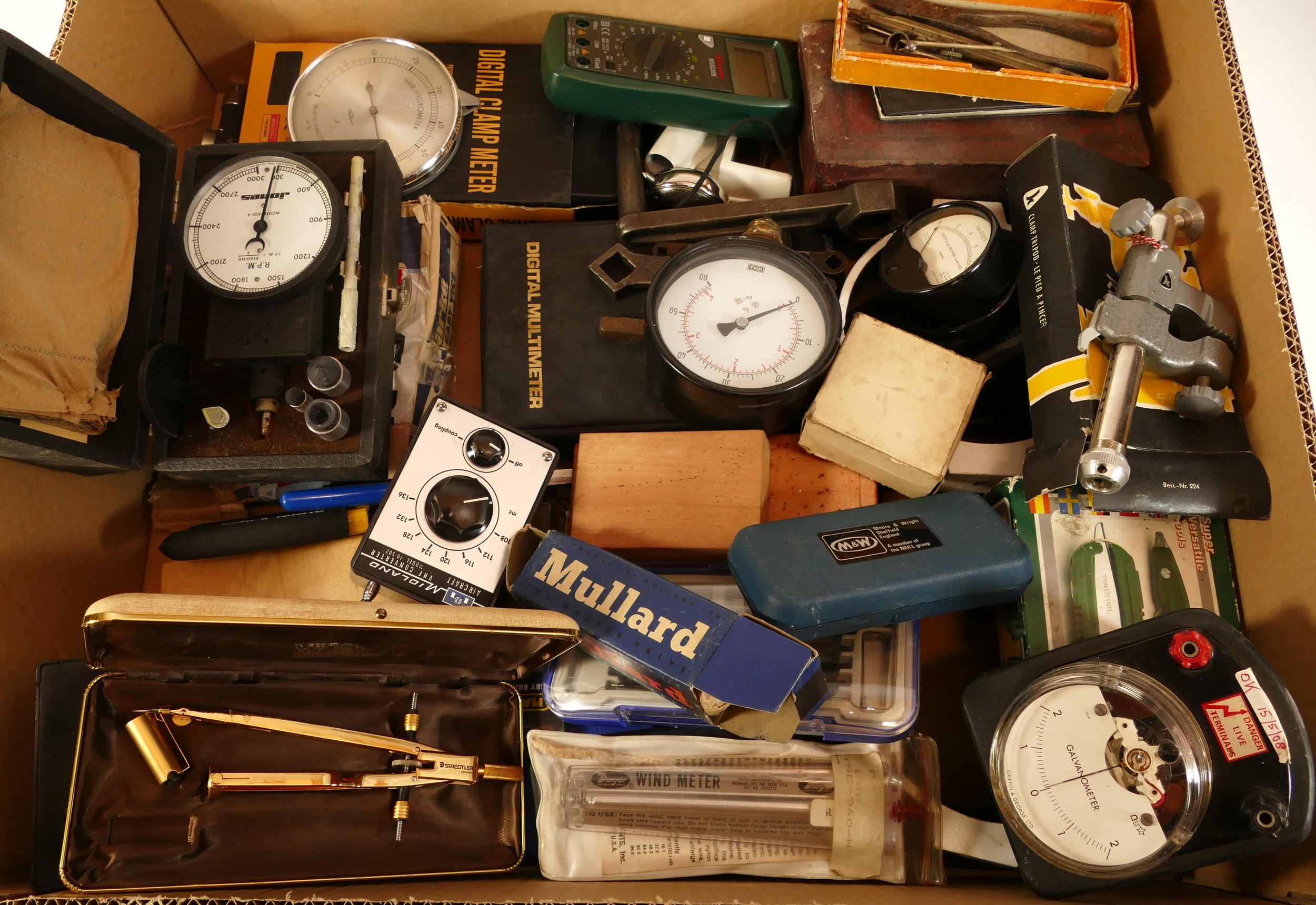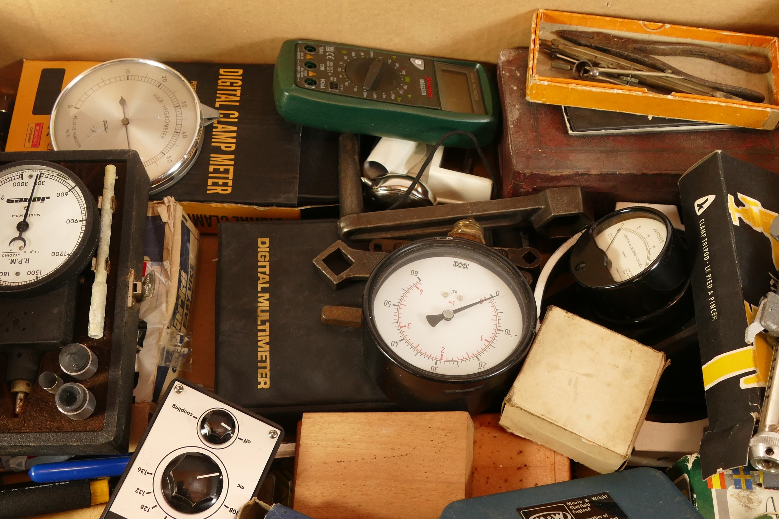 A collection of amp meters, pressure gauges, digital clamp meter, VHF converter, also a Staedtler compass, baby vice, bench clamps and spanners.