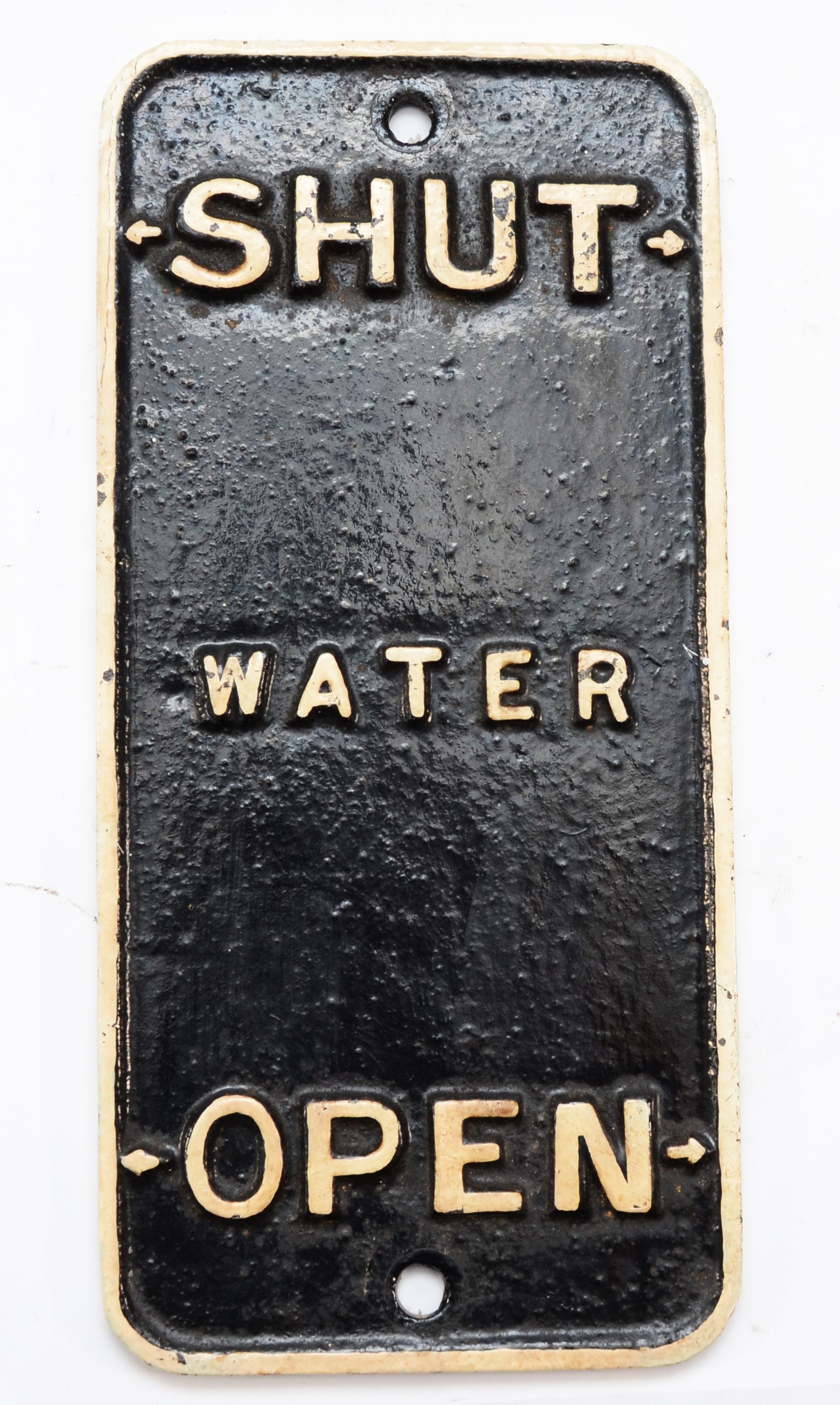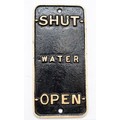 An L.M.S. steam locomotive water injector tender plate indicator, 'Shut-Water-Open'.