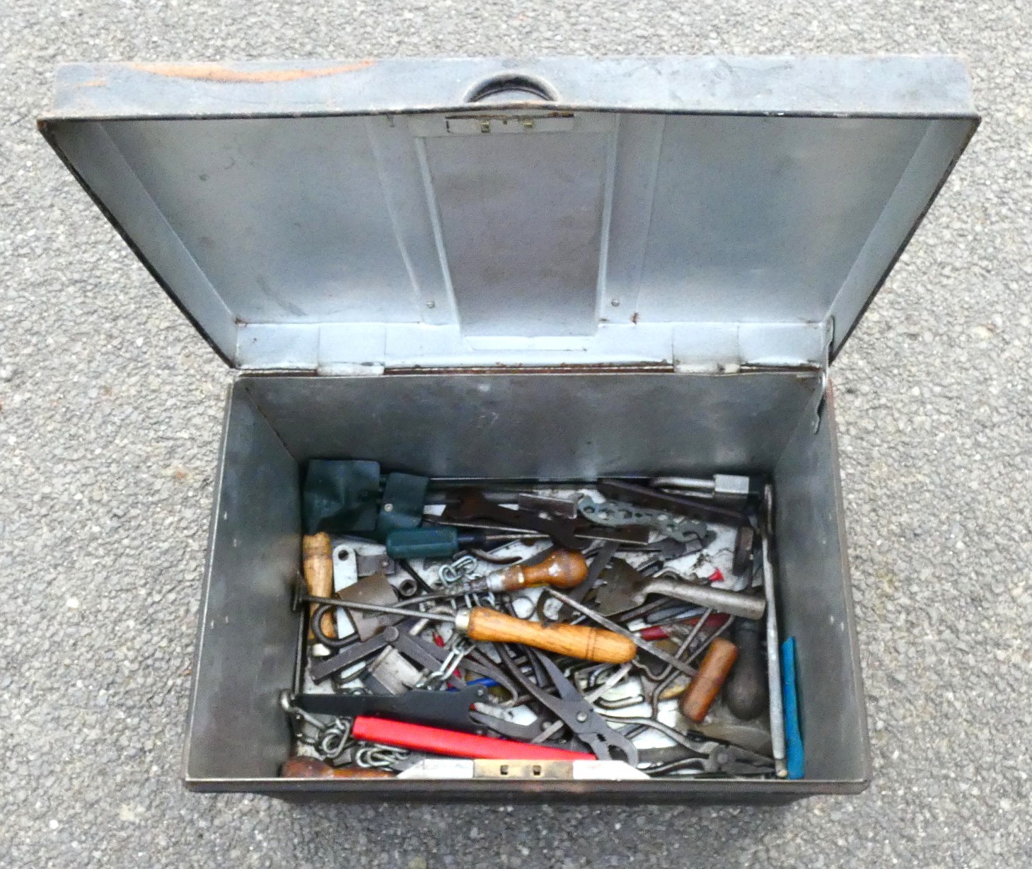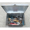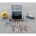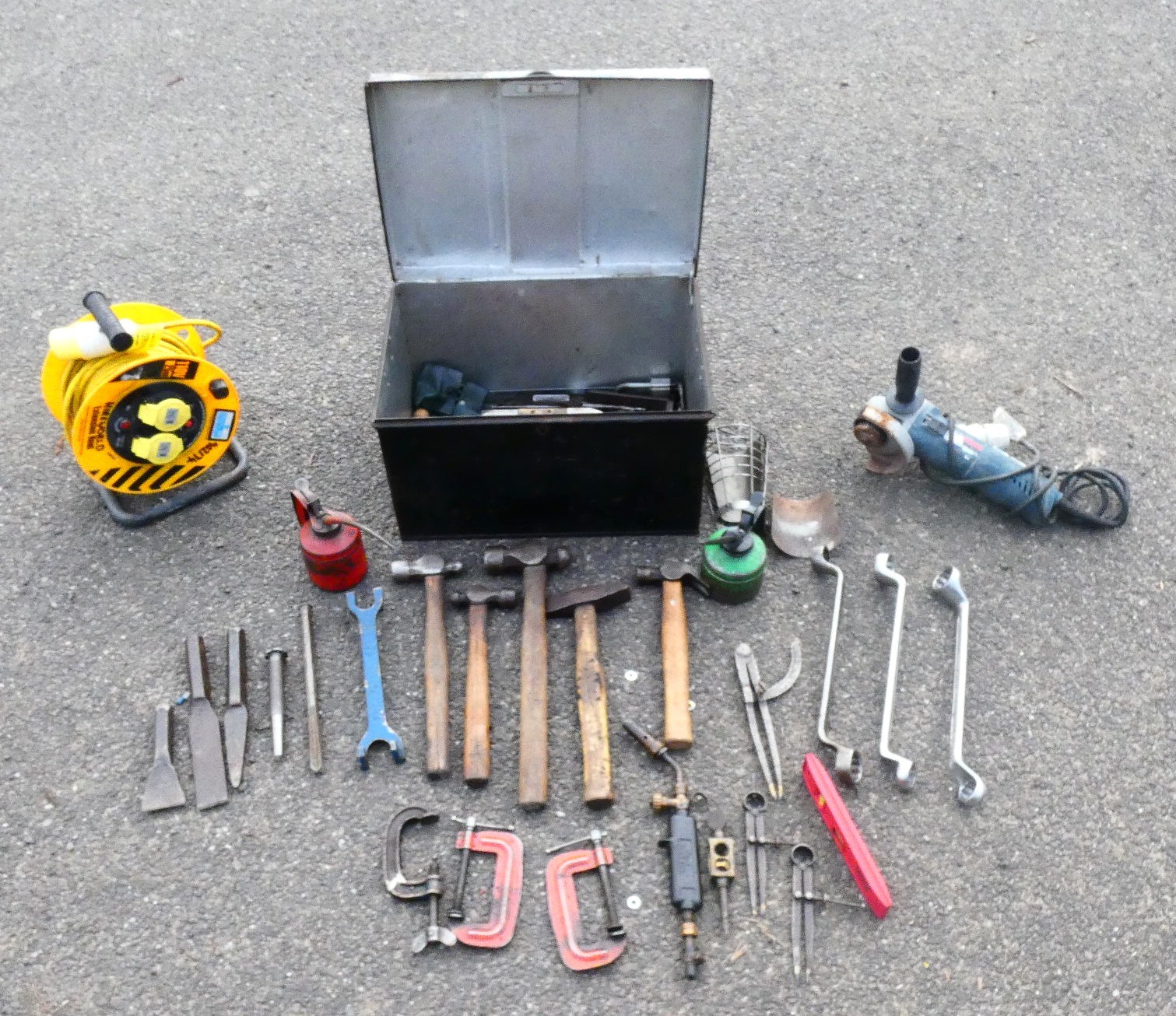 A metal tool box containing a selection of engineering hand tools to include hammers, 'G' clamps, cold chisels and measuring gauges, also a Bosch GWS 11-125 110v 1060w disc grinder to include a 110v power unit extension reel.