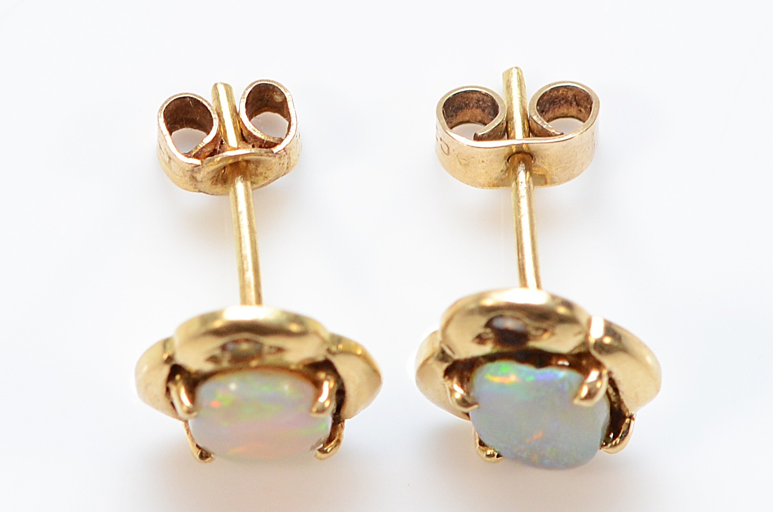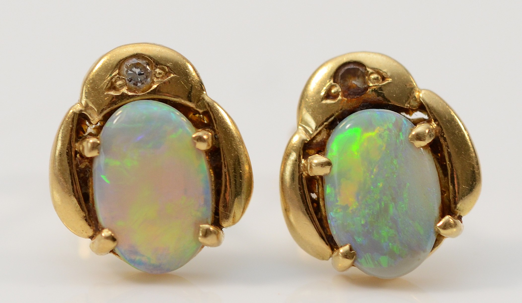 A pair of 9ct gold opal diamond earrings with scroll backs, 2.3g