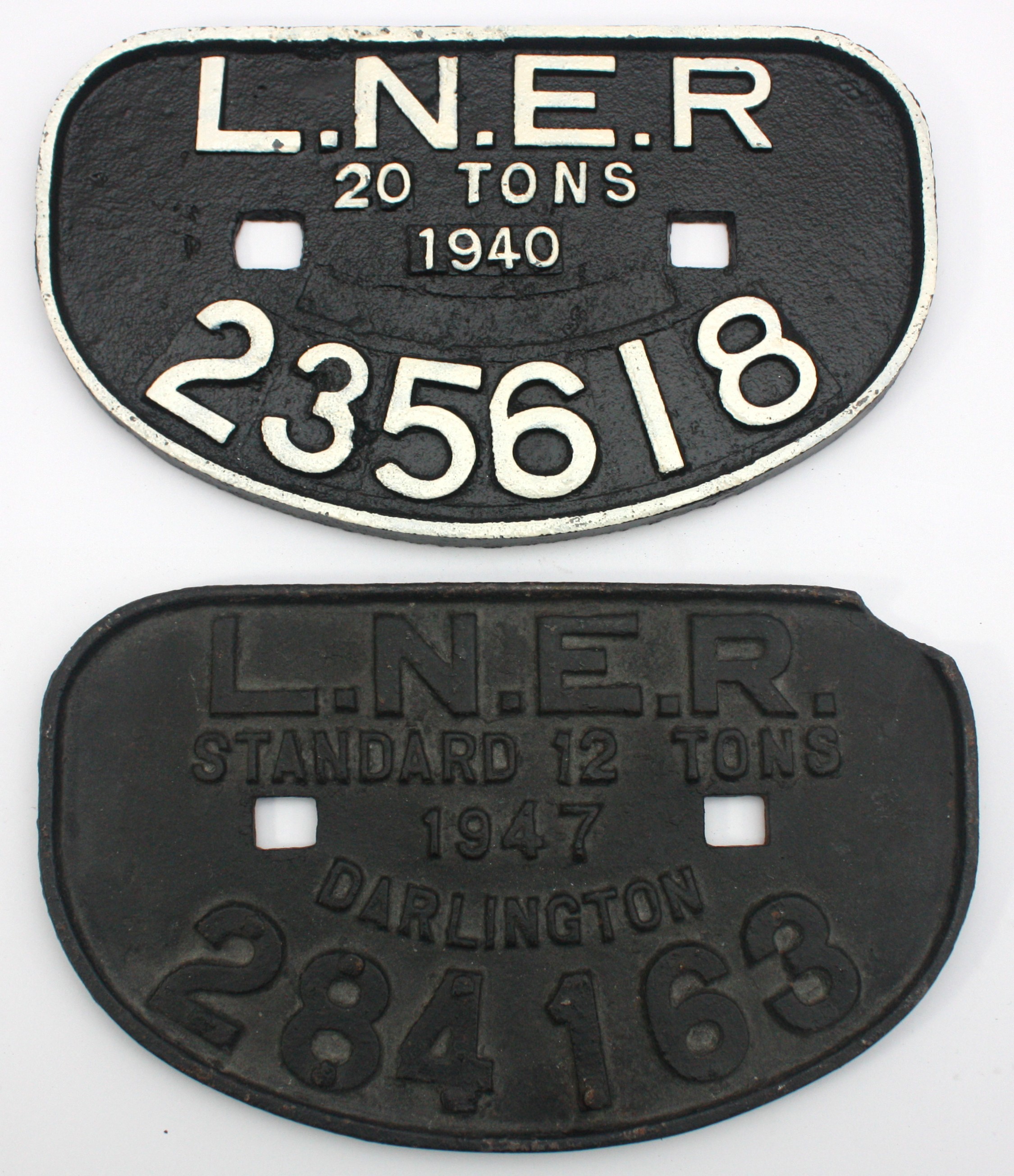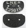 Two L.N.E.R "D" wagon plates- 1947 12 tons, 284163 and 1940 20 tons, 235618, 28cm x 17.