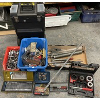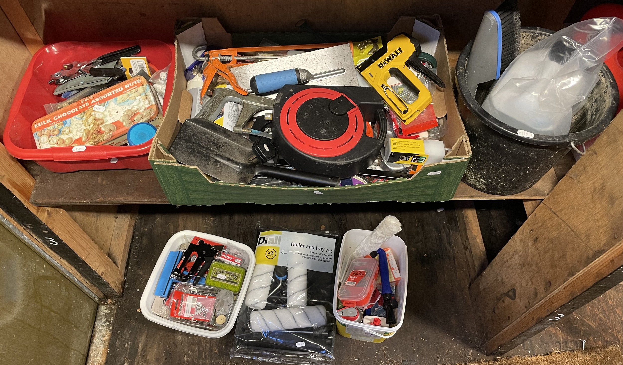 A collection of tools and hardware, to include, a leather punch, paint rollers, and a EXT lead. (5)