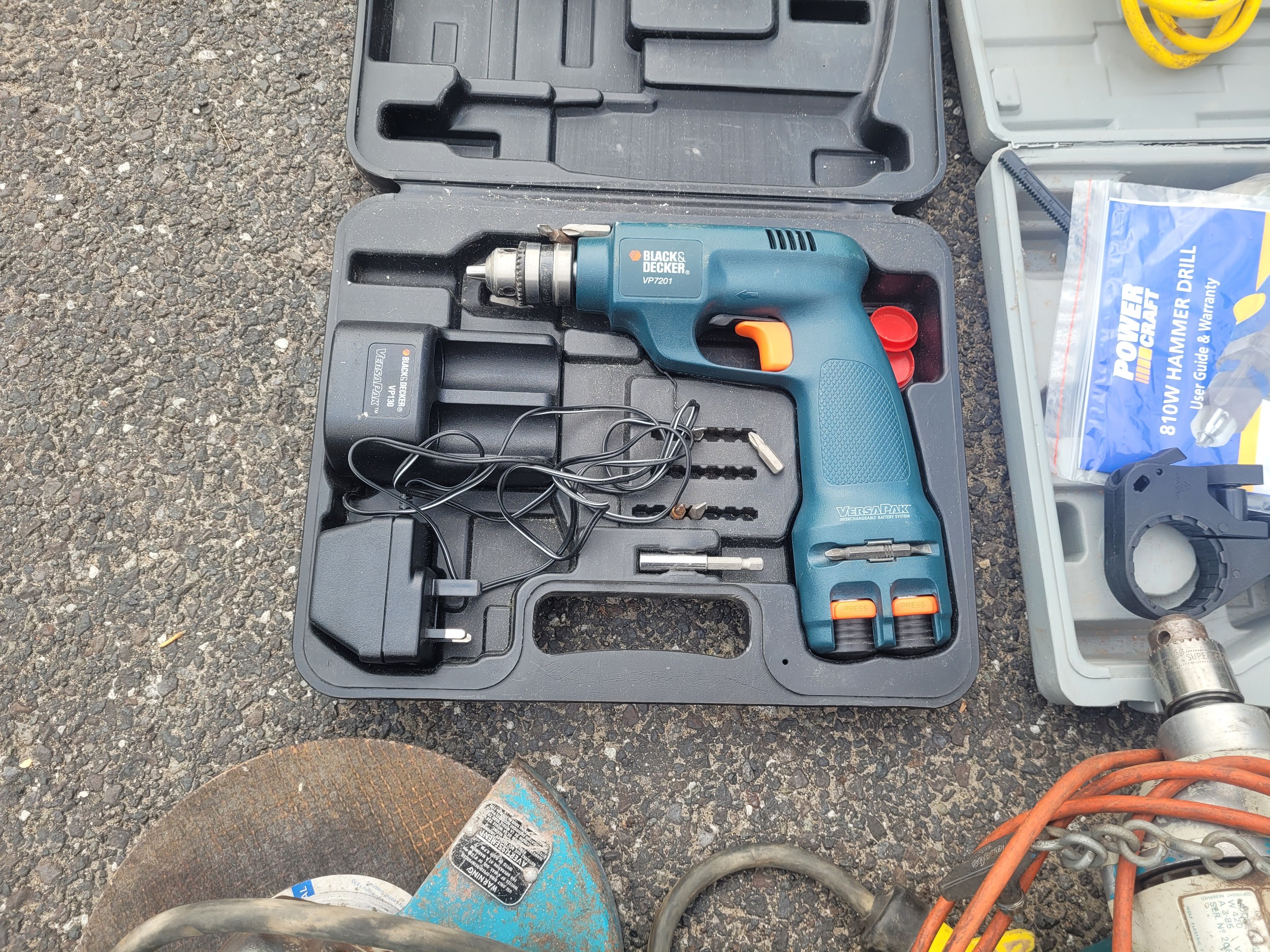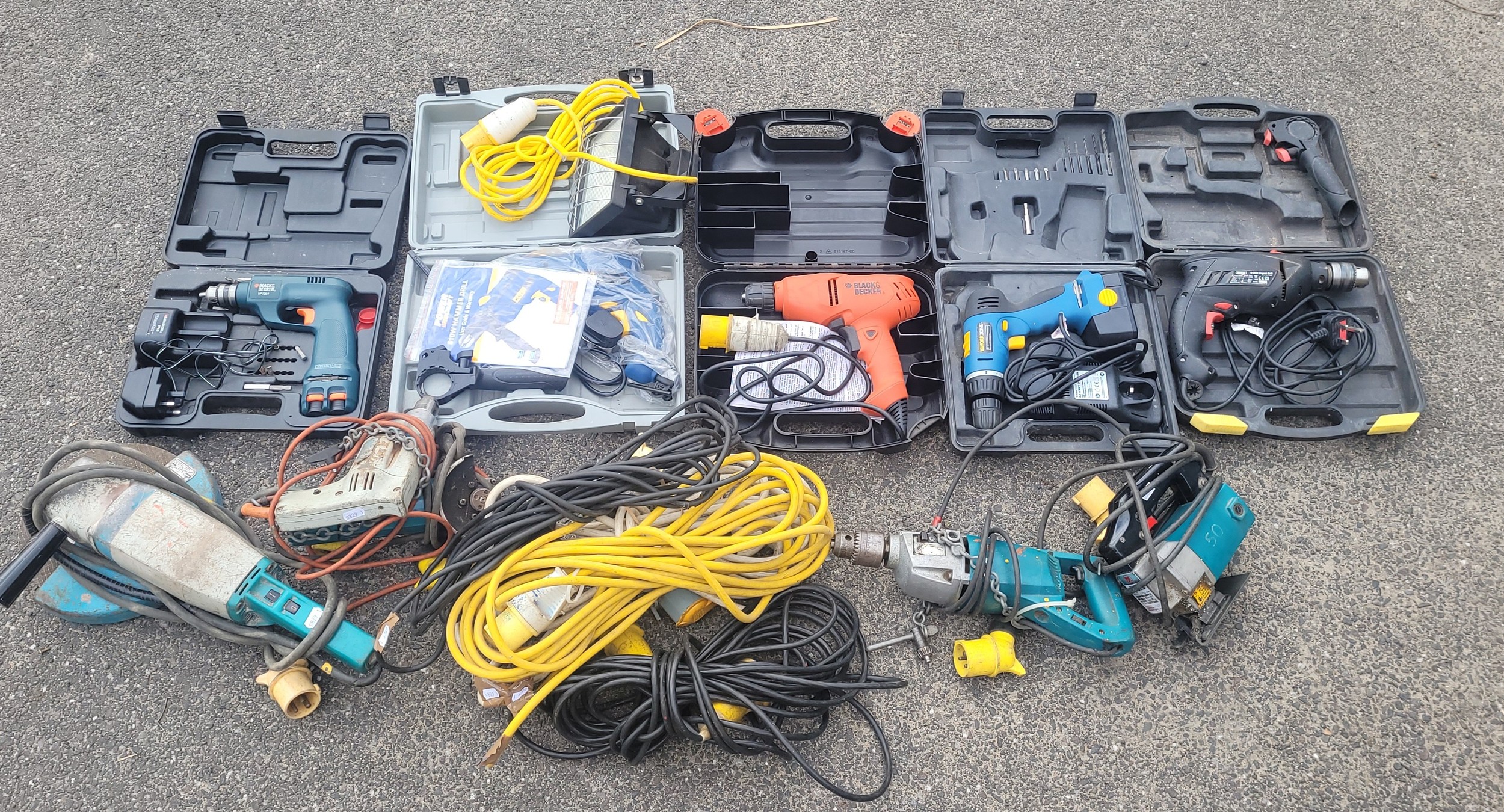 A selection of power tools to include a boxed Power Craft 240v 810w hammer drill, a boxed Black and Decker DR201 120v drill, a boxed Black and Decker VP7201 Versa Pak battery drill with batteries and charger, a boxed Work Zone WWCD 18/11 18v battery drill to include battery and charger, a boxed Draper Red Line 240v 810w impact drill, Makita 110v 4 speed drill, Makita 4300BV 110v jigsaw, Makita 9501B 110v 385w disc grinder, Wolf 110v heavy duty grinder, Wolf 110v 420w drill, a 240v extension cable, a 110v 500w halogen lamp with cable also, three 110v extension cables.
