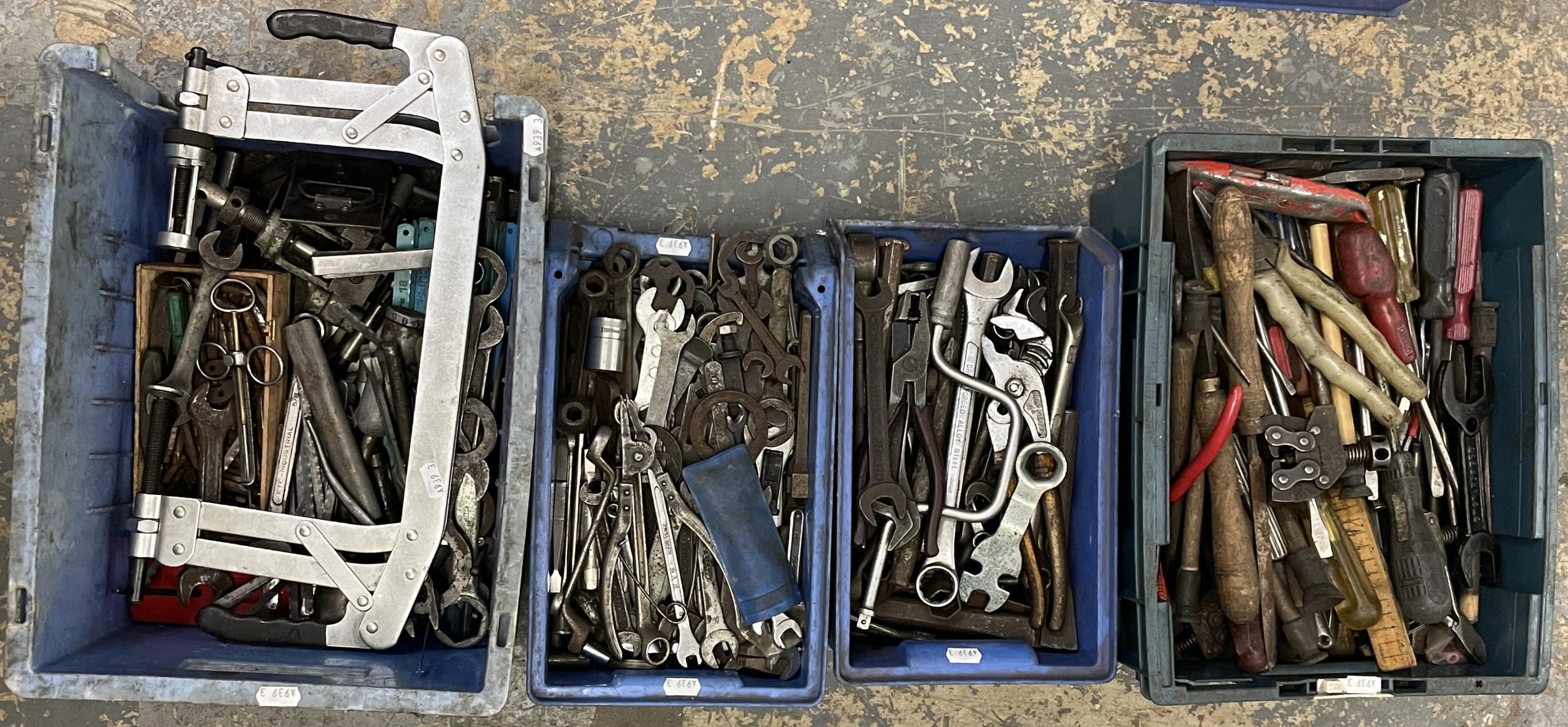 Four containers of mechanic's tools, to include, spanners, chain splitters and pliers. (4)