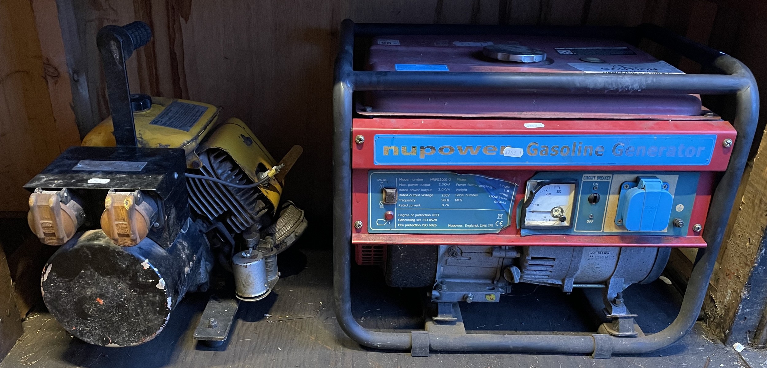 Two petrol generators, to include, a 9A 110V single-phase with Villiers engine and a NuPower single-phase 230V with Honda engine, model no. MNPG2000.
