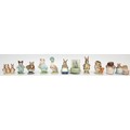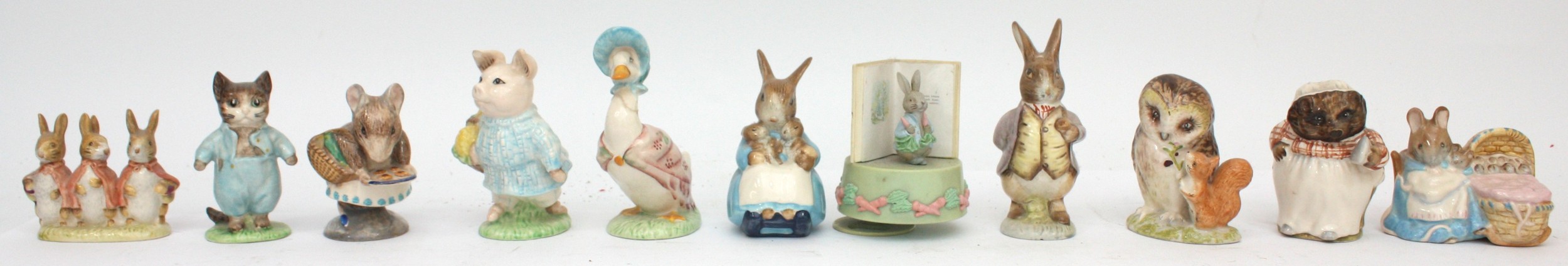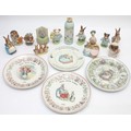 Eleven Beatrix Potter ornaments, Beswick and Royal Albert, to include, Jemima Puddleduck, Appley Dapply, Mrs Rabbit & Bunnies, and Tom Kitten, together with four Peter Rabbit decorative plates, a Peter Rabbit wine-up musical ornament, and a sealed bottle of Woods of Windsor talcum powder. (17)