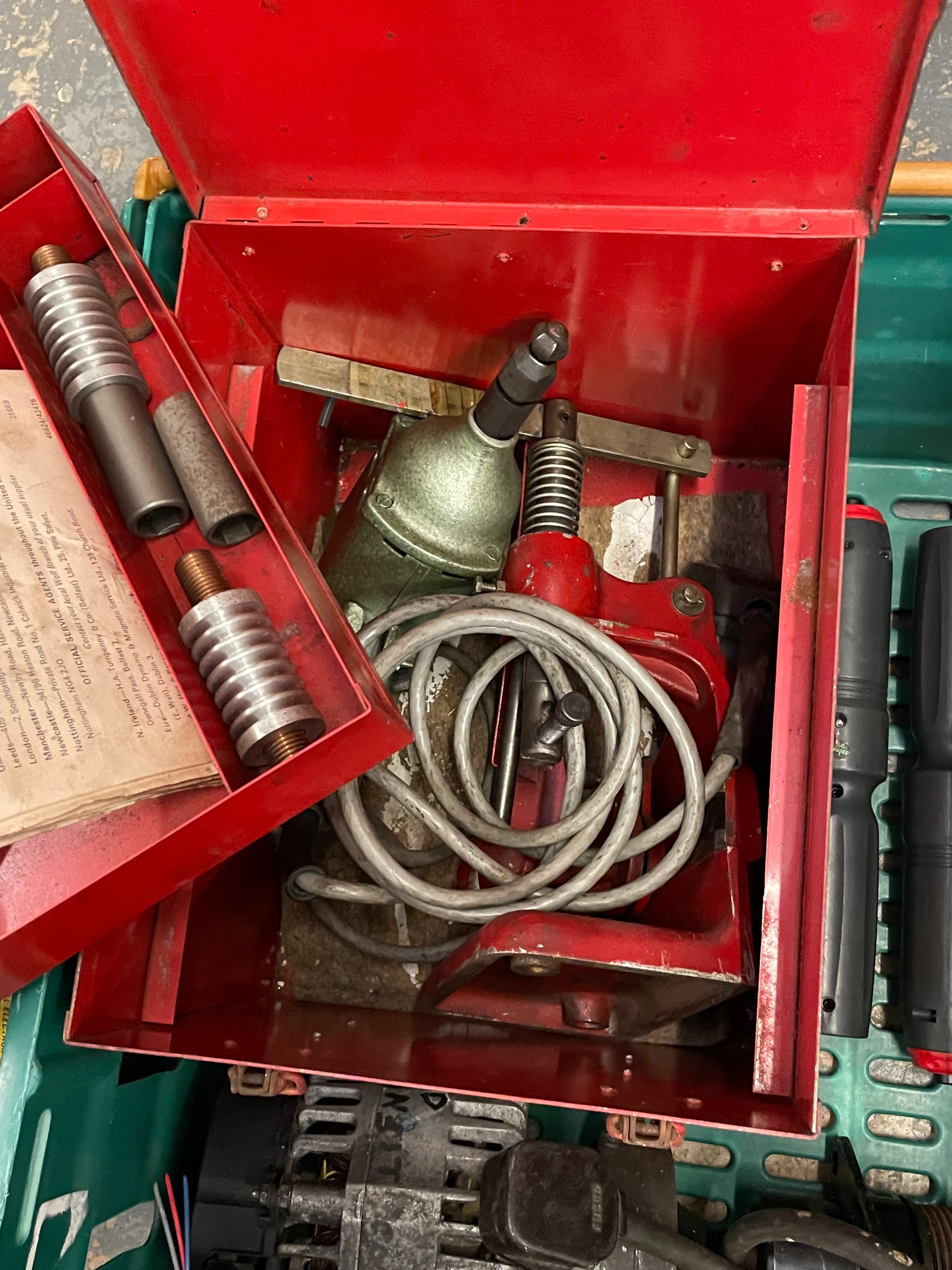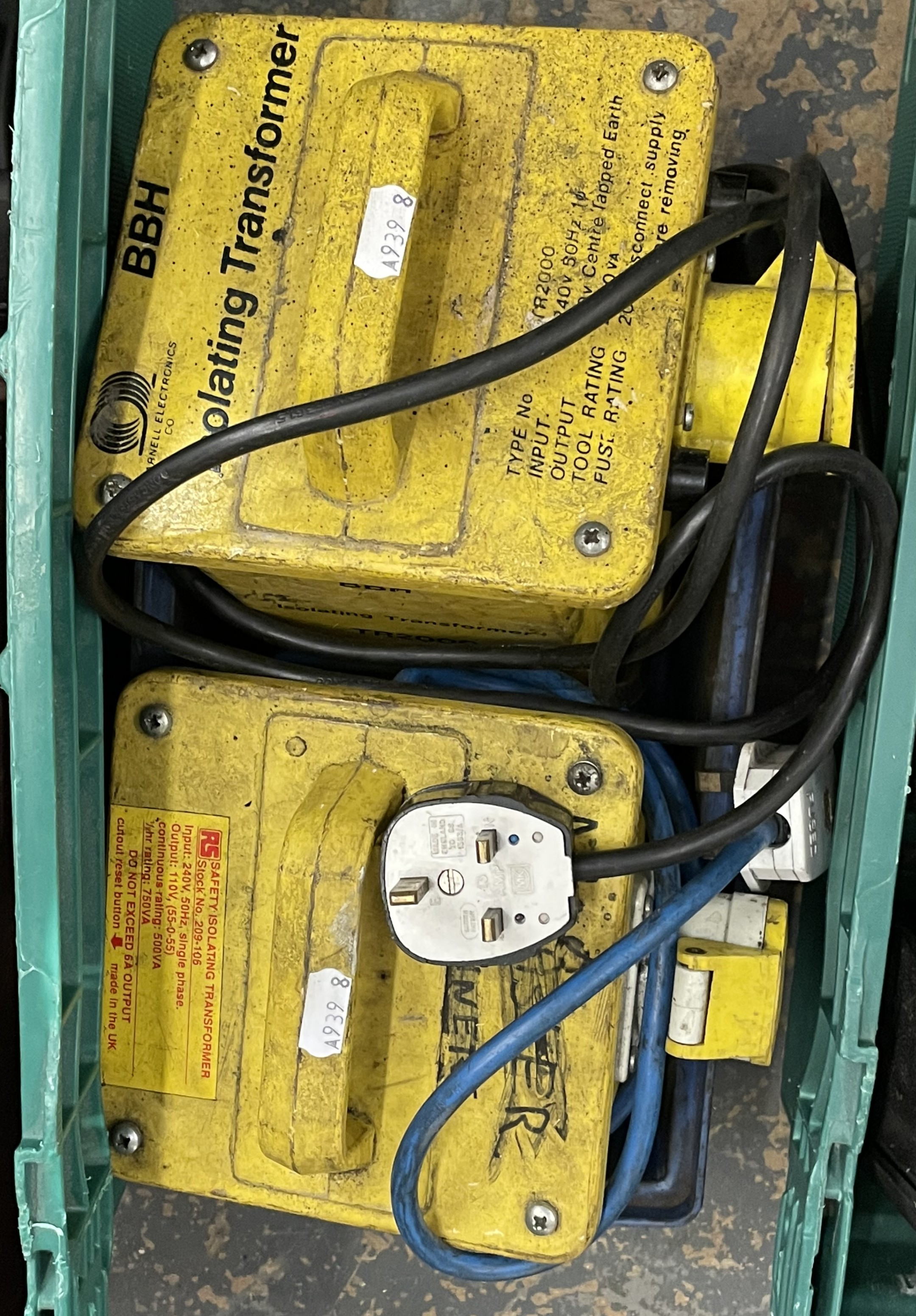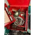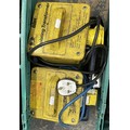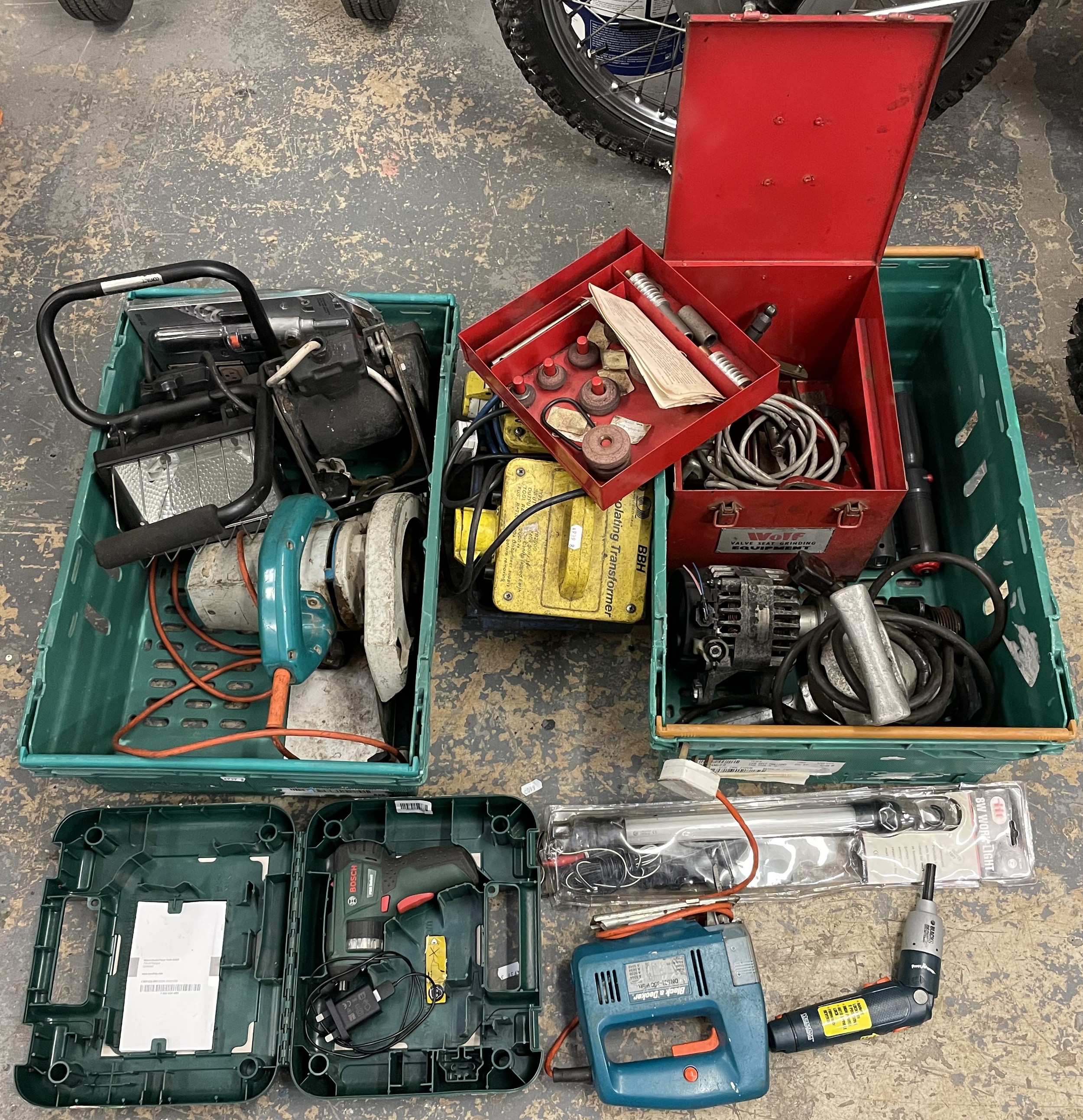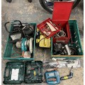 Two boxes of power tools, to include, a Bosch 3.6V screwdriver, Wolf ripsaw, two 110V transformers, work lights, and a Black & Decker jigsaw. (3)