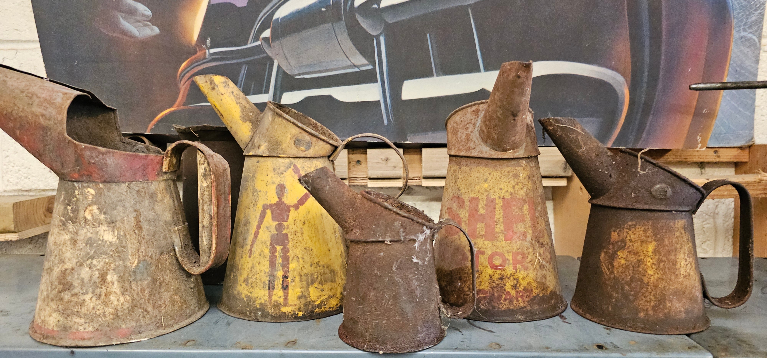 Two Shell quart oil pourers and four other pourers (6)