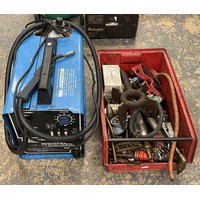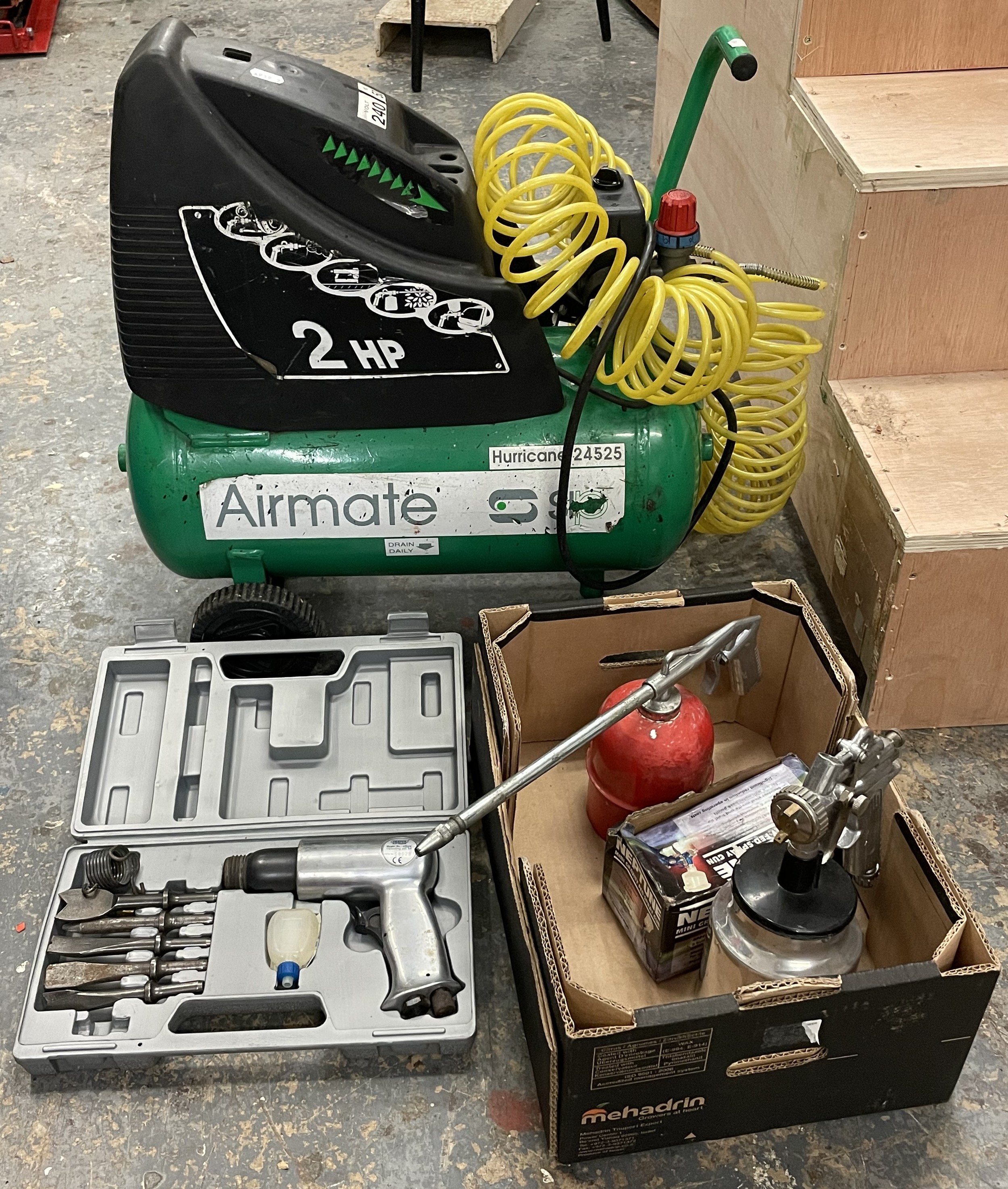 An Airmate 2HP single-phase compressor, model. Hurricane 24525, 240V, together with a tray of air tools. (2)