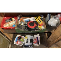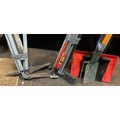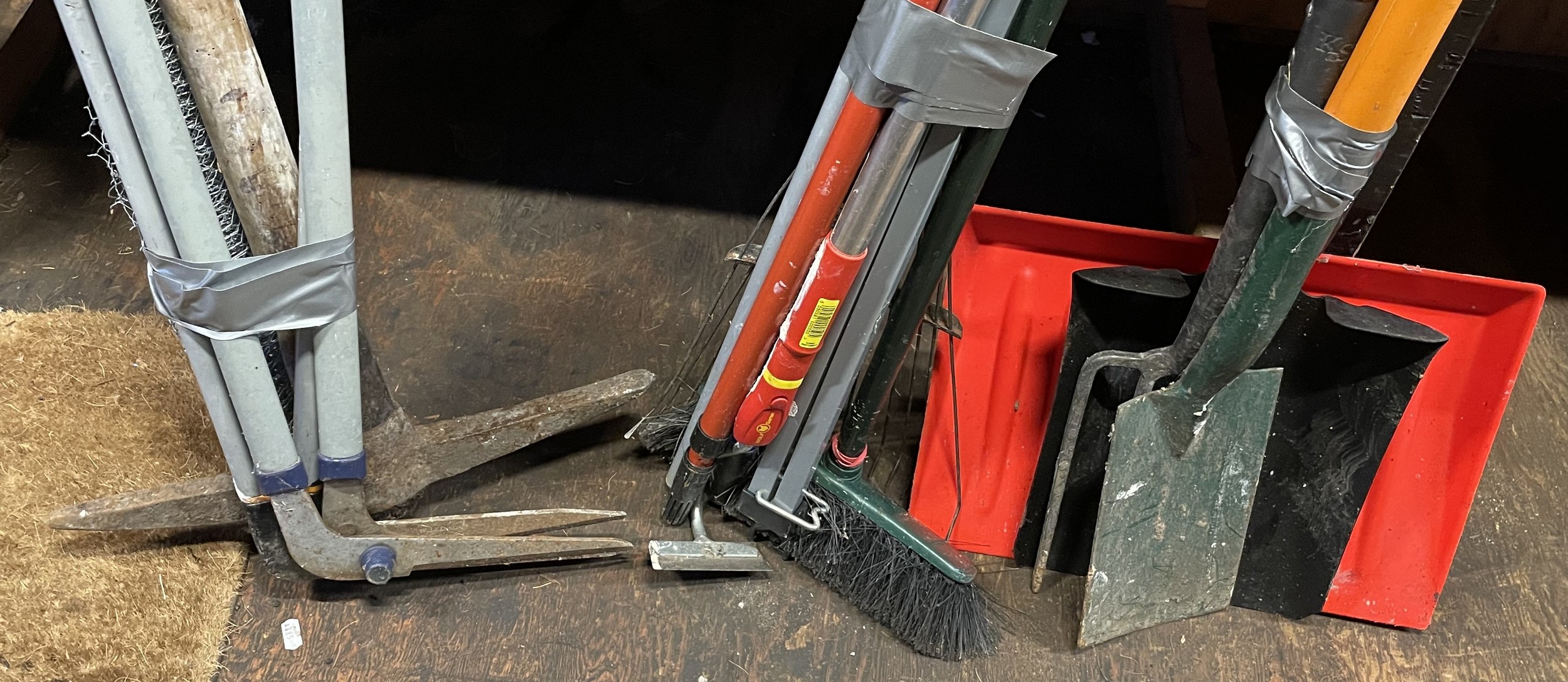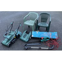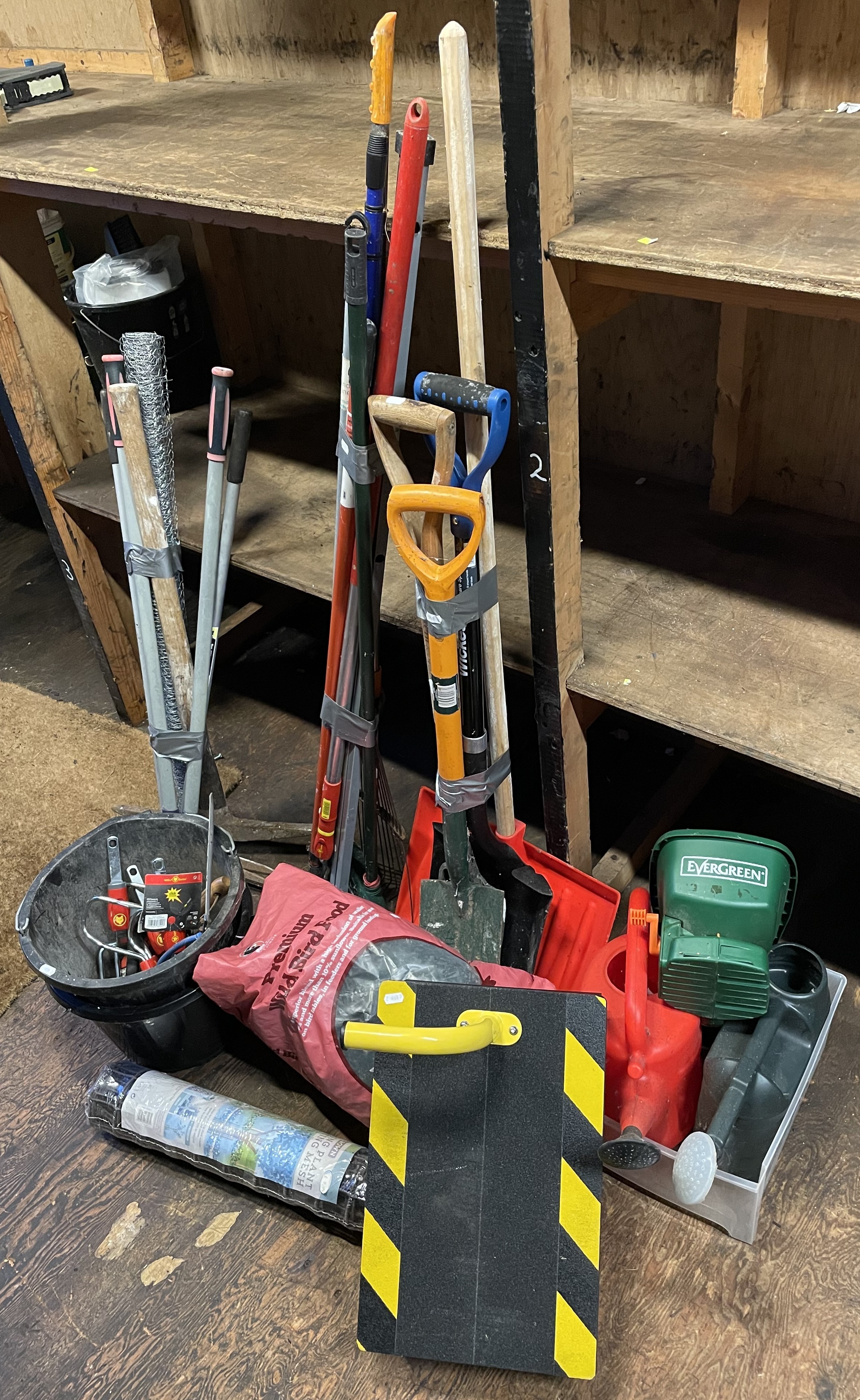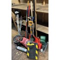 An assortment of gardening tools, to include, watering cans, a safety step, and a small tarpaulin. (7)