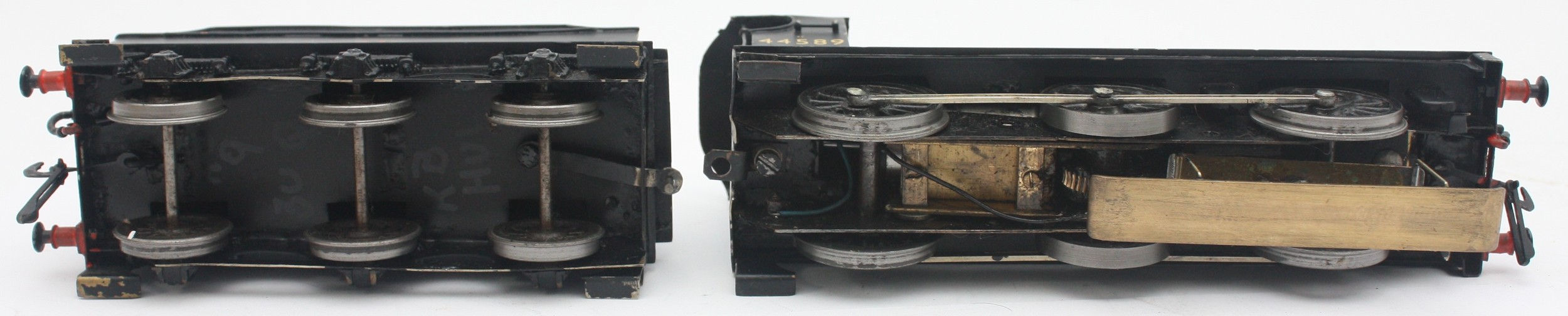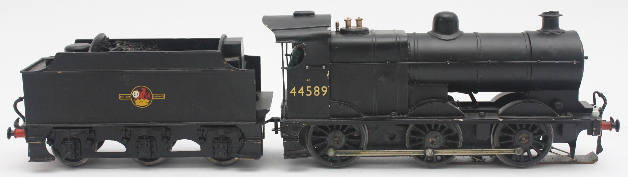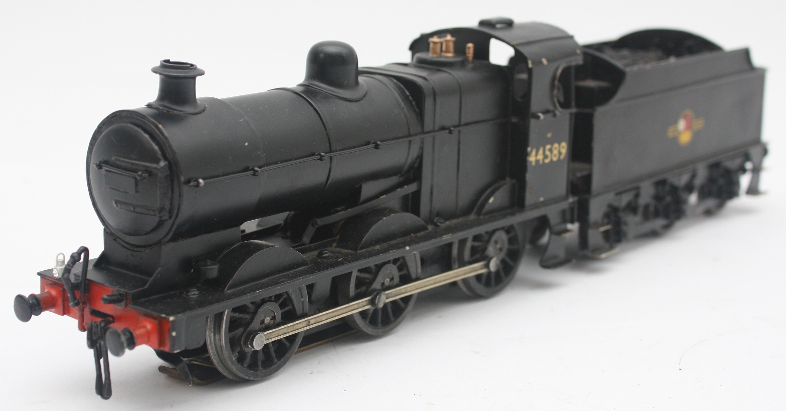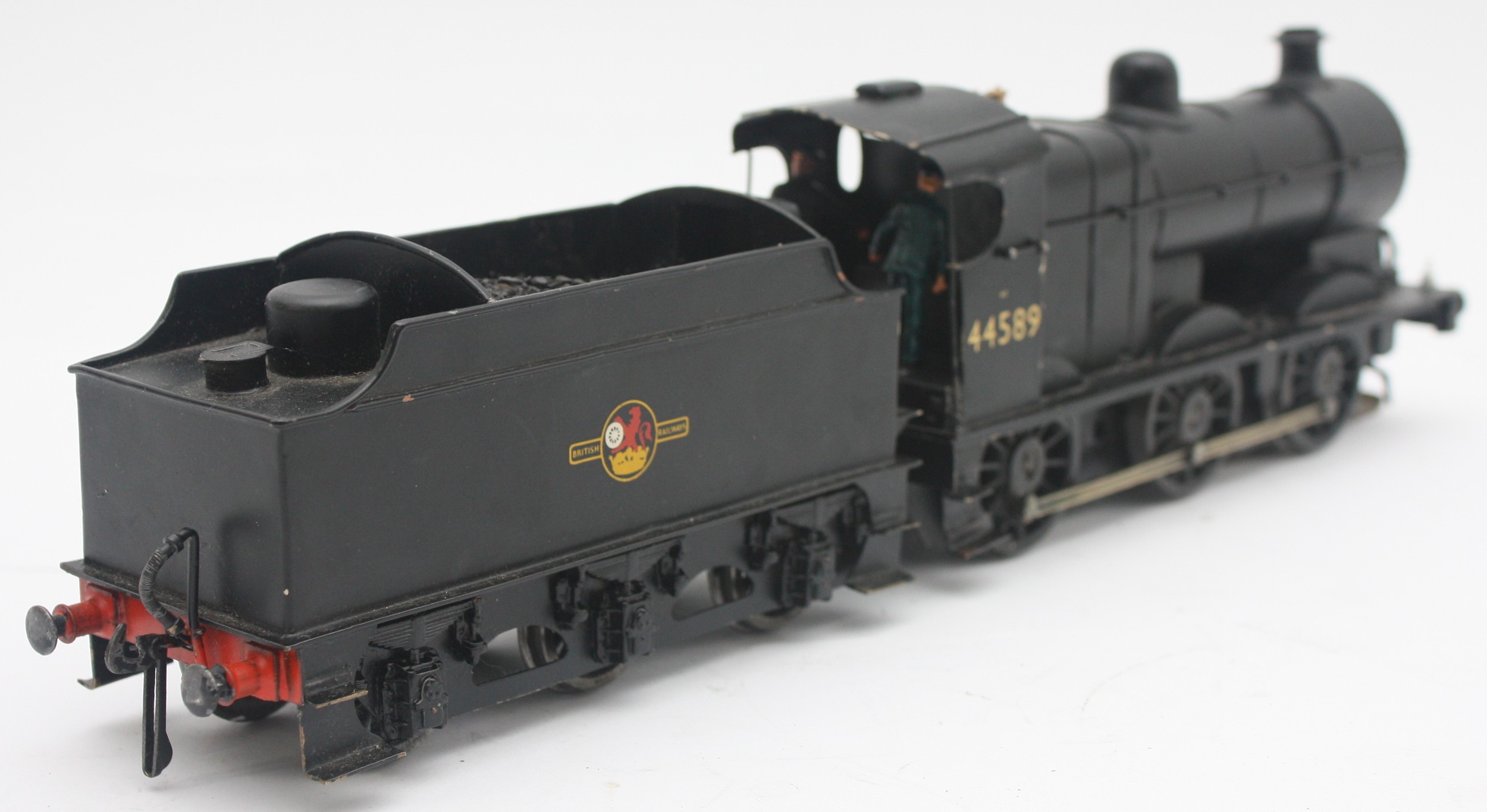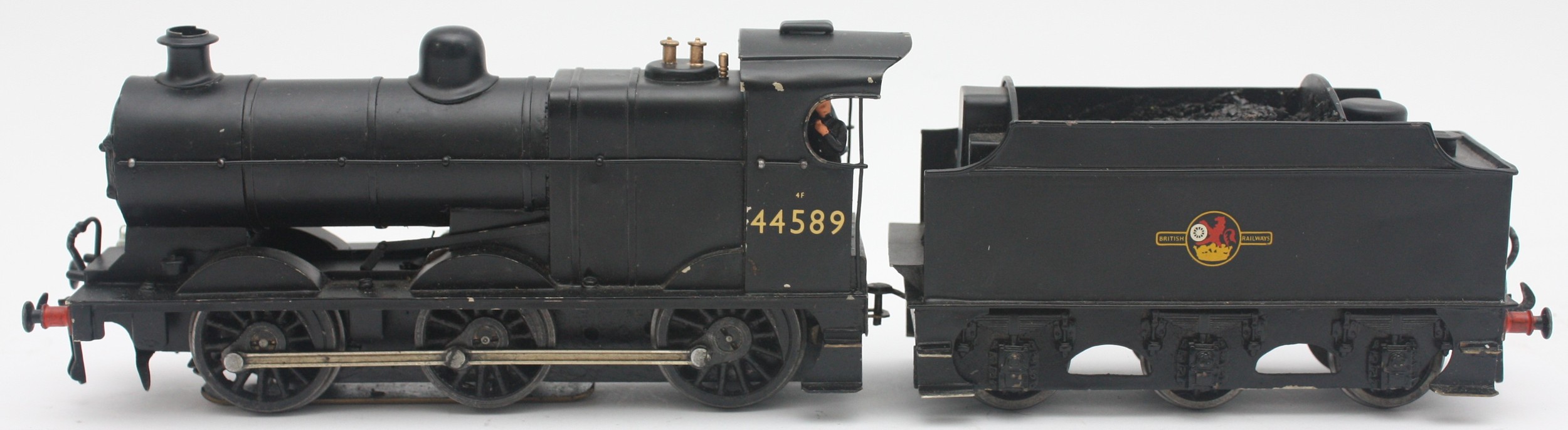 An O gauge L.M.S black 4F class locomotive/tender No 44589, fitted with skate pick up for 3rd rail drive and corse scale wheels