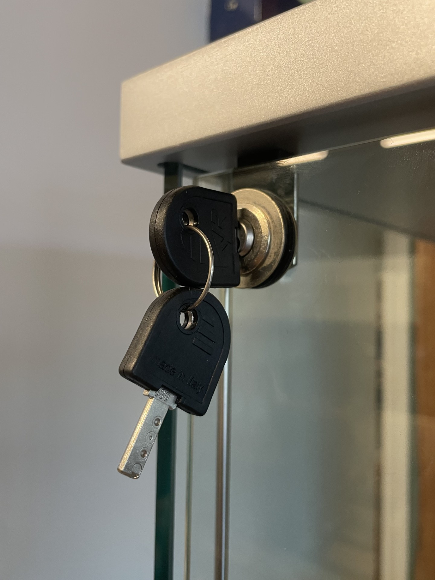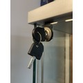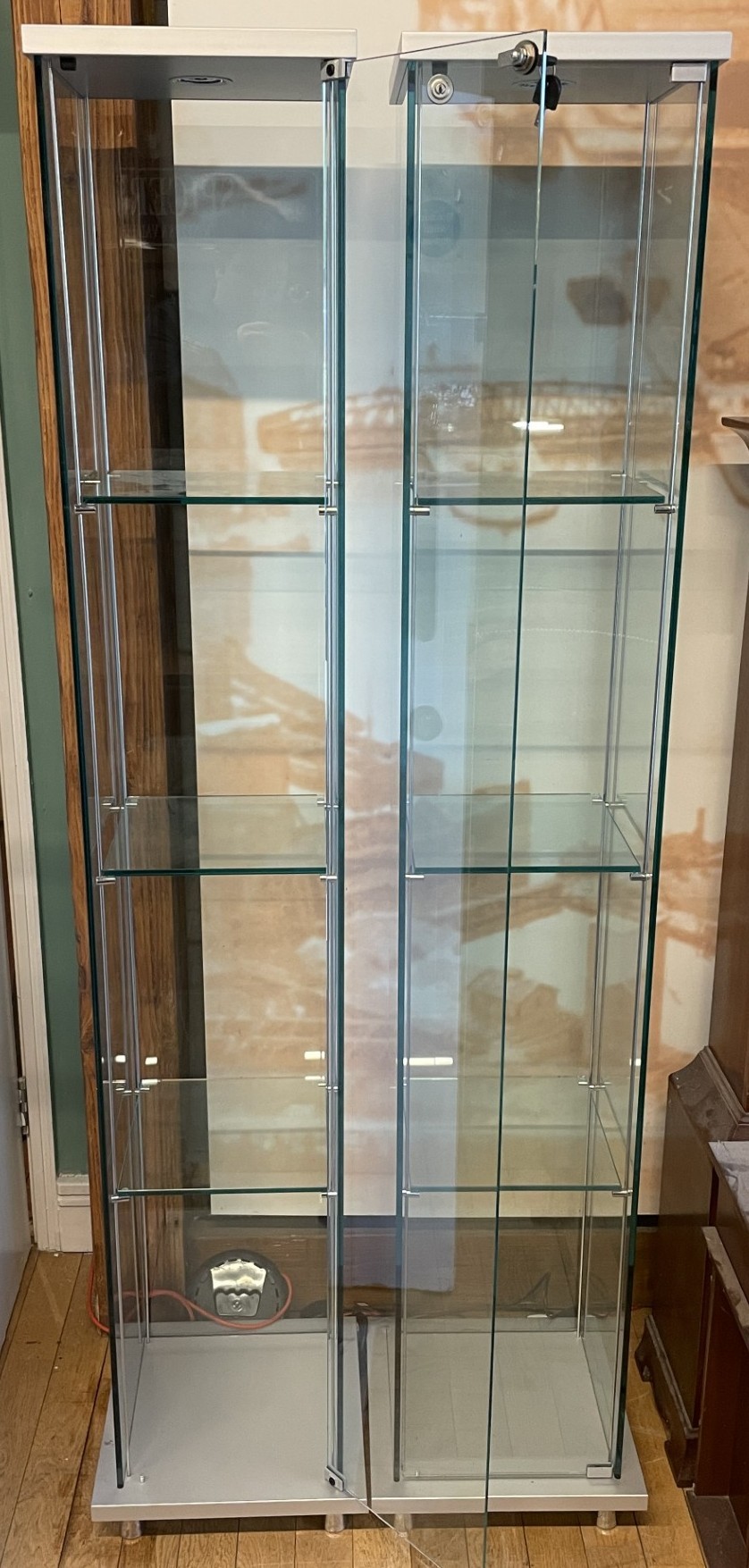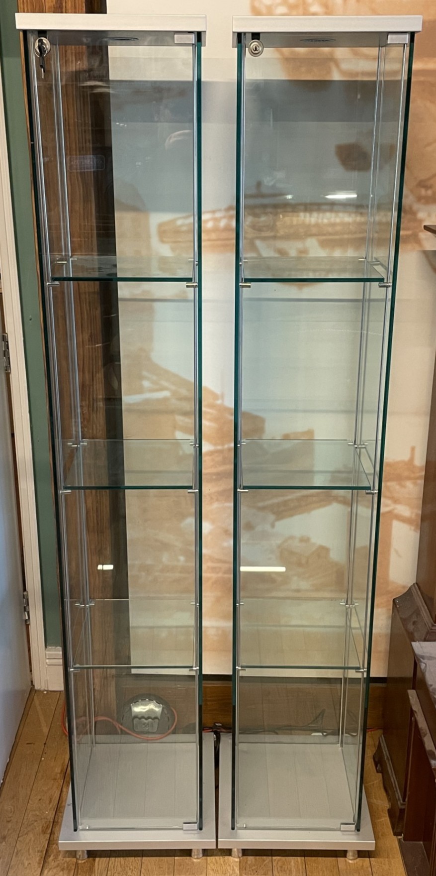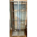 A pair of modern freestanding slimline glazed display cabinets, illuminated with three adjustable glass shelves, having lock & key, H178, W31, D32cm. (2)