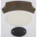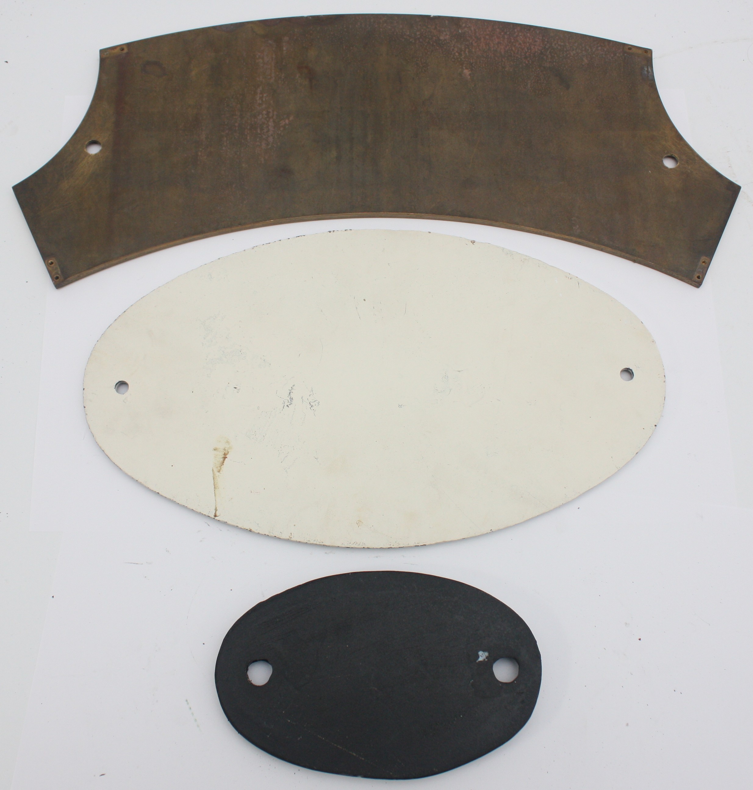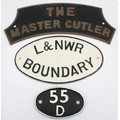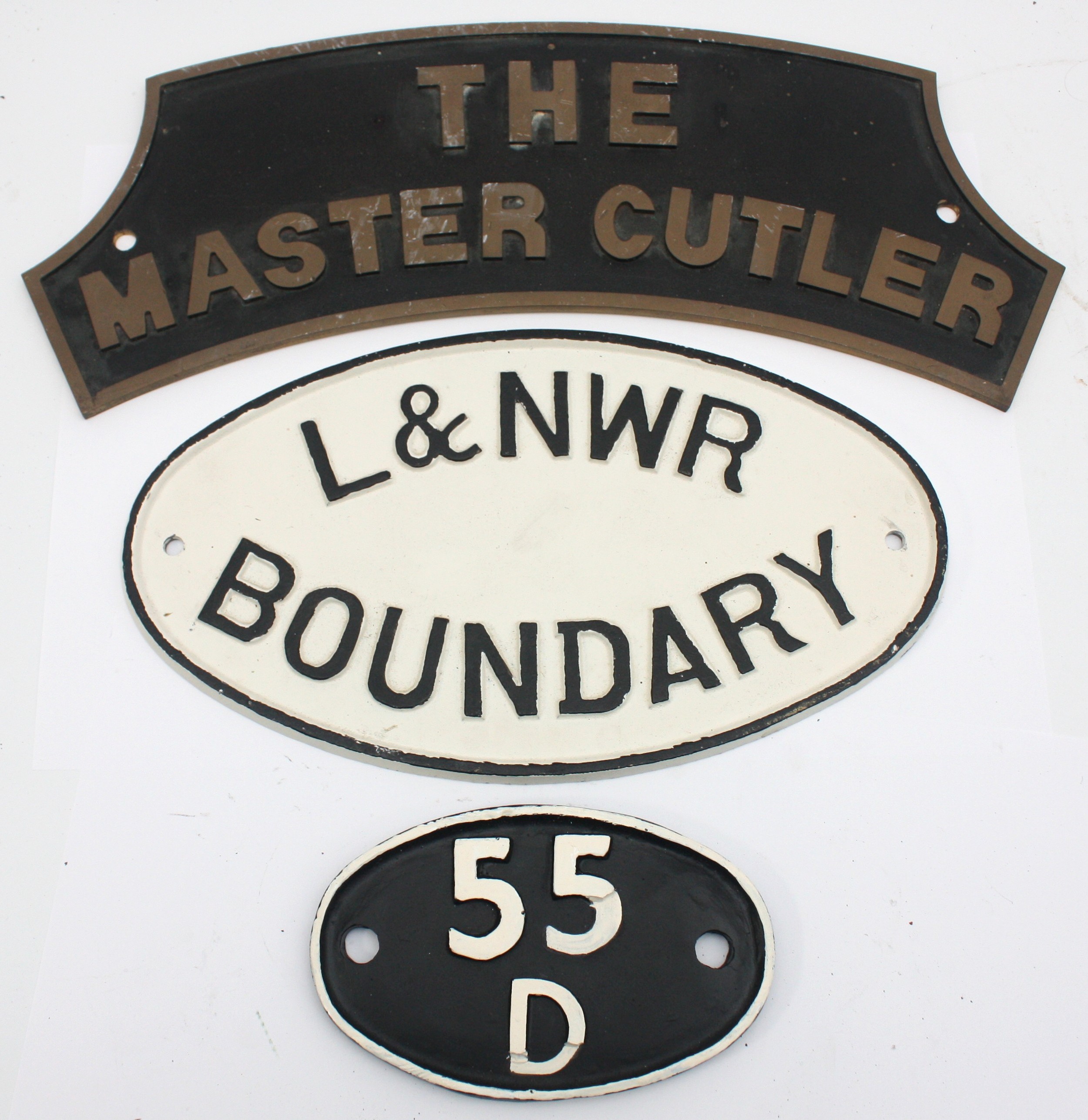 Three sundry replica railway items- brass locomotive headboard "The Master Cutler" (47.5cm x 16cm) ,an oval metal "L. & N.W.R. Boundary" sign, and a wooden shed plate 55D, largest measuring 48cm x 60.