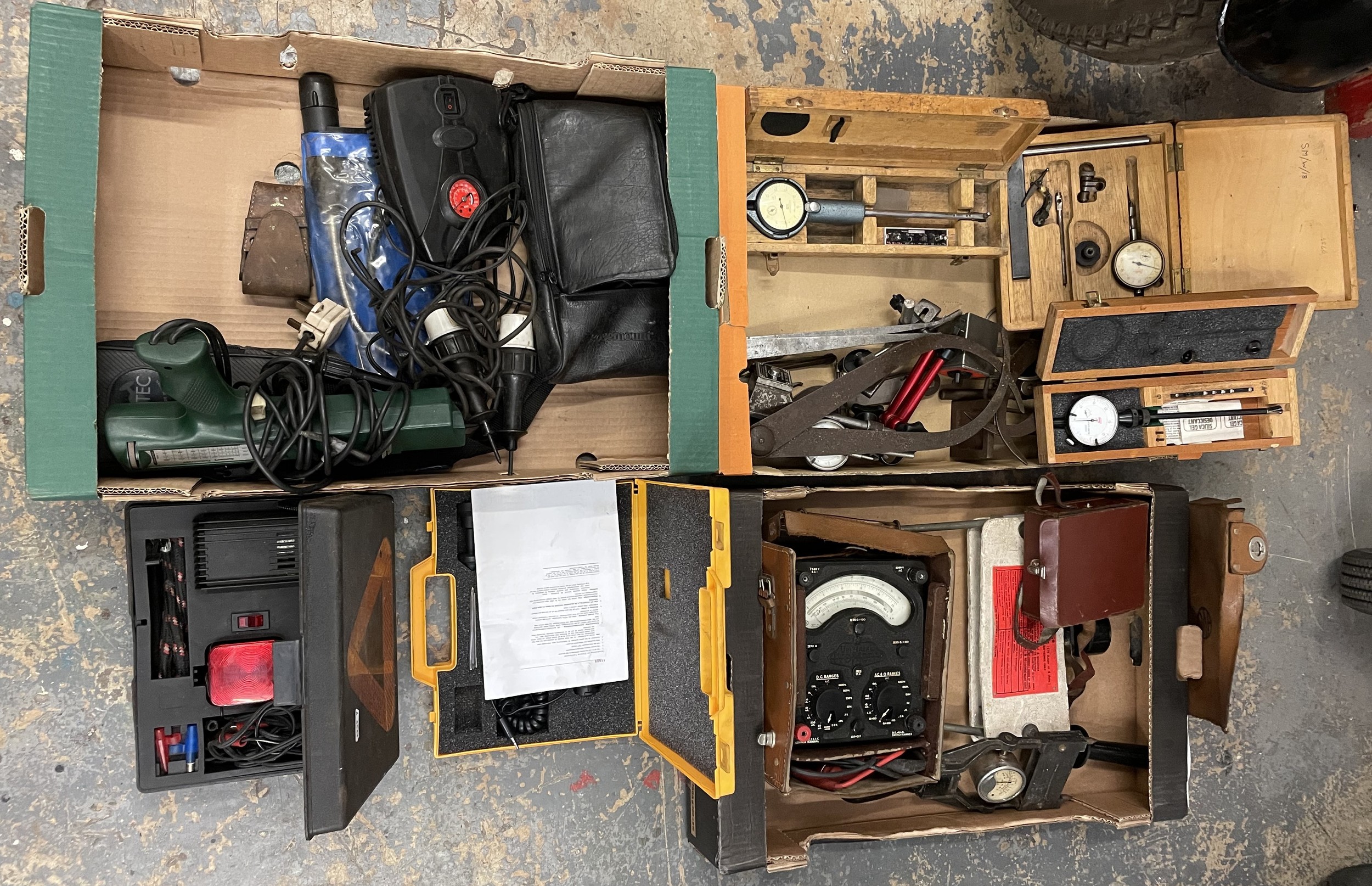 Three boxes of testing, measuring and marking tools, to include, an avometer, battery testers, calipers, dividers, and marking gauges. (3)