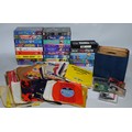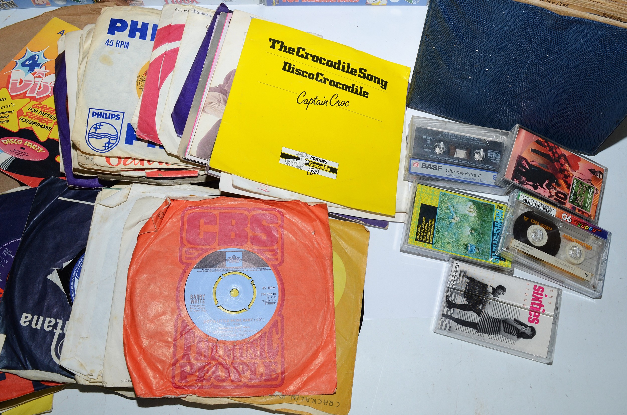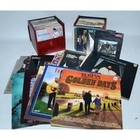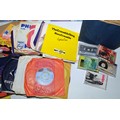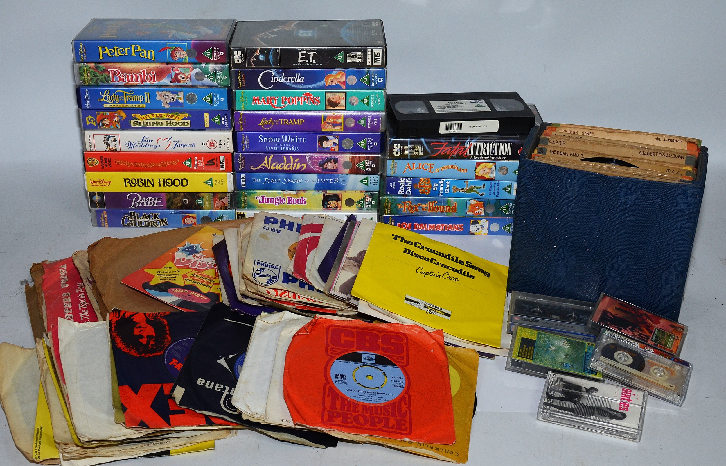 A box of VHS tapes primarily Walt Disney films together with a box of vinyl singles and 78's. (2 boxes)