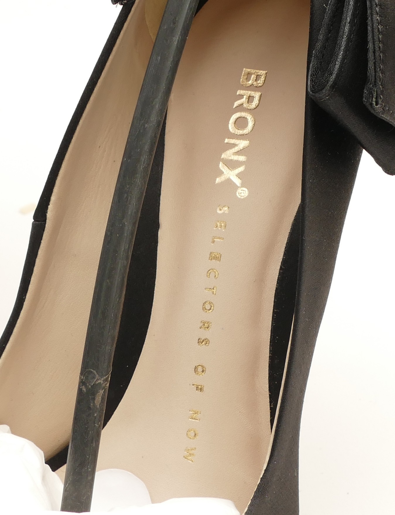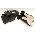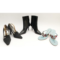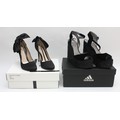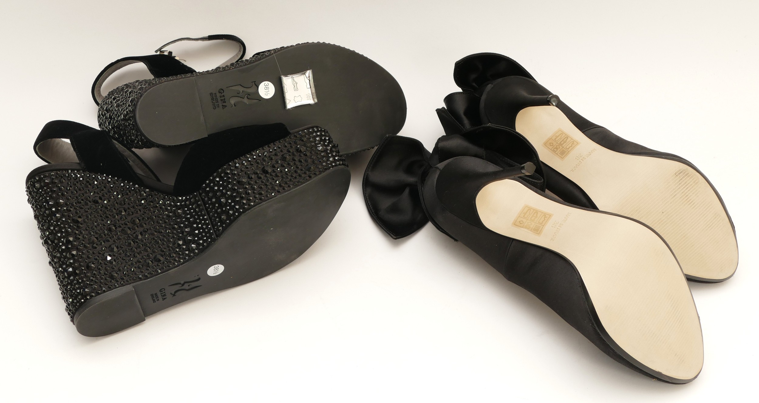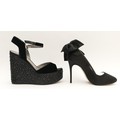 Gina- Black velvet wedge sandals with black gem covered platform, heel 5", platform 1.5", unworn, size 38.5. Together with a pair of Bronx black satin court shoes with satin bow detail, heel 4" stiletto, new in box, size 38. (2 pairs in the lot)