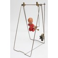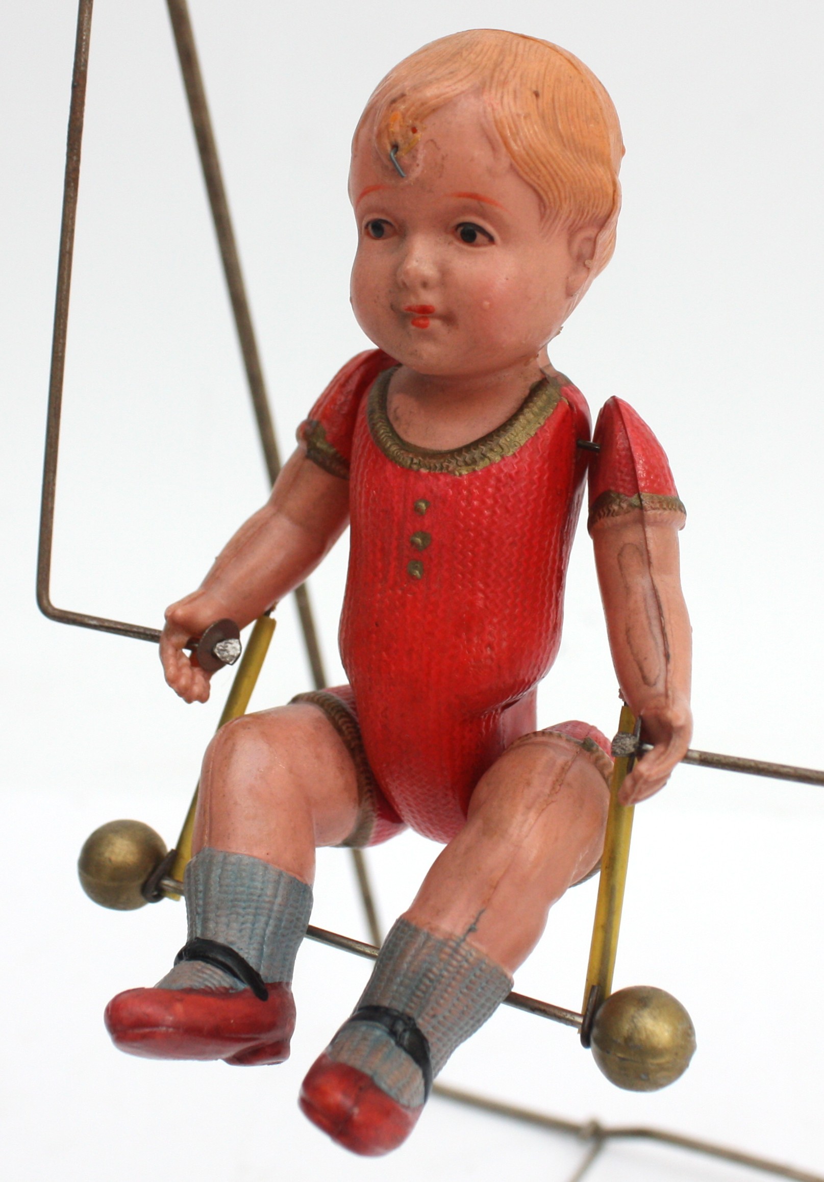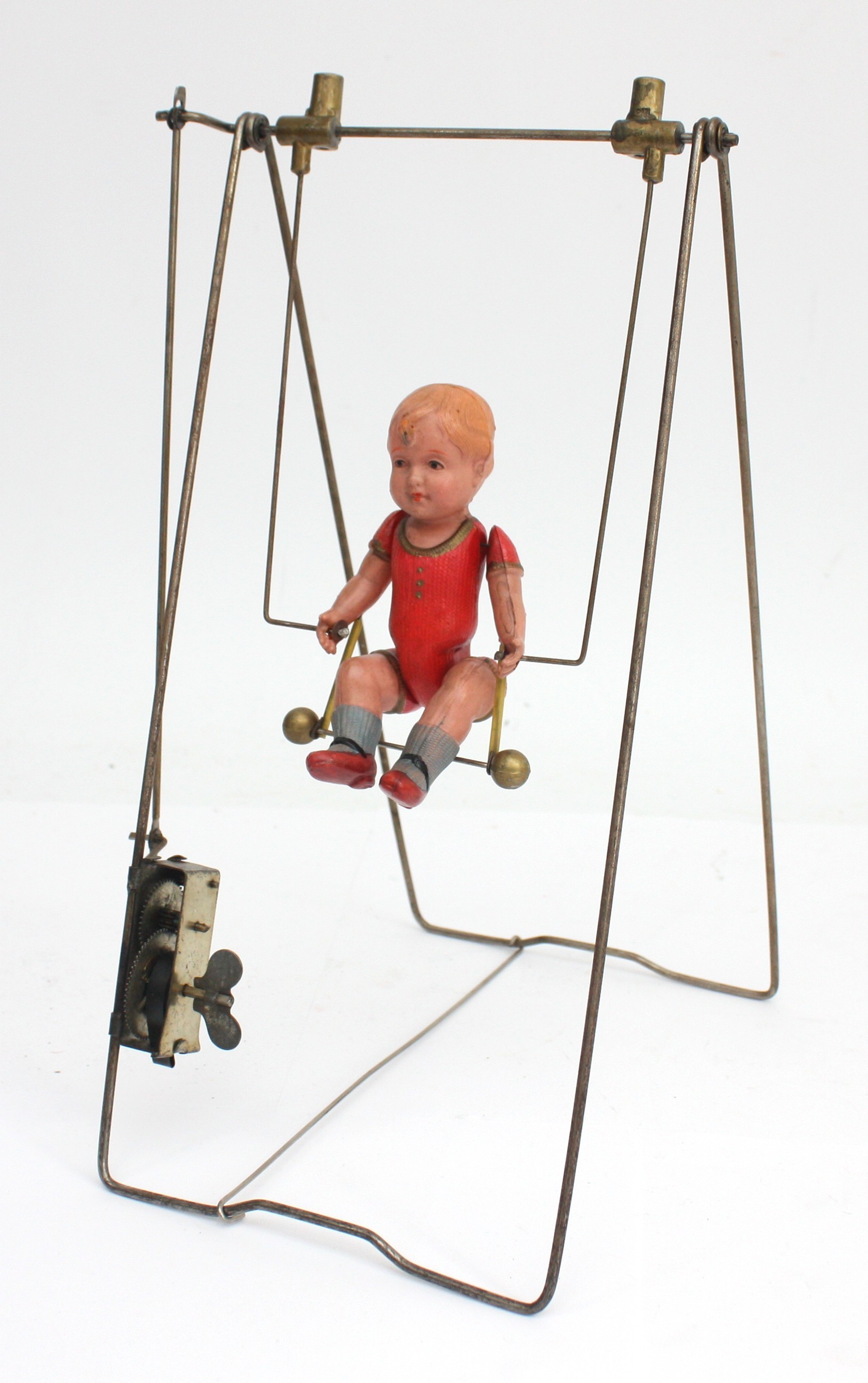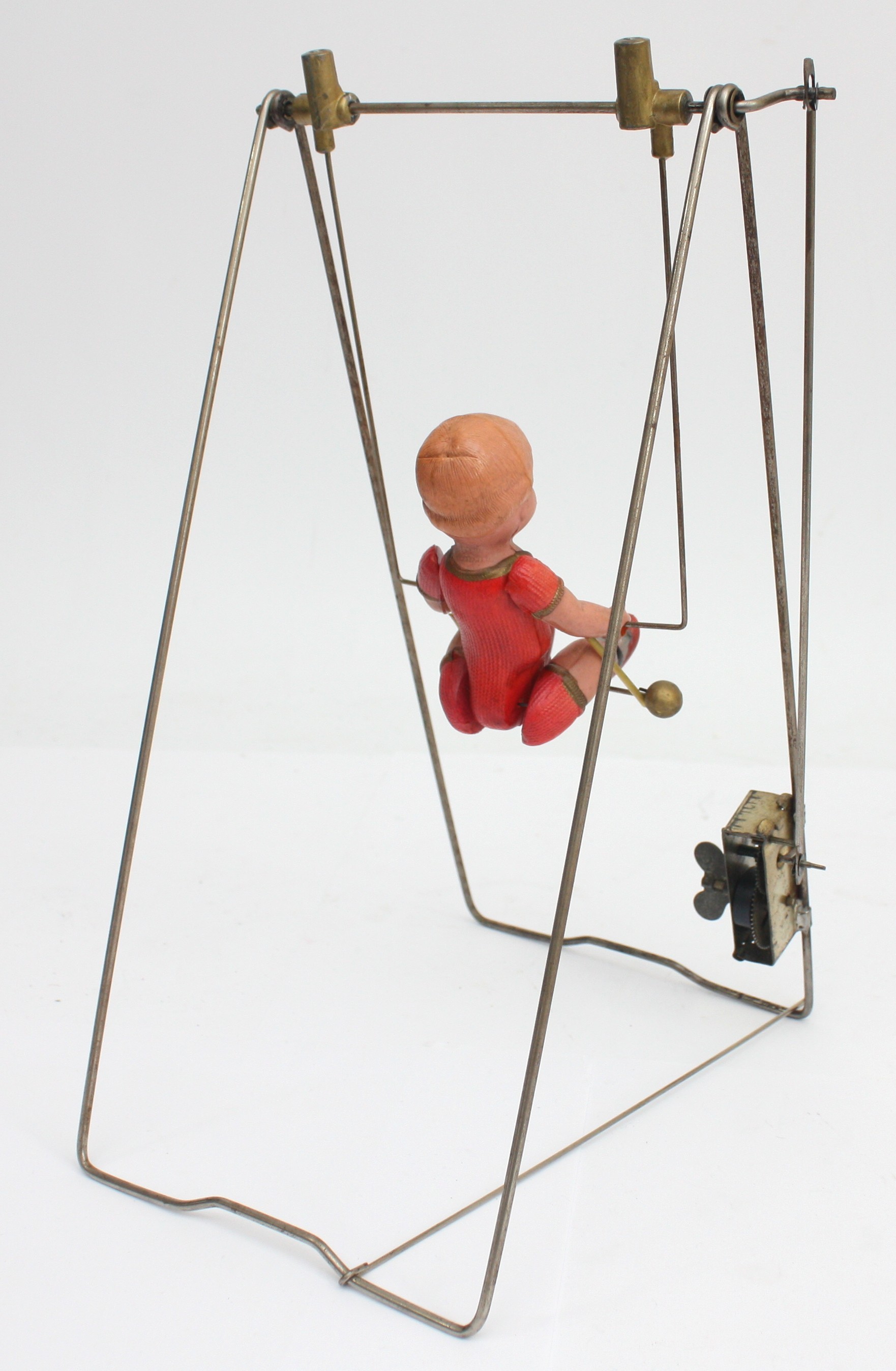 Jinsey Shinan (Japan) clockwork toy model of a painted celluloid doll on a wind-up acrobatic swing mechanism, working with key present.